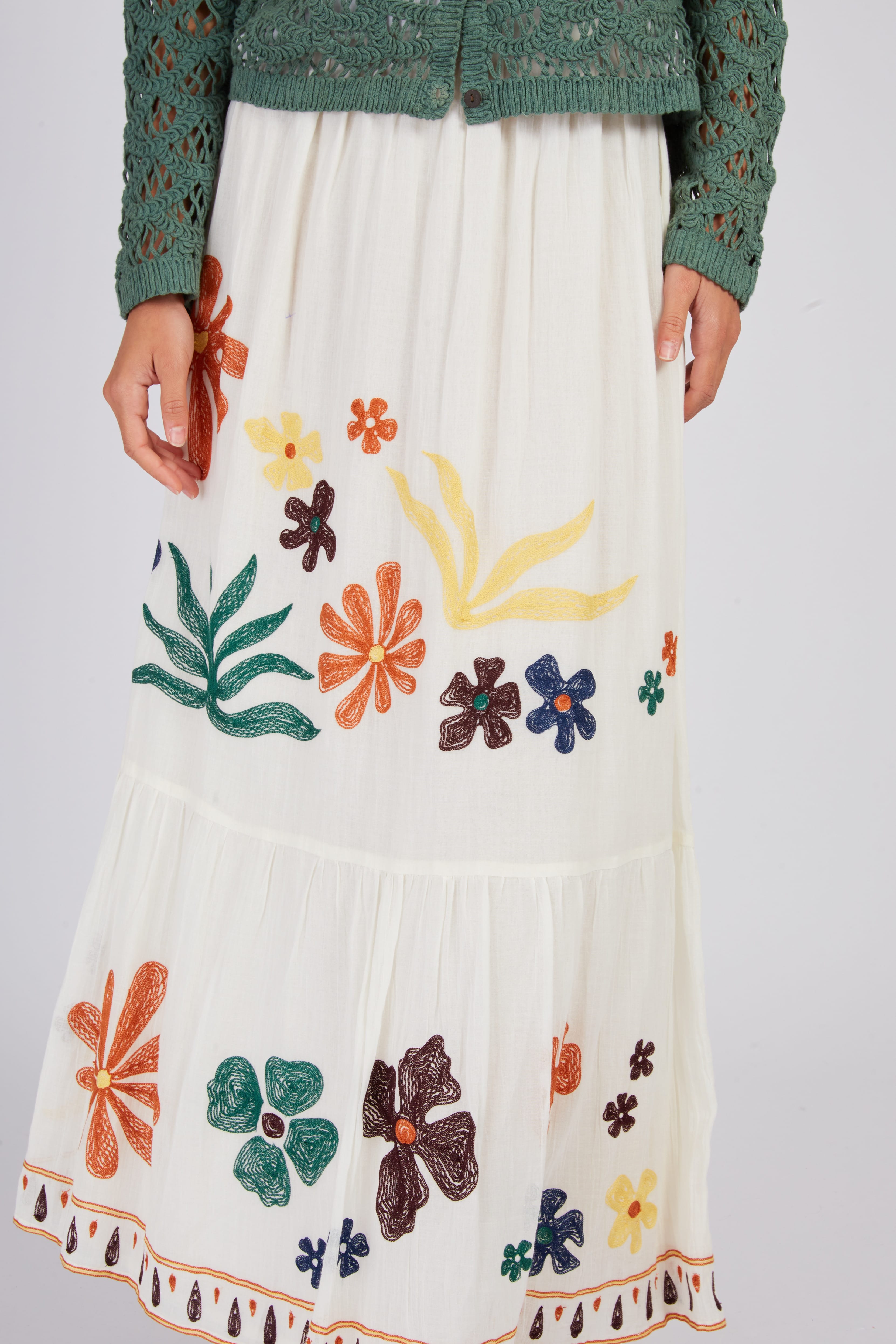 Long bohemian skirt. Loose, flowing cut that falls to the ankles. Elasticated high waist. Multicolored embroidered floral pattern throughout. Flared ruffle at the bottom of the skirt for added movement.