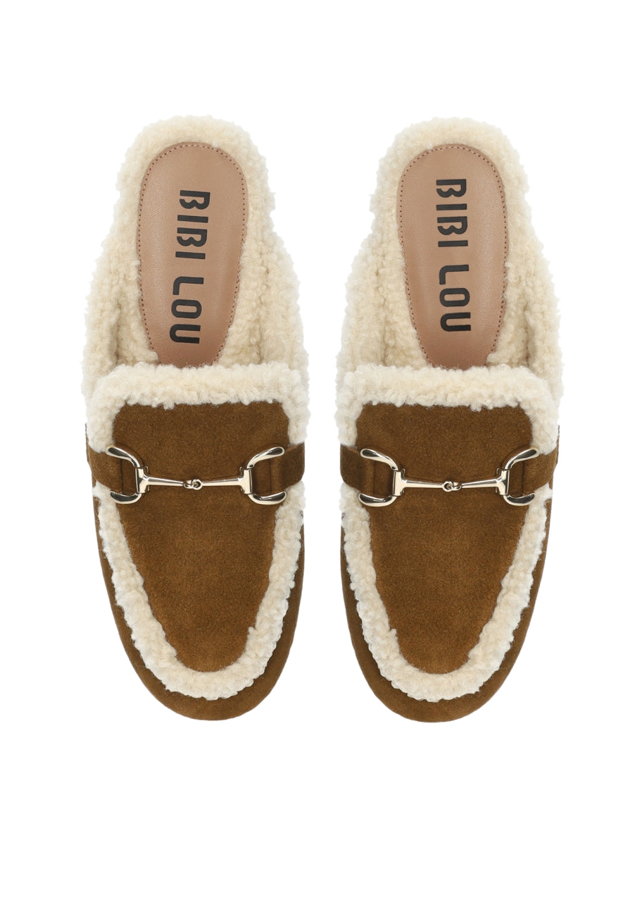 AW25 Bibi Lou women's suede loafers. Ashe Mules 15 model with a round toe, hardware, and a 1.5cm flat heel.