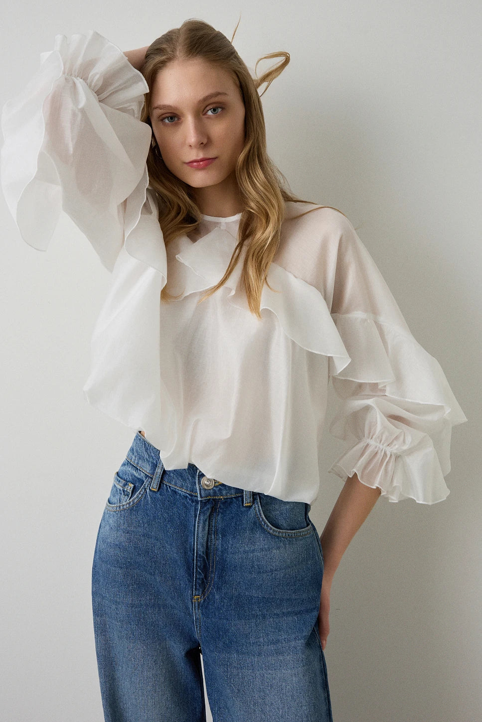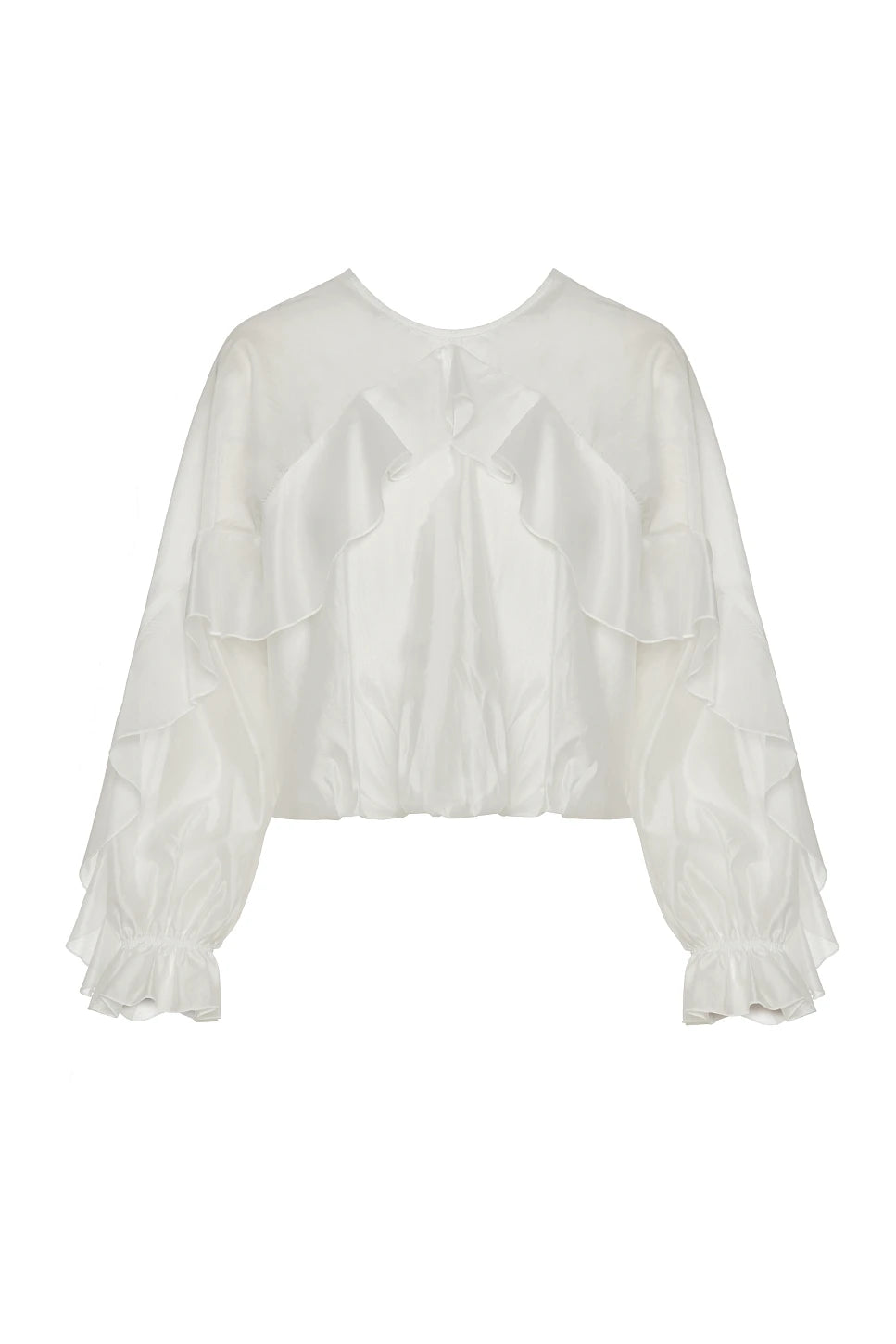 Balloon blouse, with long sleeves, with ruffles, round neckline, elasticated cuffs, with keyhole self-tie on the back, semi-sheer, soft touch, regular fit