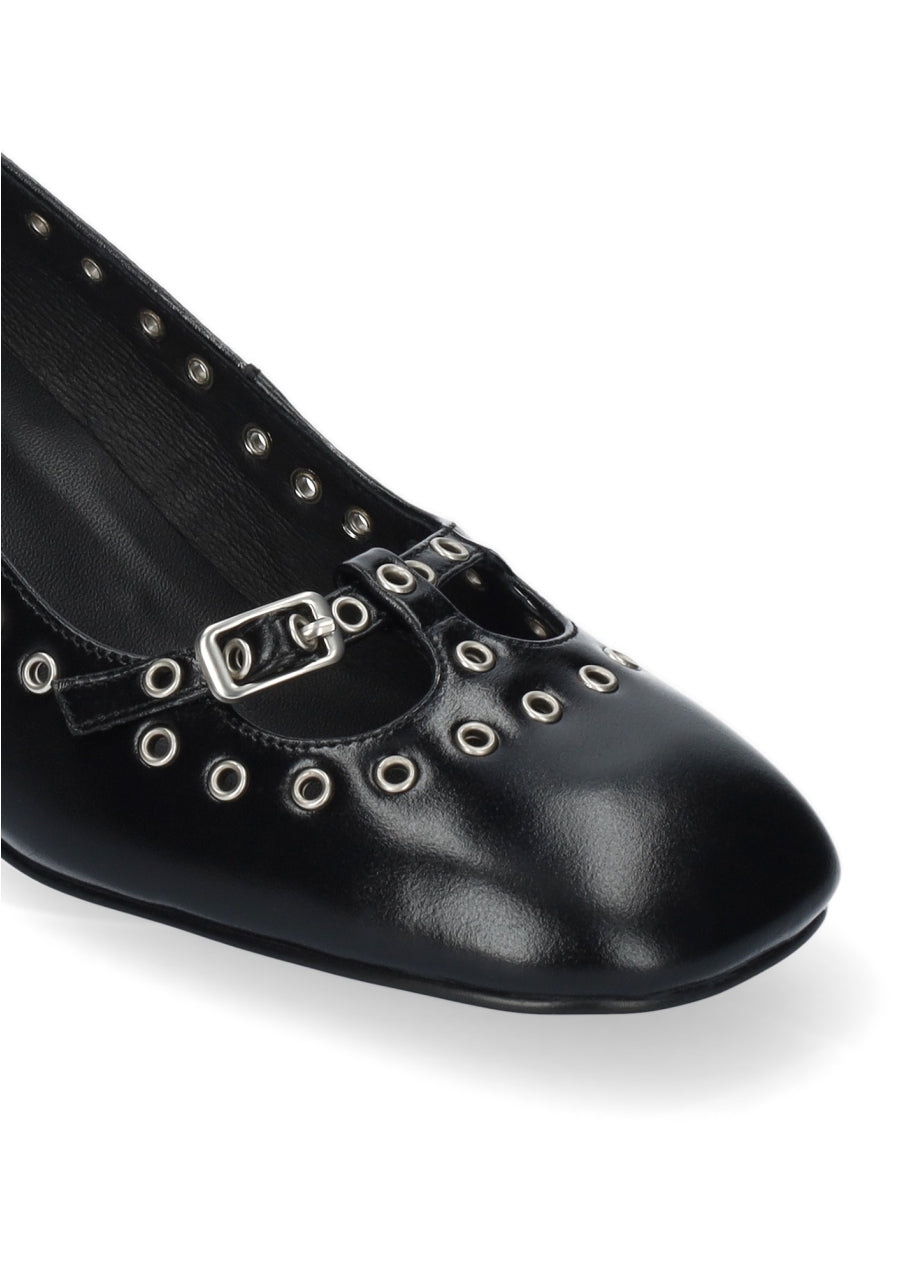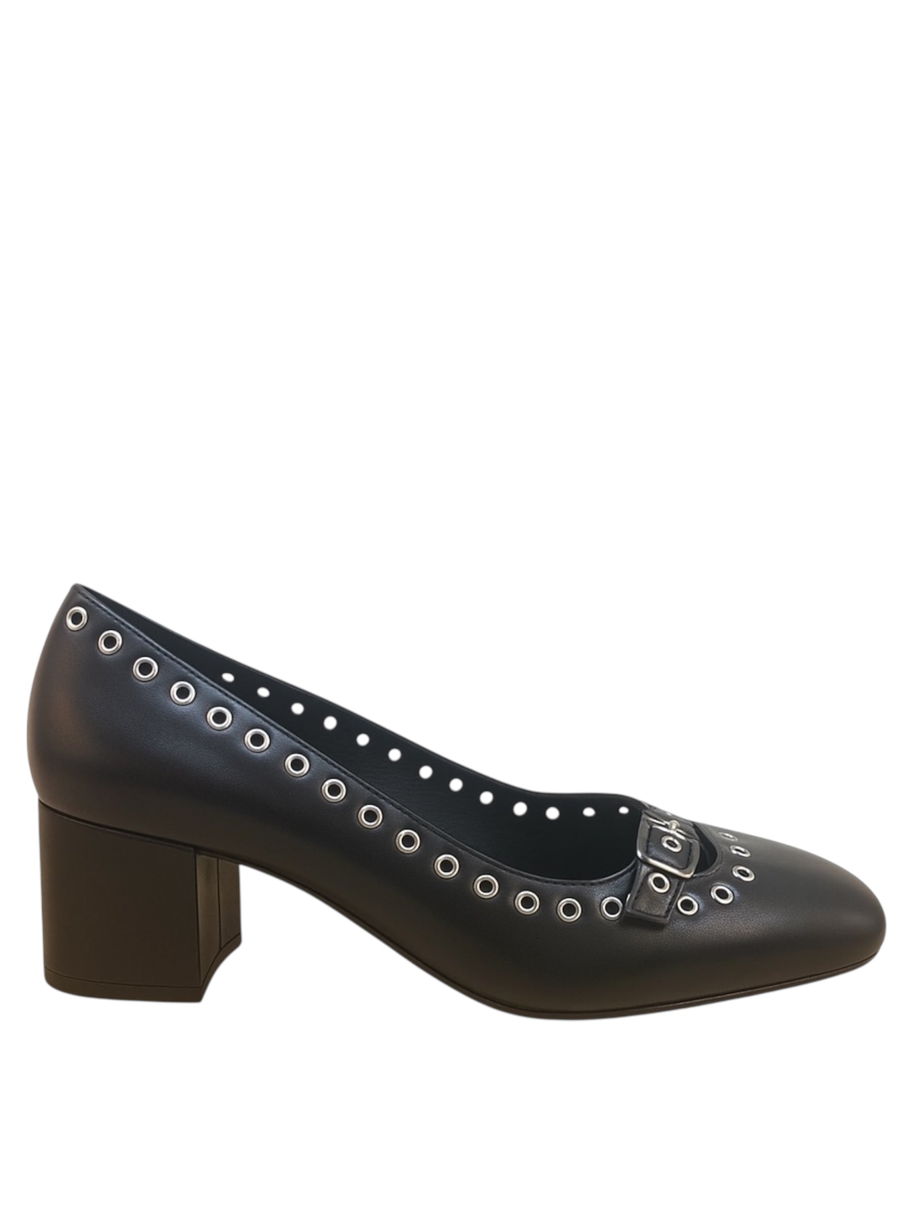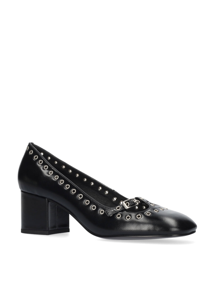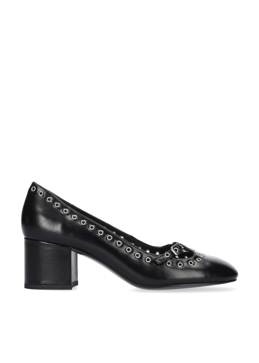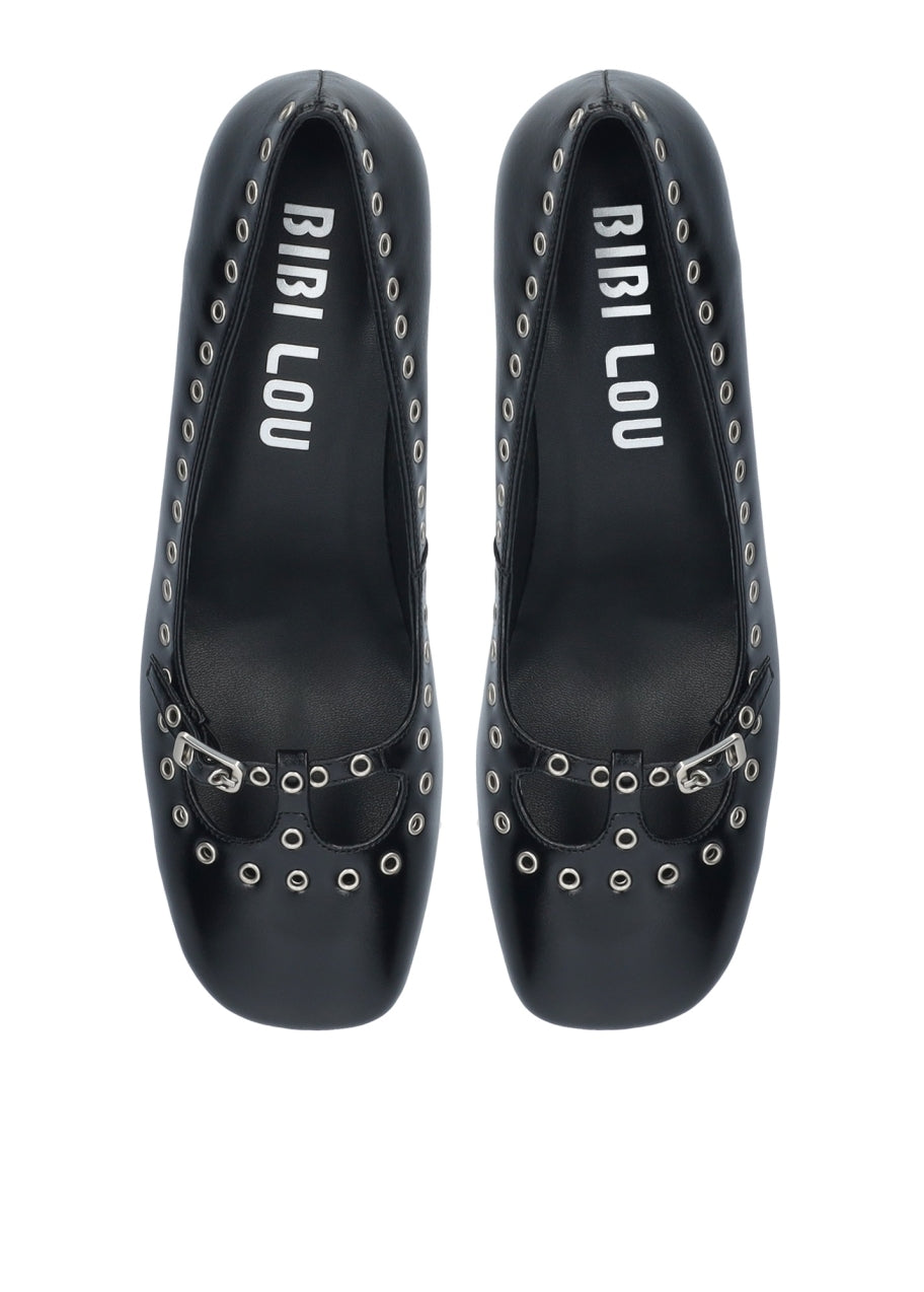 AW25 Bibi Lou women's black leather pumps. Tuscano Pumps 60 model features a round toe, decorative studs, and a 6 cm block heel.