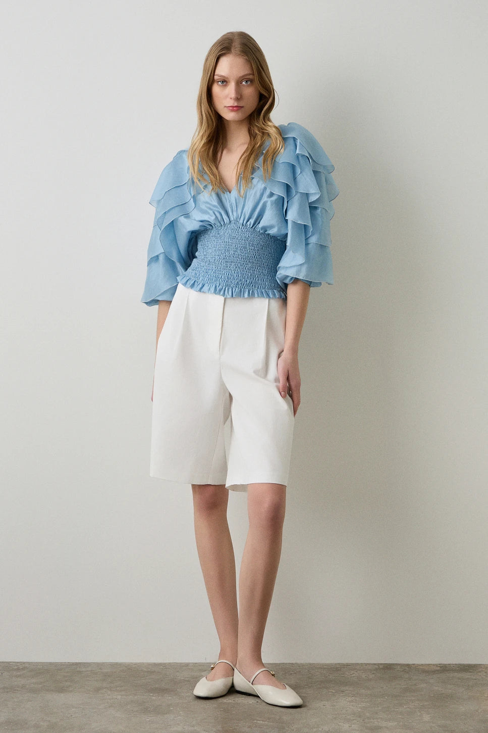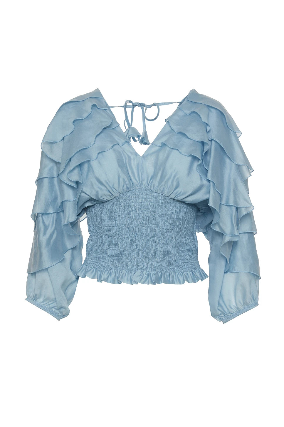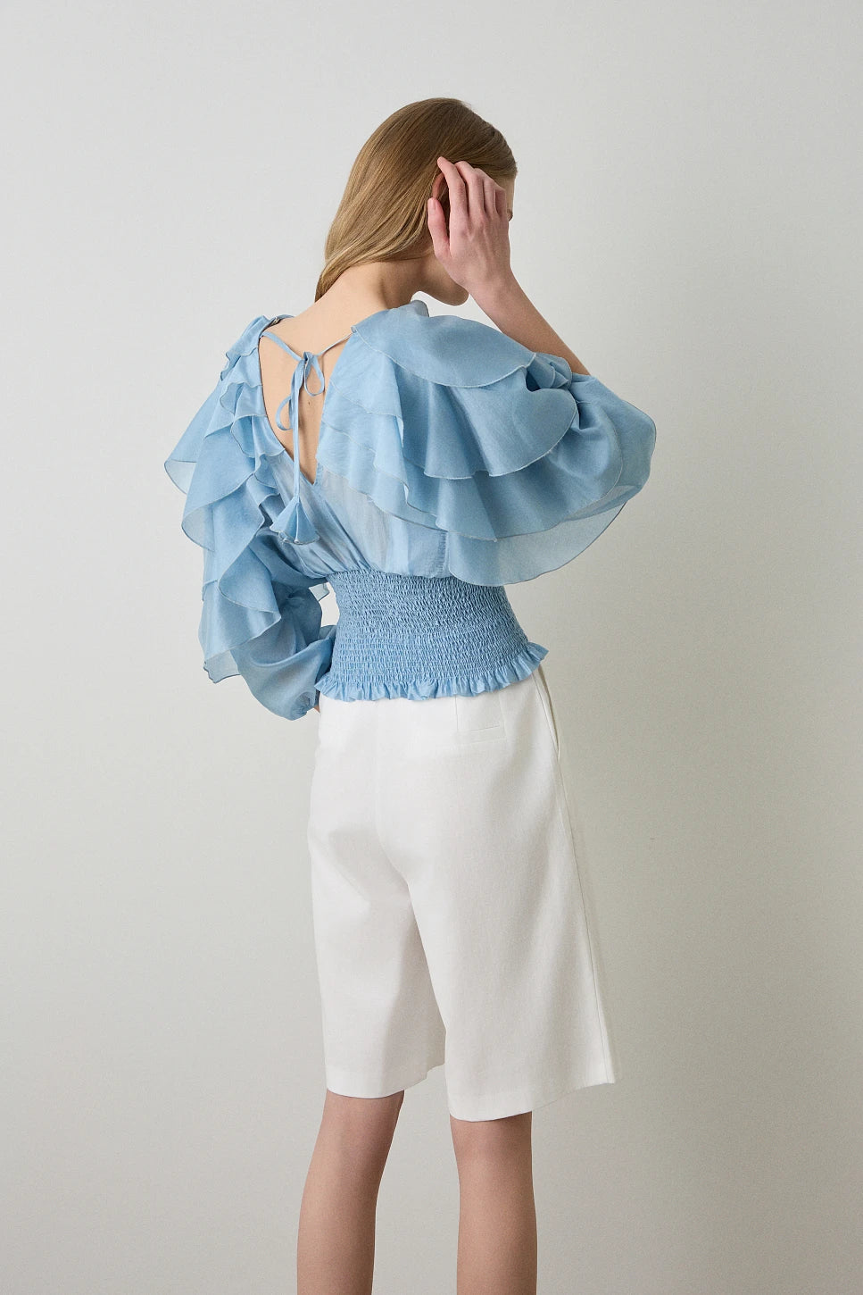 Blouse, with 3/4 sleeves, with ruffles, with shirring, self-tie on the back, regular fit, soft touch