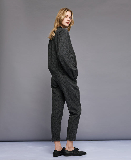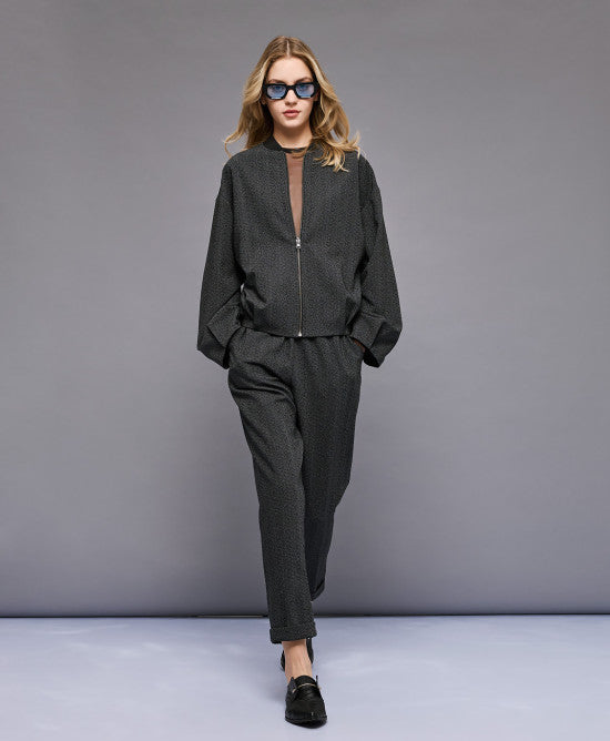 Bomber jacket with rhinestones and side pockets. Featuring an elastic ribbed collar and pleated details. Pair it with the matching pants from our collection for stylish looks.