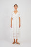 Long dress. Short puff sleeves. V-neckline. All-over openwork floral lace pattern. Delicate and ornamental embroidery details. Drawstring waist. This bohemian-chic dress combines elegance and lightness.
