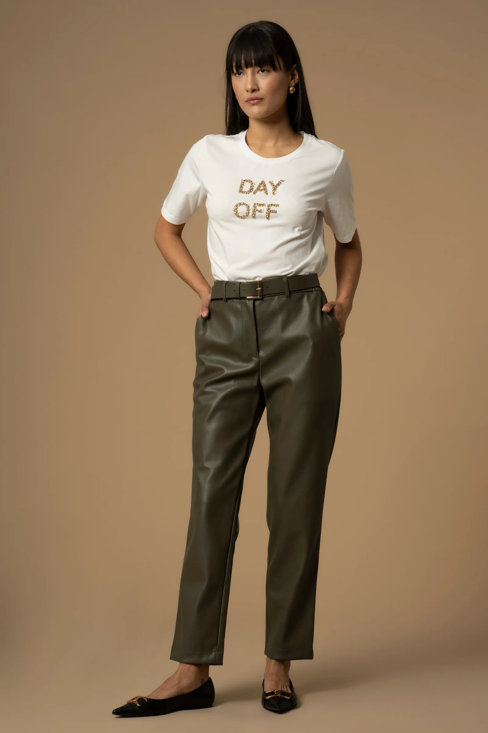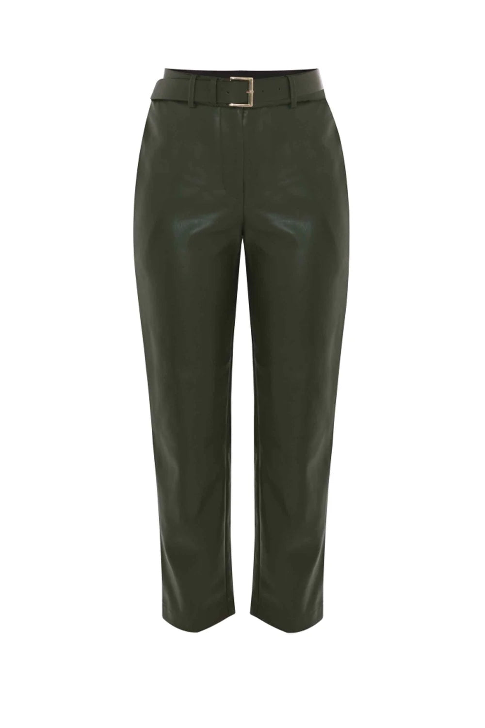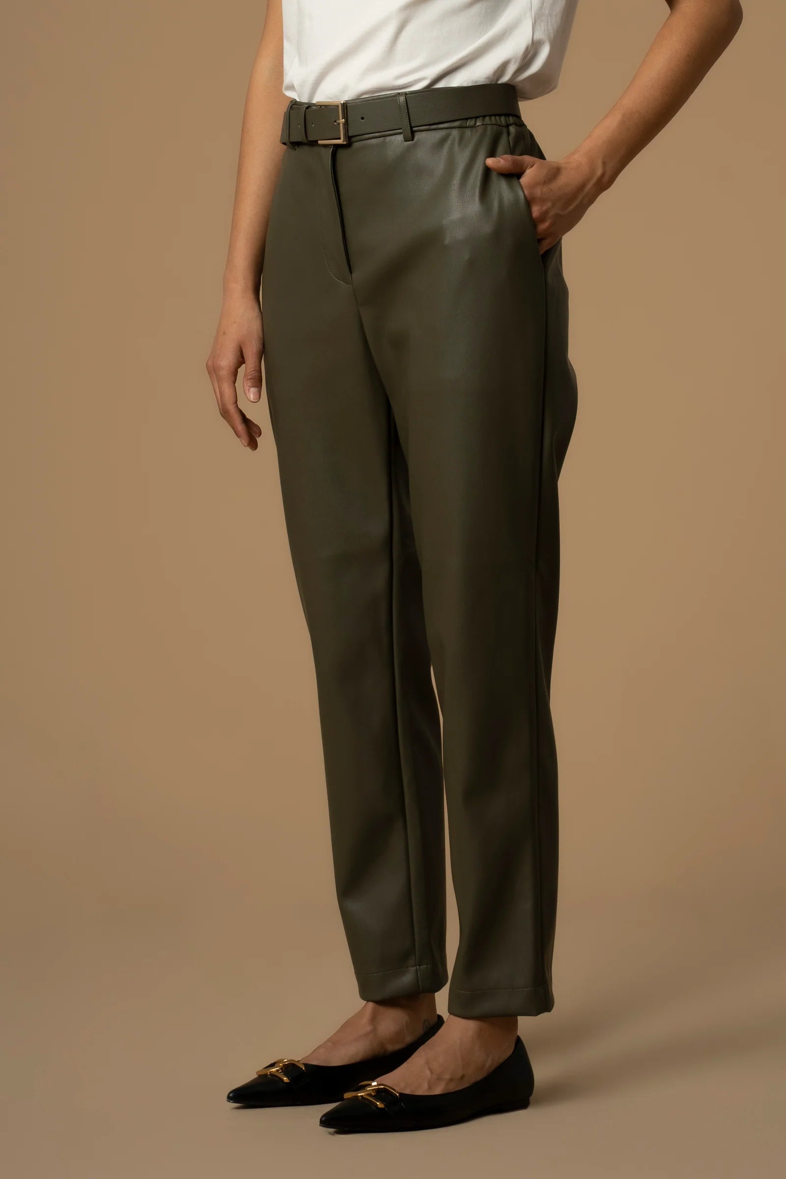 Stylish smart leather look trousers, full length, banded hems, regular fit, button closure, color coordinated buckled belt