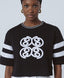 Cropped blouse with unique front embroidery. It features short sleeves with striped details and a ribbed neckline. Choose it for modern, everyday looks.
