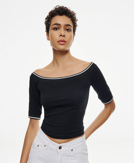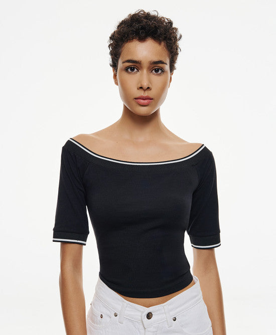 Cropped, off-the-shoulders top with ribbed striped details. Choose it for stylish casual looks.