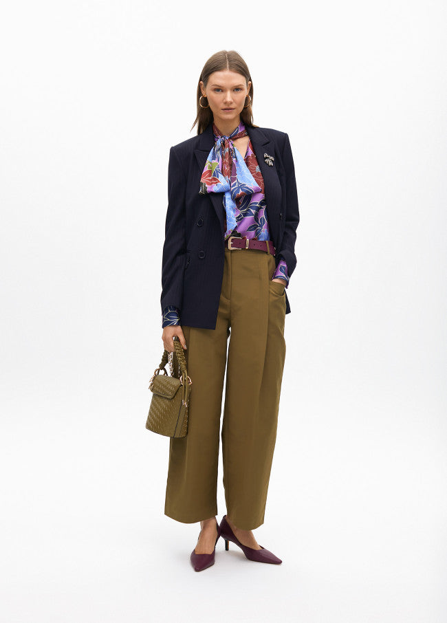 Straight cropped trousers made from soft poplin. High waist with side pockets and back patch pocket detail. Metal logo on loop.