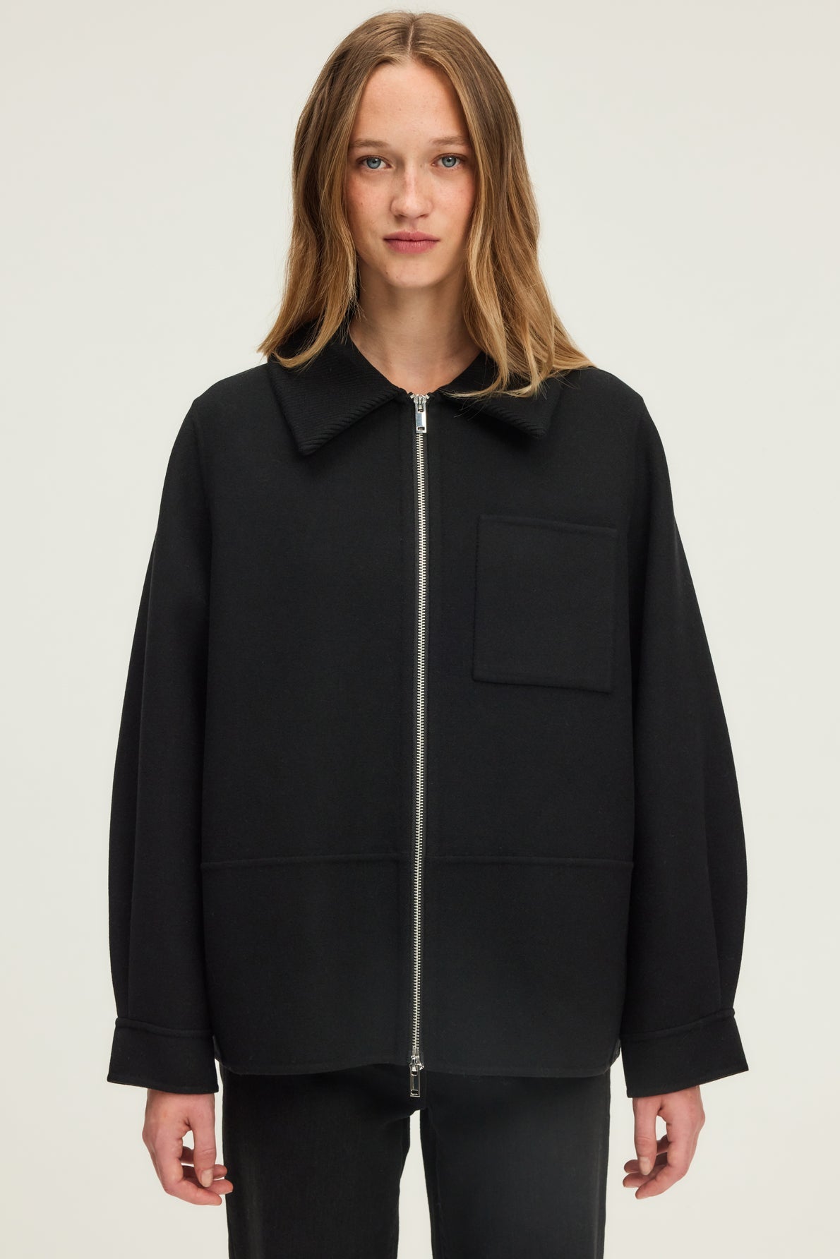 Black double-faced wool blend jacket, ideal for the start of the season. It features a zipped chest pocket and a shirt collar for a masculine yet feminine look. It pairs well with both skirts and pants.