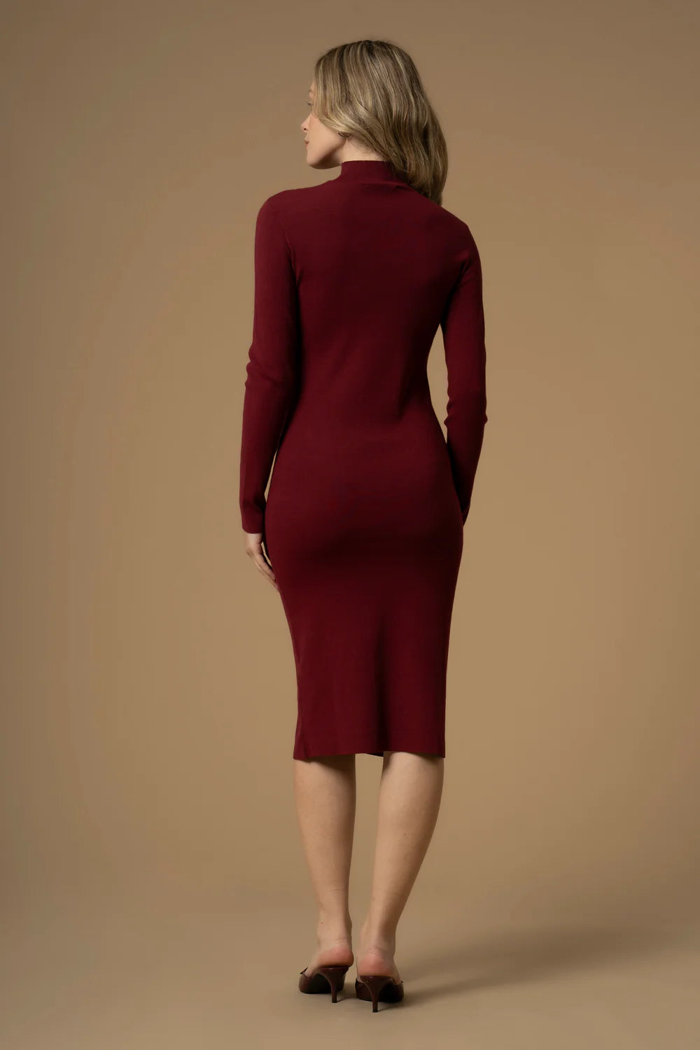 Slimline sweater dress with contoured high neck, horizontal high chest split, long sleeves, pleat detailing on snug cuffs, tailored waistline