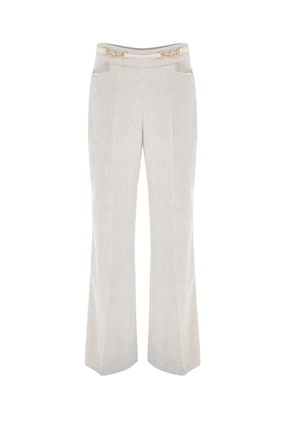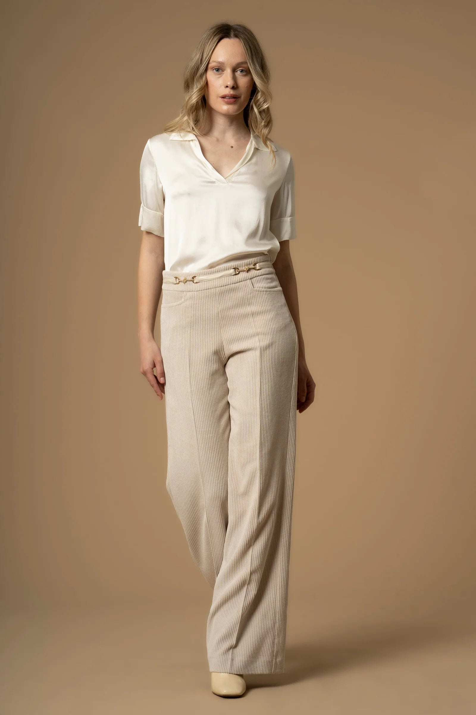 Versatile fine rib effect full length trousers, light creases, flared ankles, lace belt with ornate chain linkage, discreet front pockets