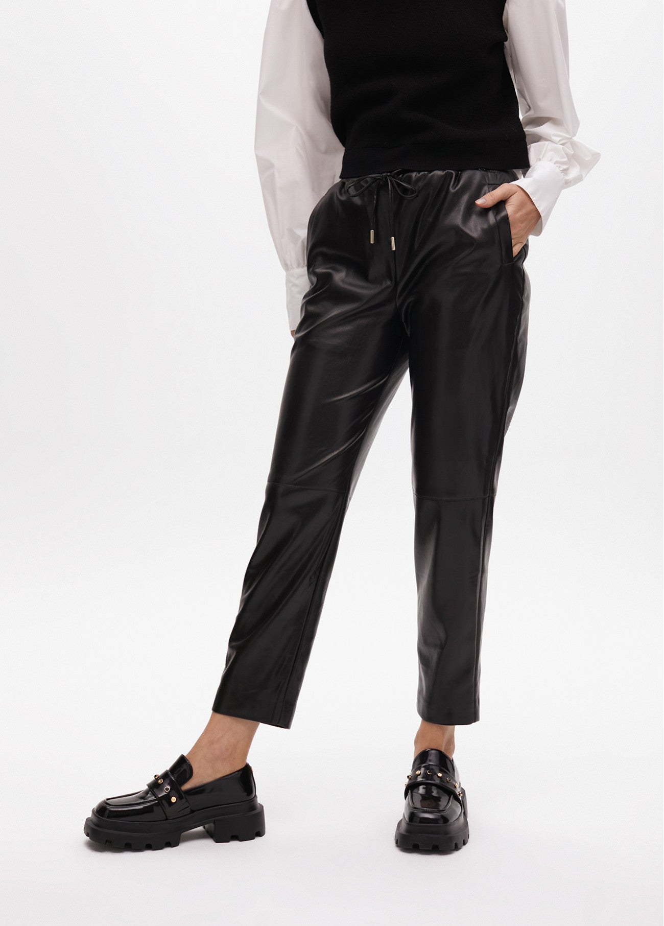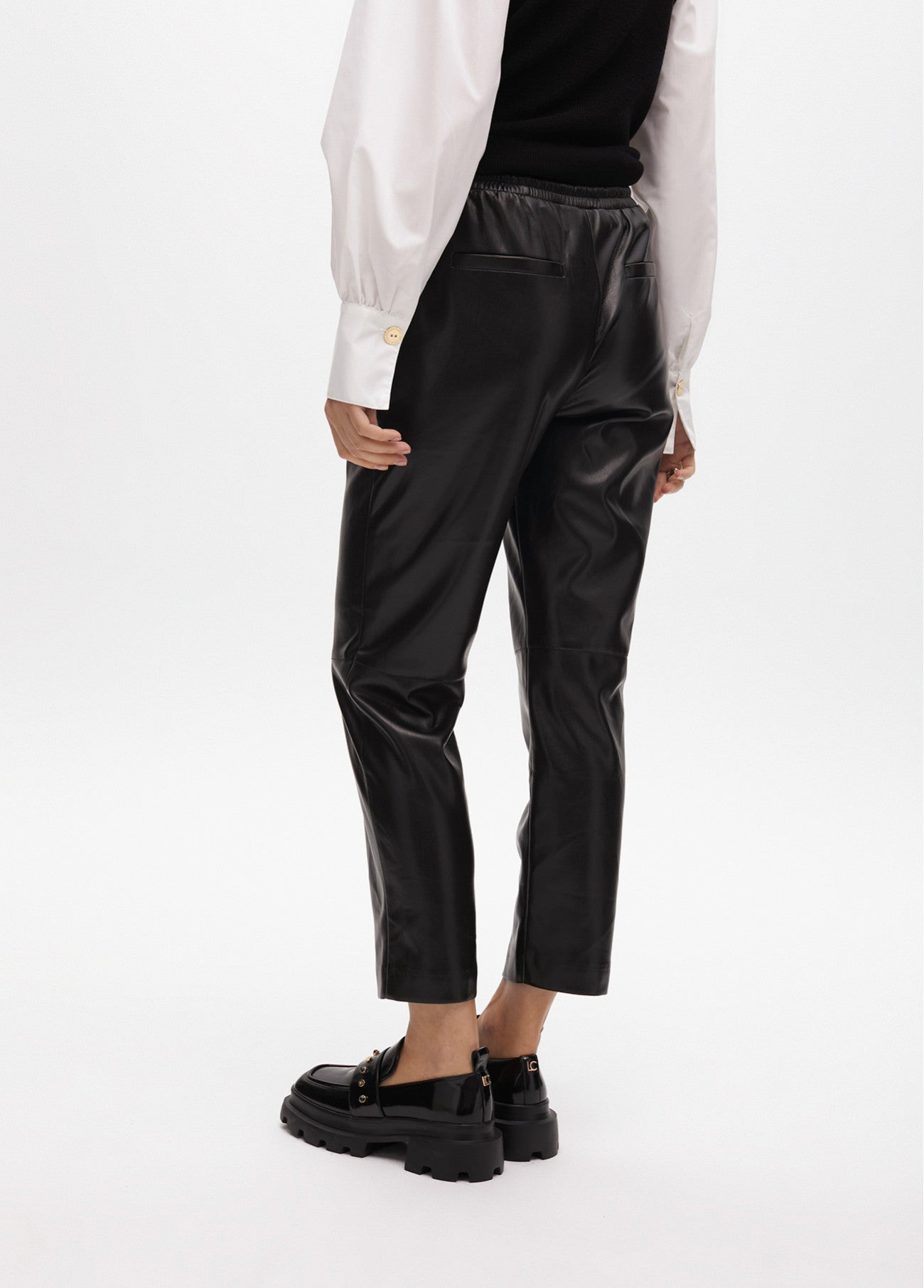 Jogger pants crafted from faux leather material. Vibrant red design with adjustable elastic waist and side pockets. Metallic detail on waist.