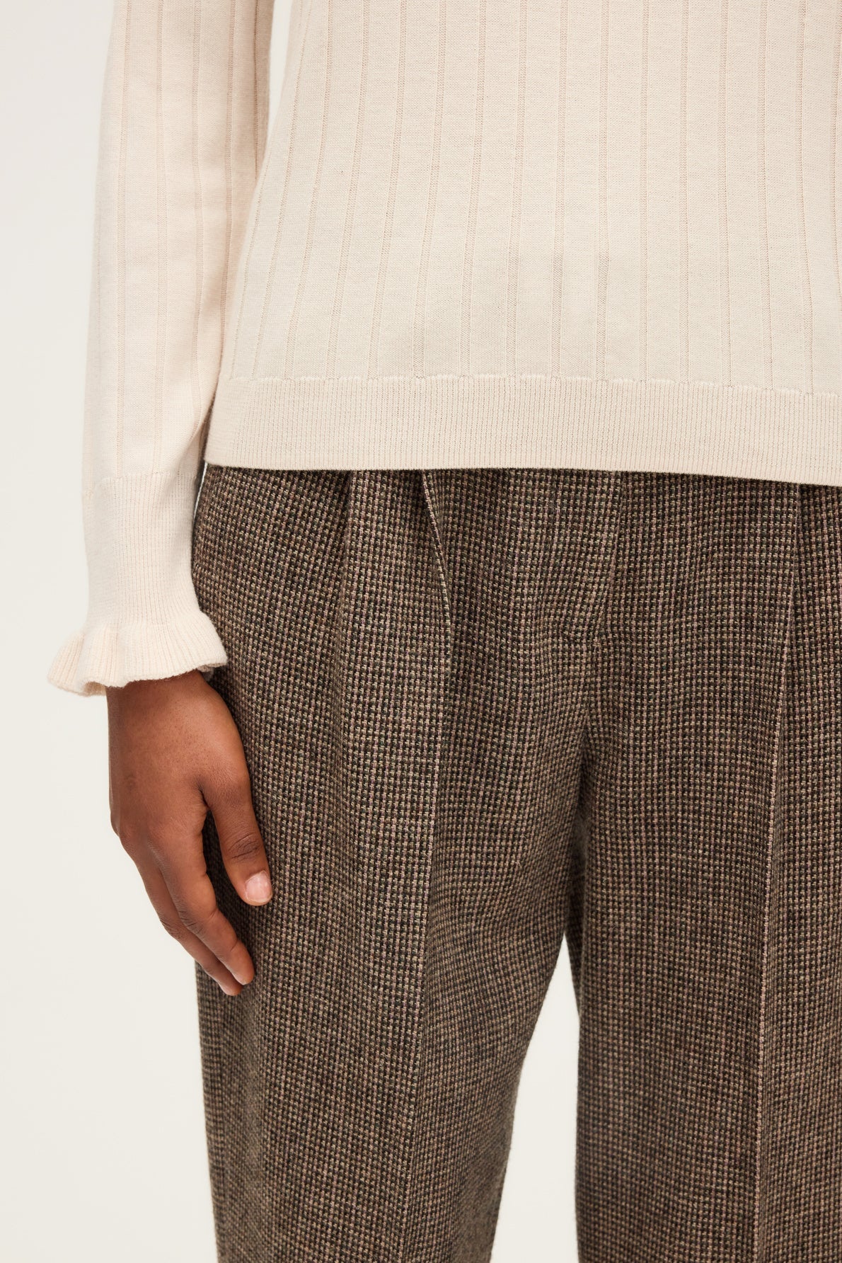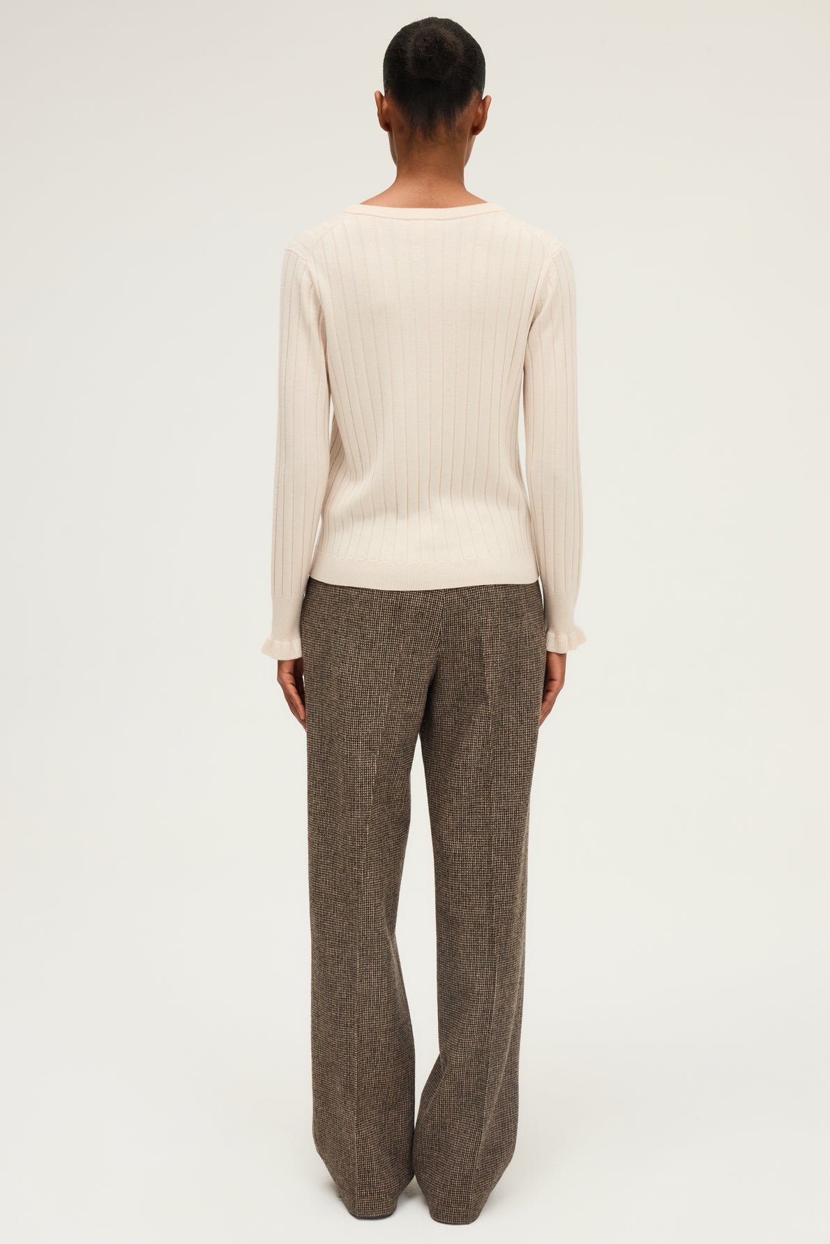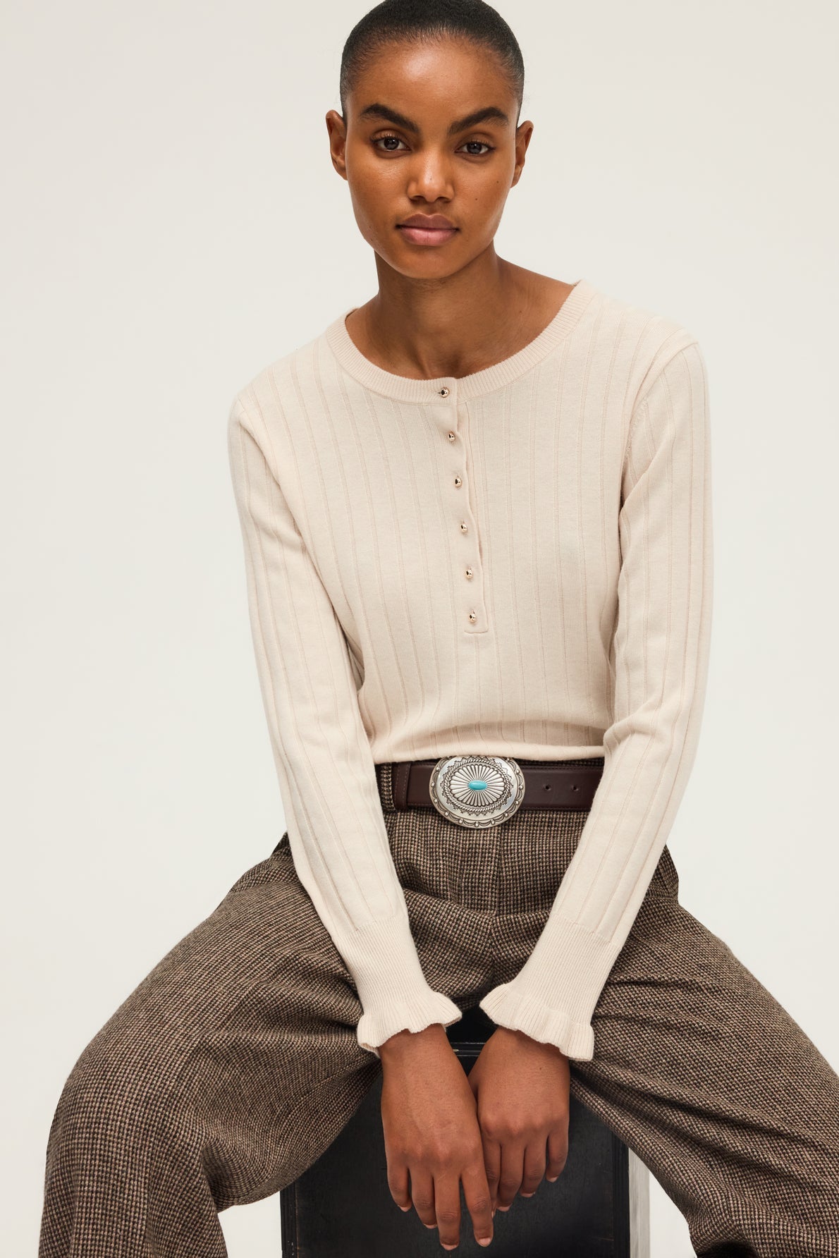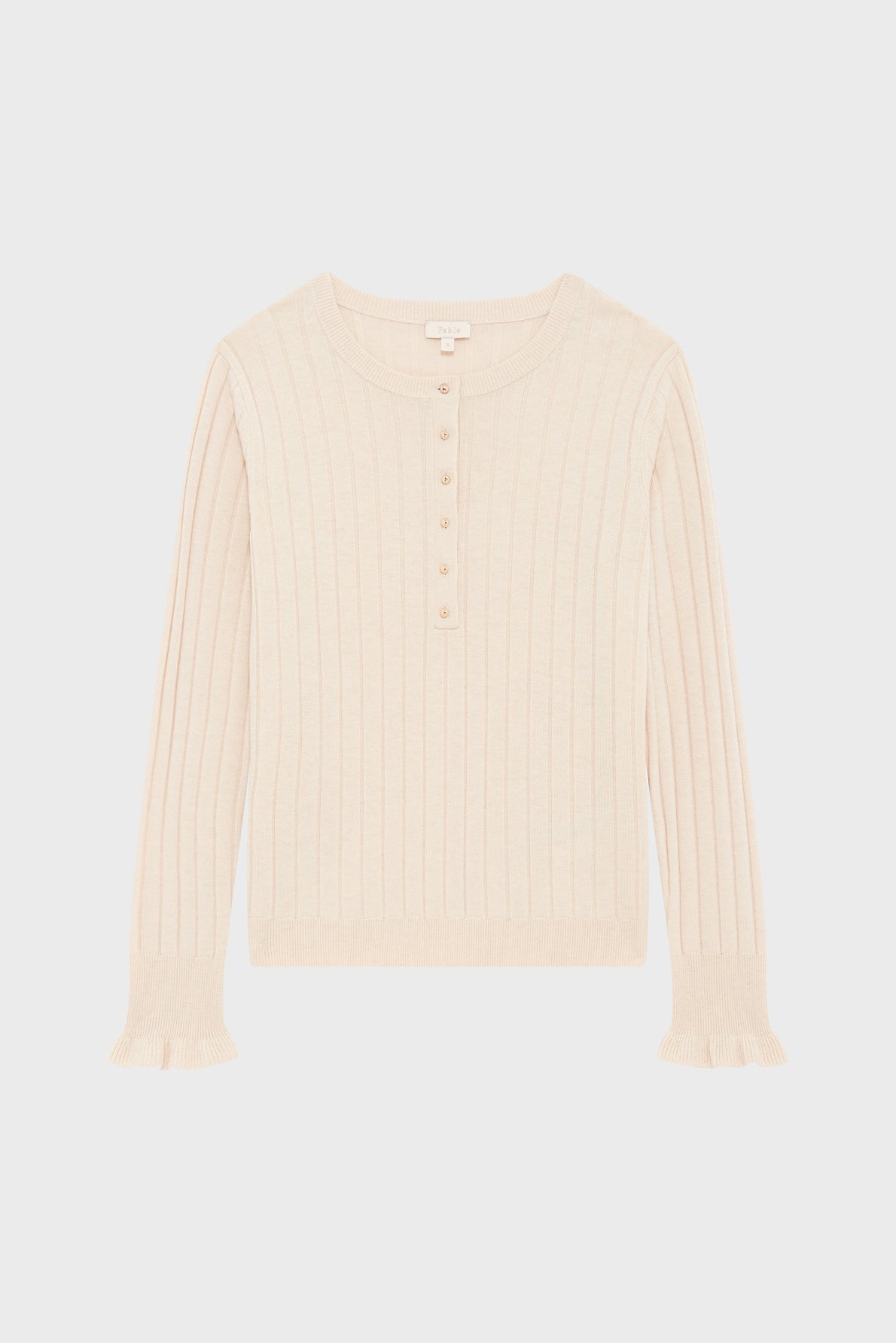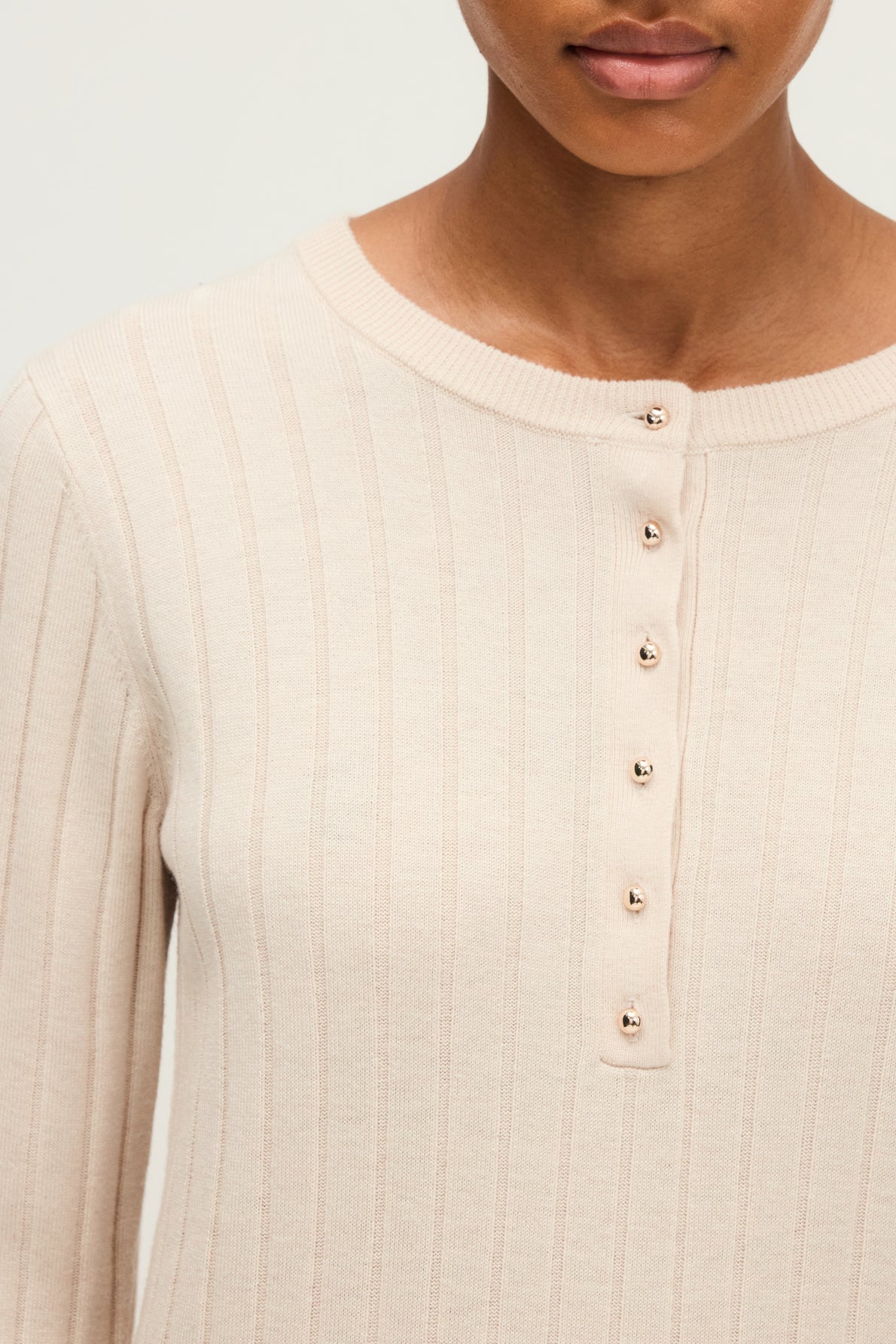 Fine ribbed sweater with a neckline adorned with small gold buttons for a chic and casual look. Made from a wool blend, ideal for the start of the season. Timeless cream color.