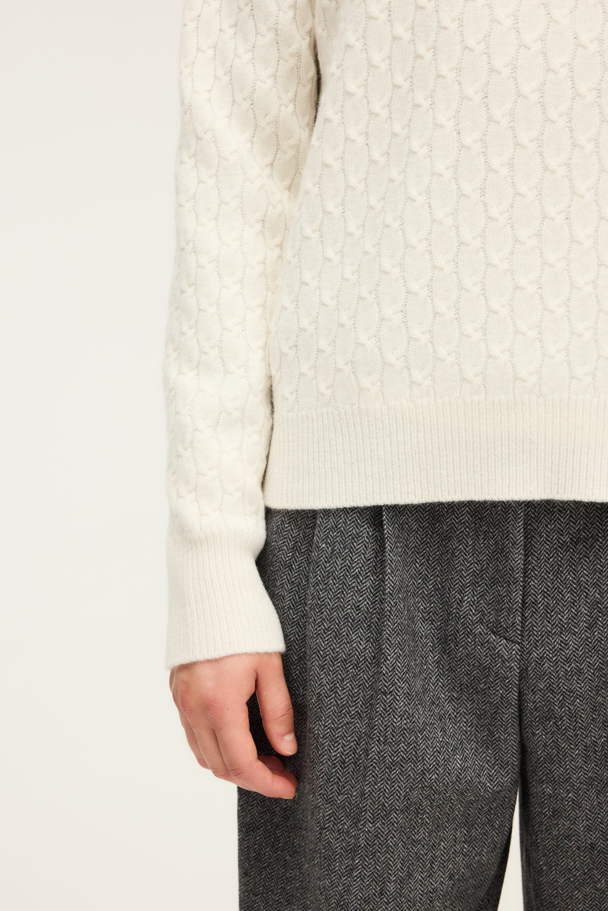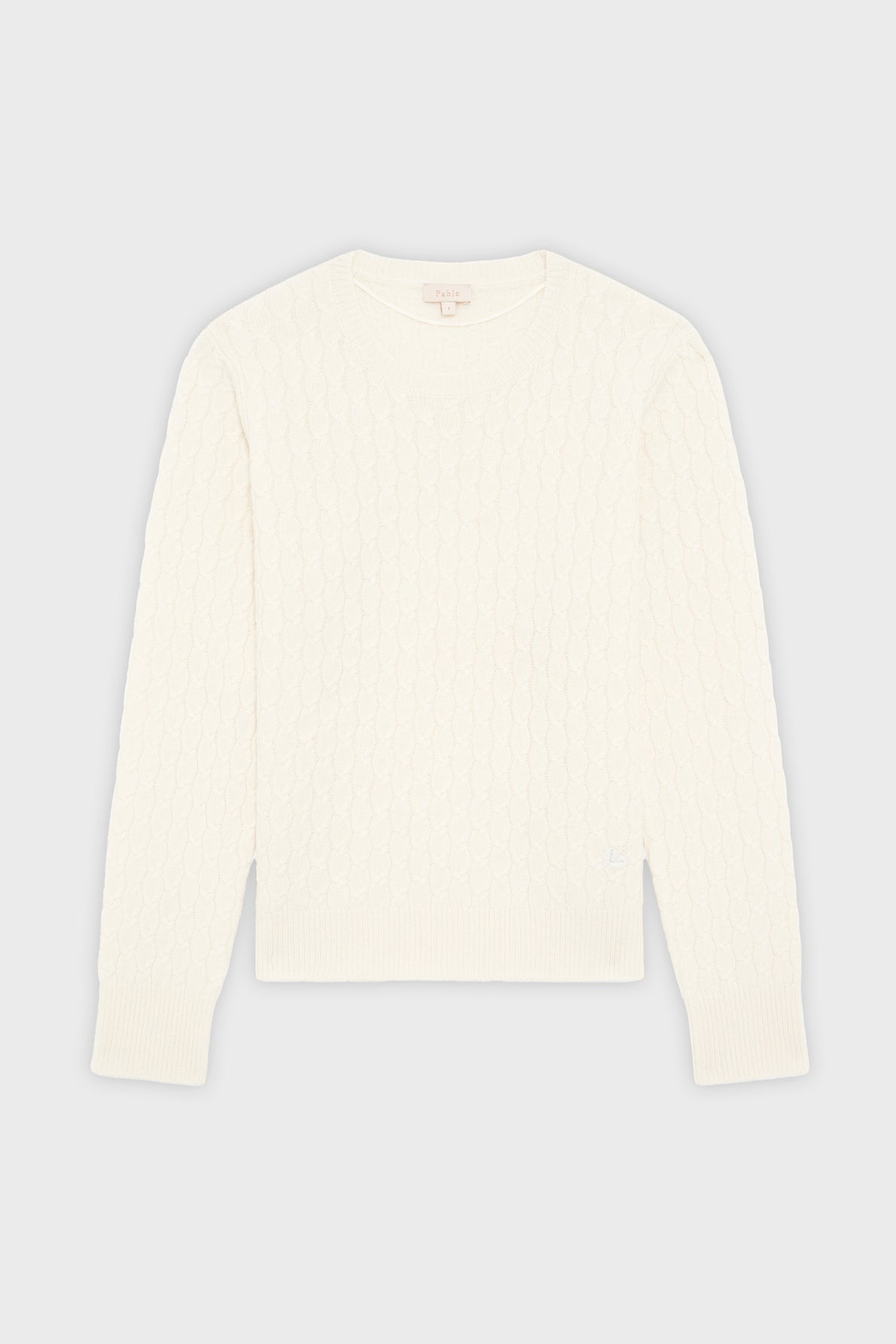 Cable-knit sweater in 100% ecru wool, both chic and casual. It will pair perfectly with a skirt or pants.