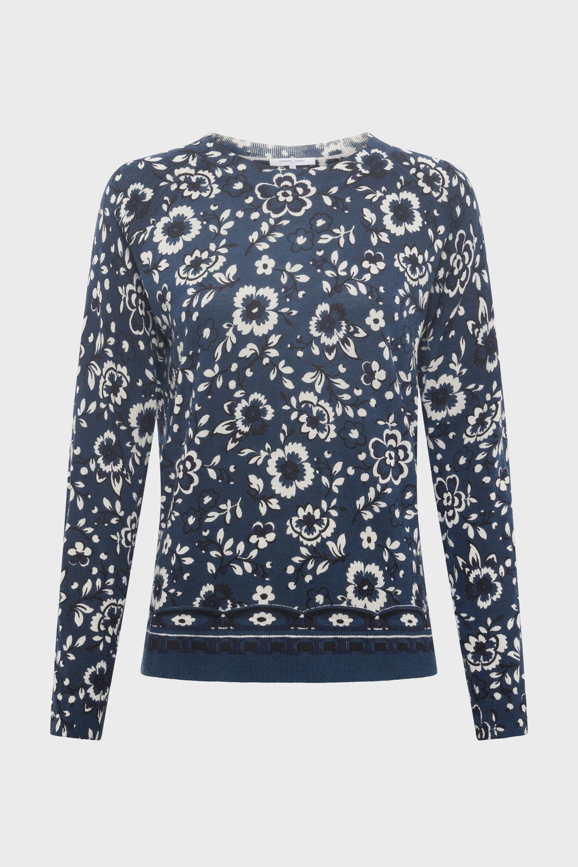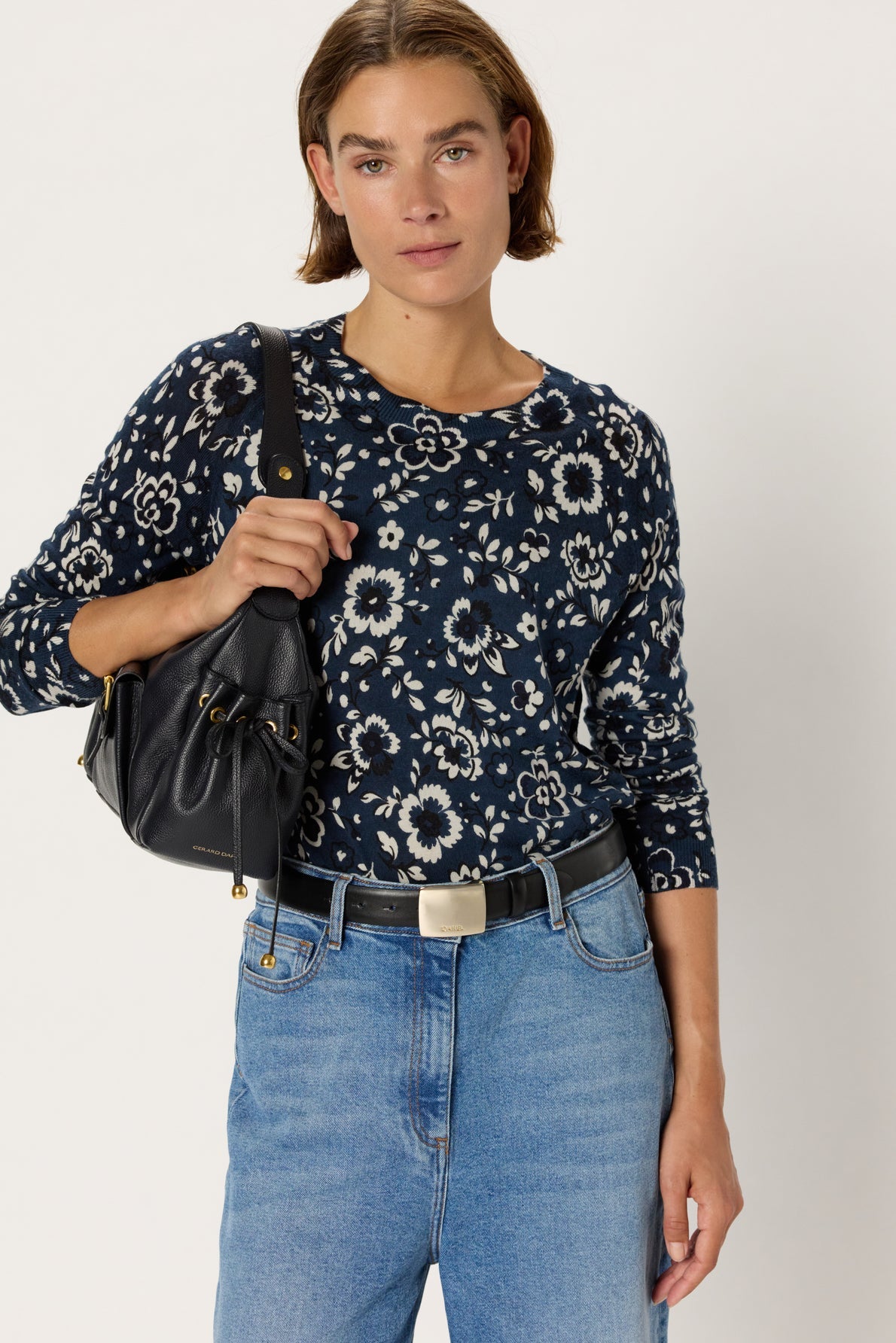 Crafted from 100% fine wool, the Eveline sweater can be worn directly against the skin. Adorned with an ivory floral print on a navy blue background, it will be ideal for the start of the season.