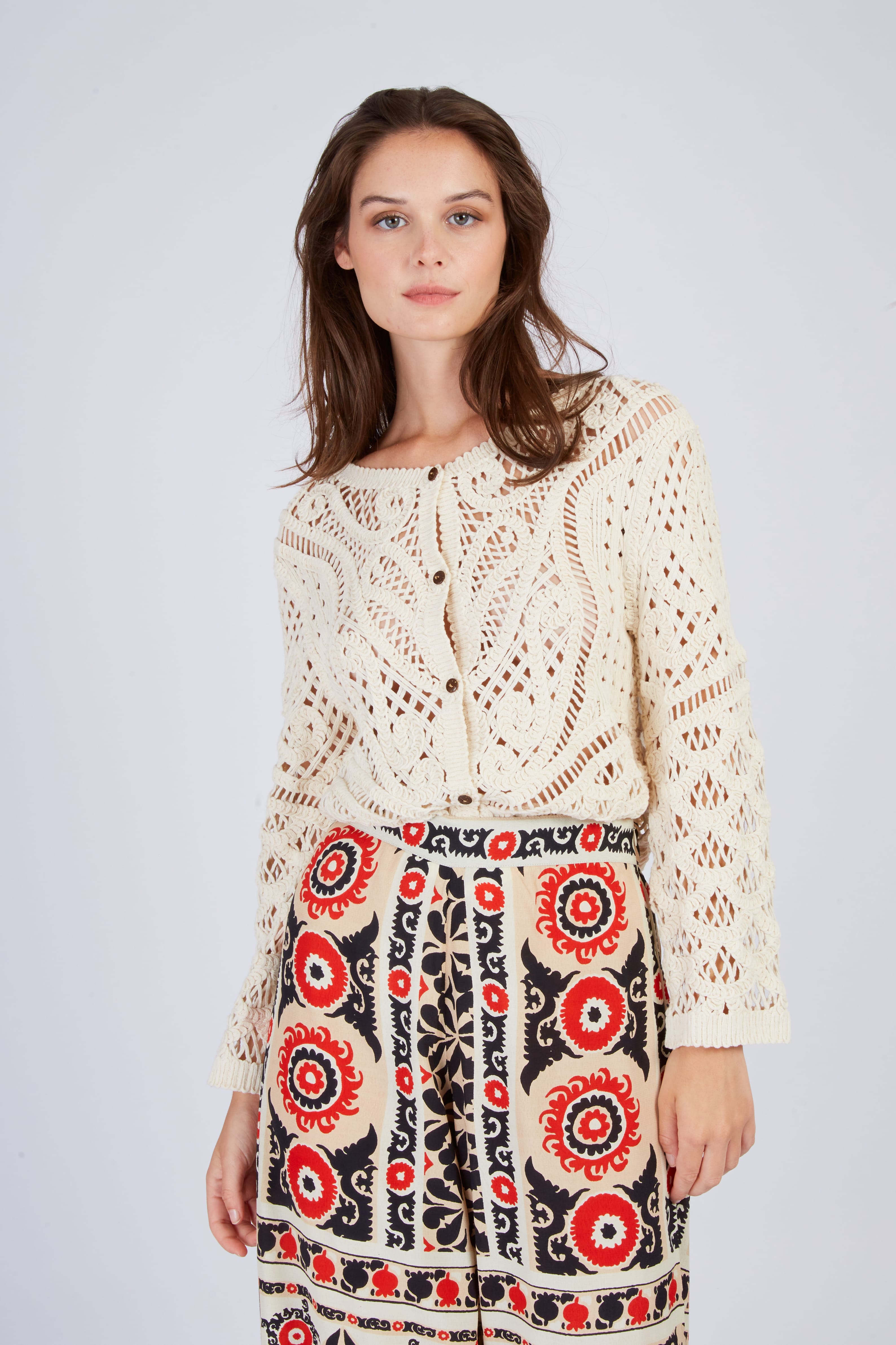 Openwork knit cardigan. Long sleeves. Round neckline with central button placket. Coconut button closure. A perfect piece to add a touch of sophistication to your summer wardrobe.