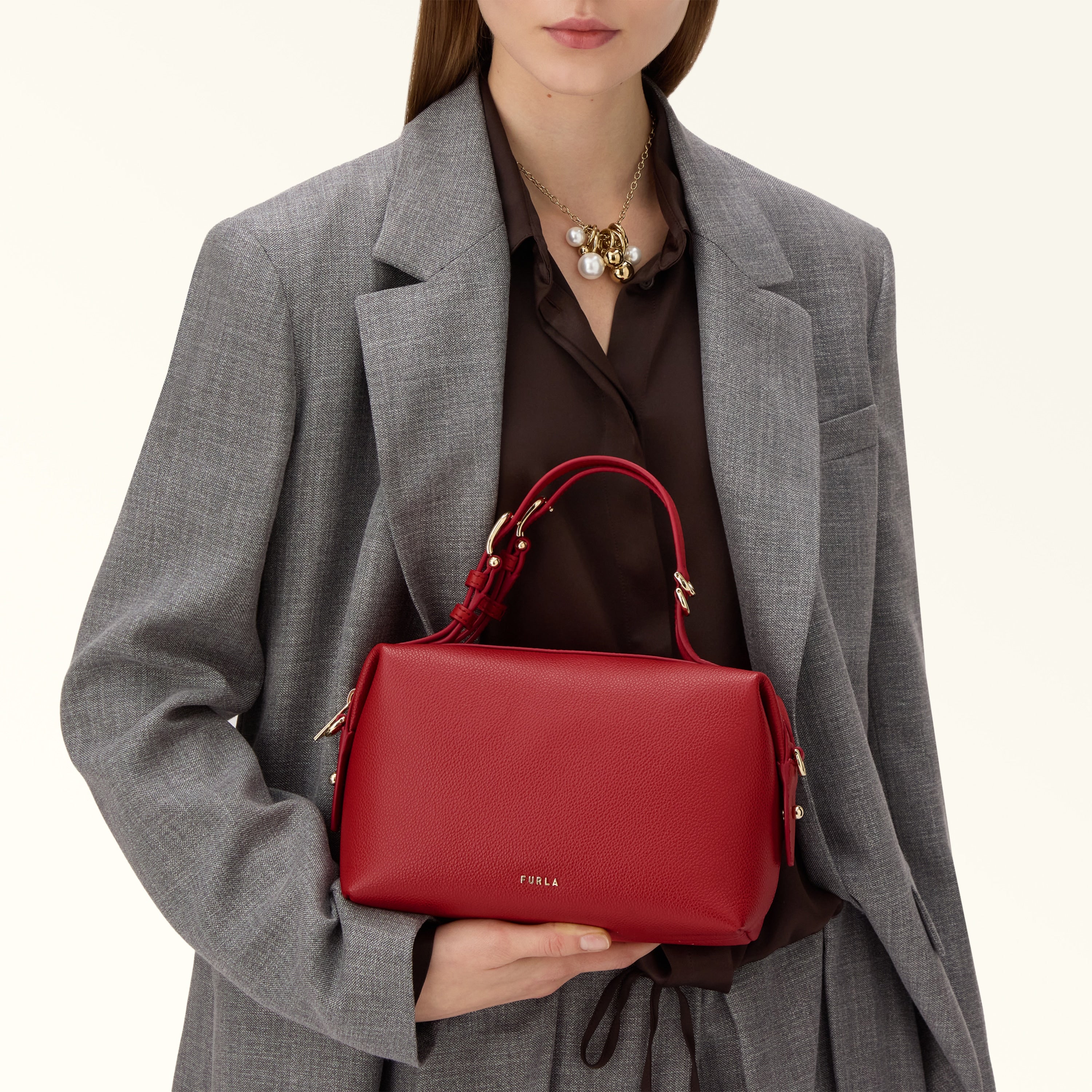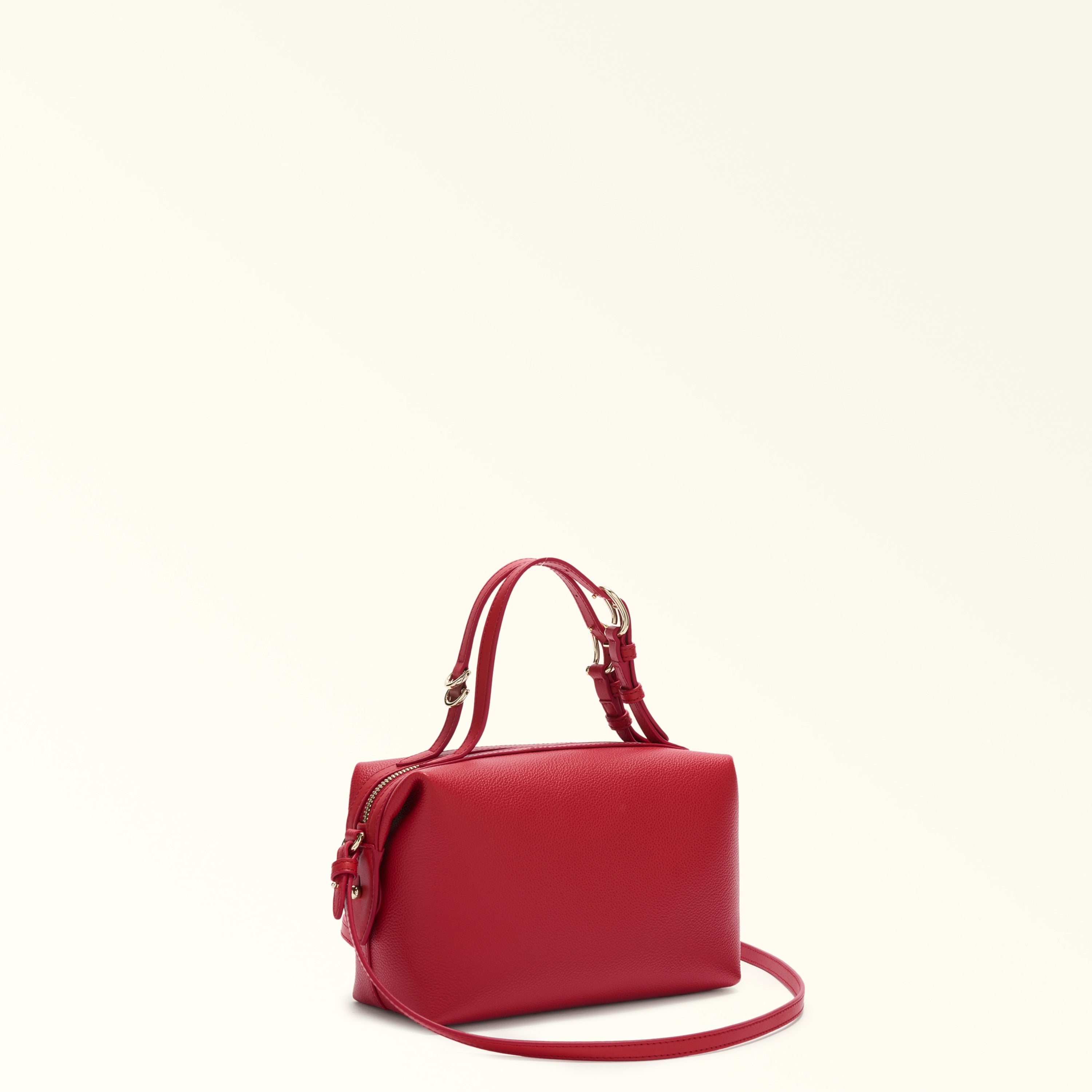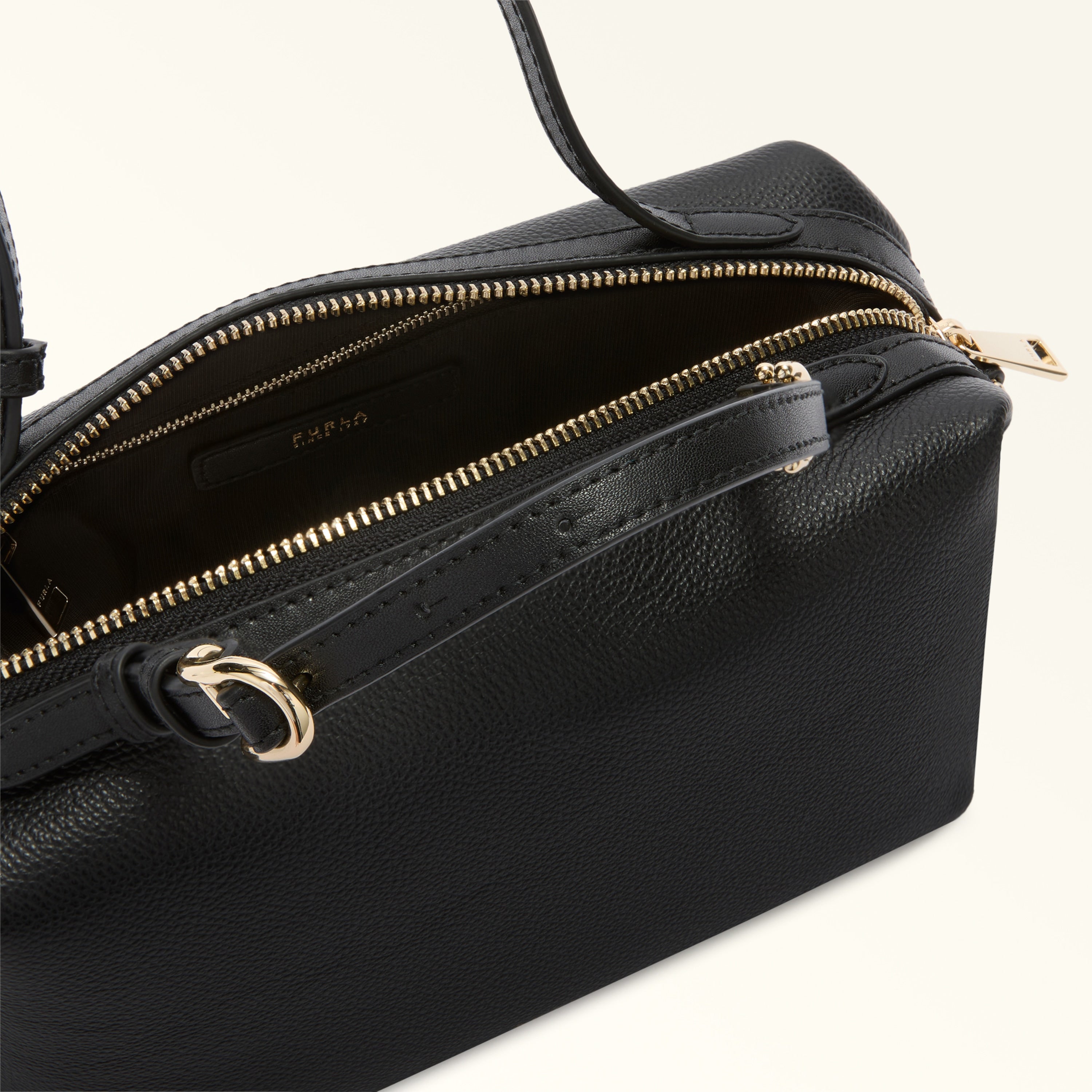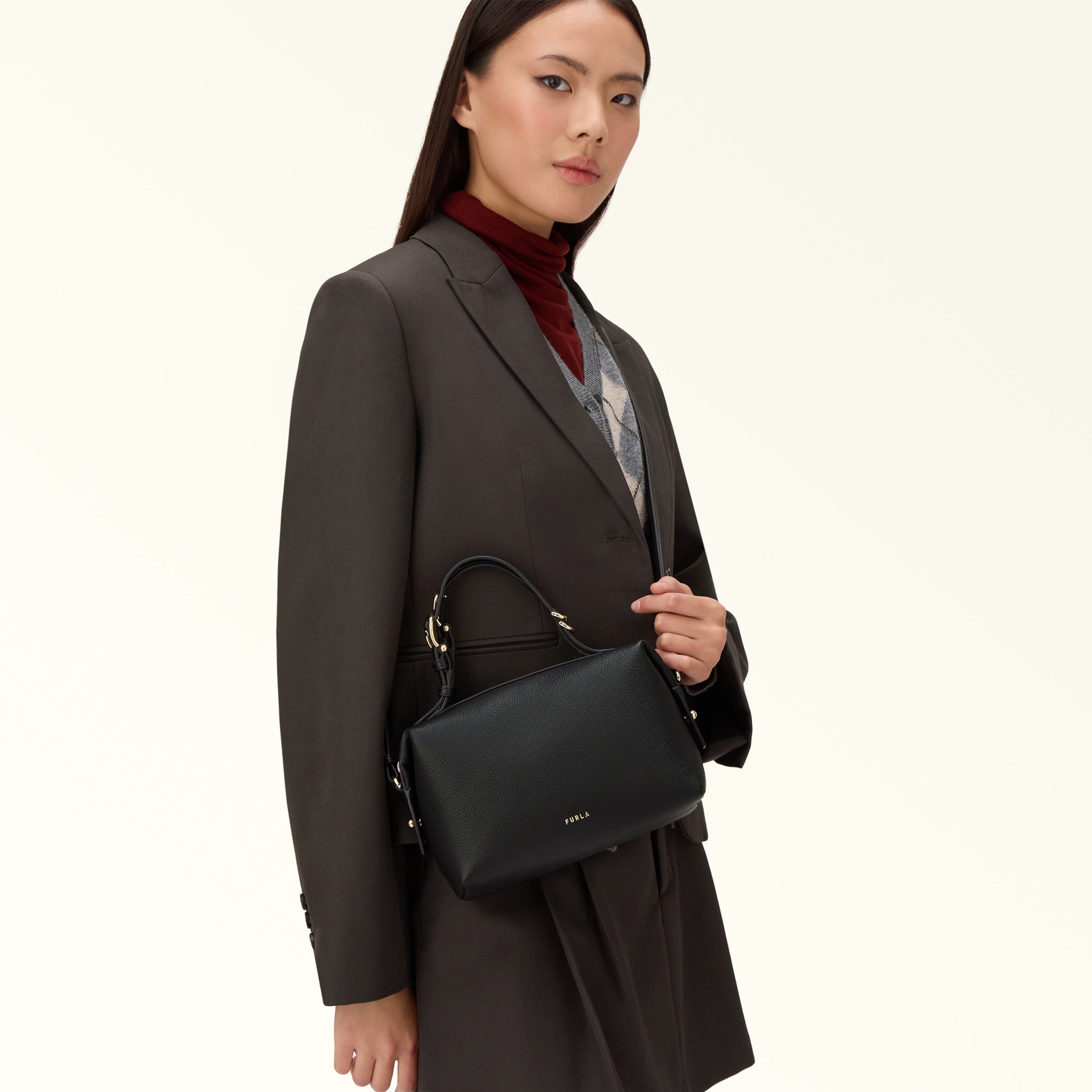 Soft and versatile, the Furla Double Boston bag's mini silhouette in precious grained calfskin is perfect for off-duty plans. Its matching shoulder strap is adjustable and detachable, allowing for a range of styling options. Its two handles are decorated with the brand's iconic Arch logo in metal and a D-ring for personalising your look with charms.