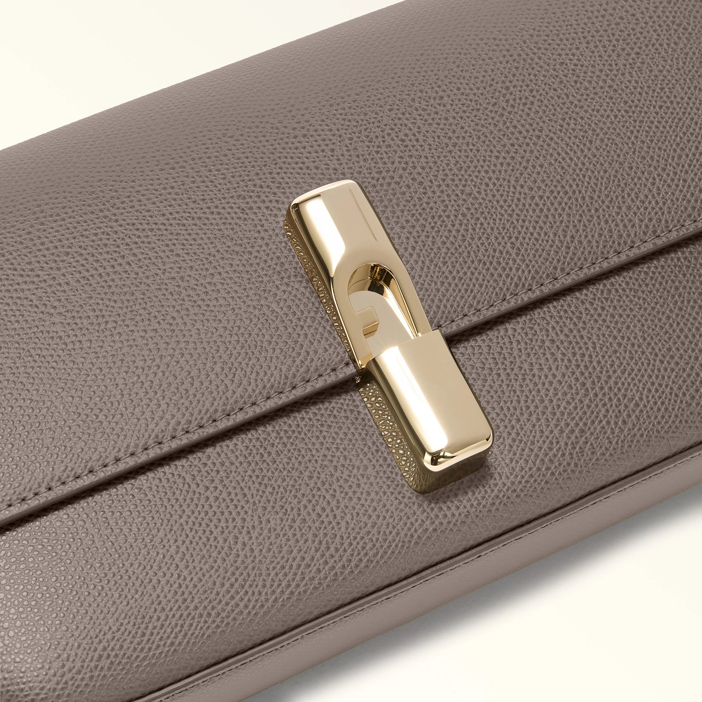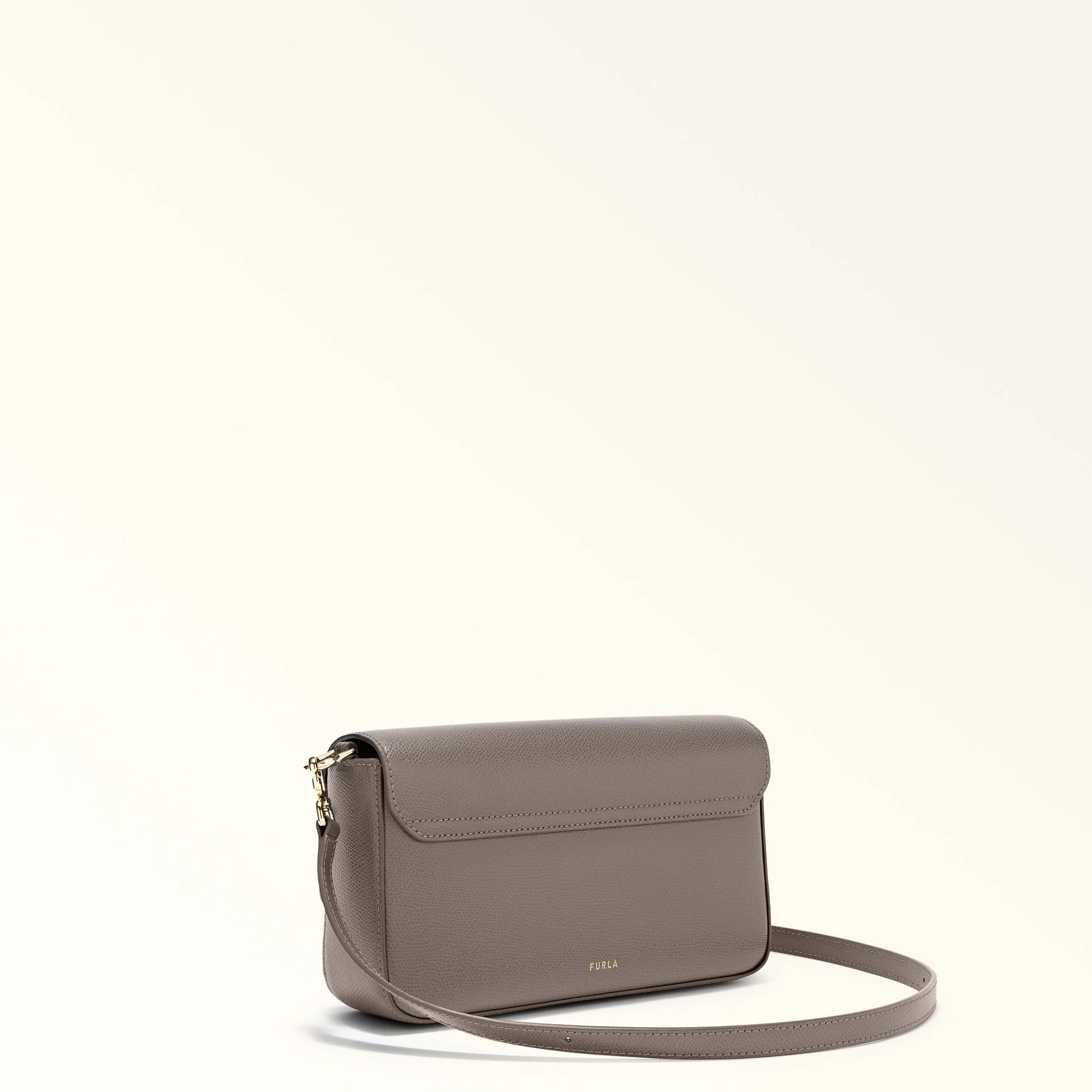 The shape of the Furla Iride crossbody is defined by its versatile, contemporary design. Its compact silhouette, in exquisite textured leather, features an adjustable and detachable shoulder strap for multiple styling options. Its magnetic closure is embellished with cylindrical metal hardware, finished with the iconic Furla Arch logo.