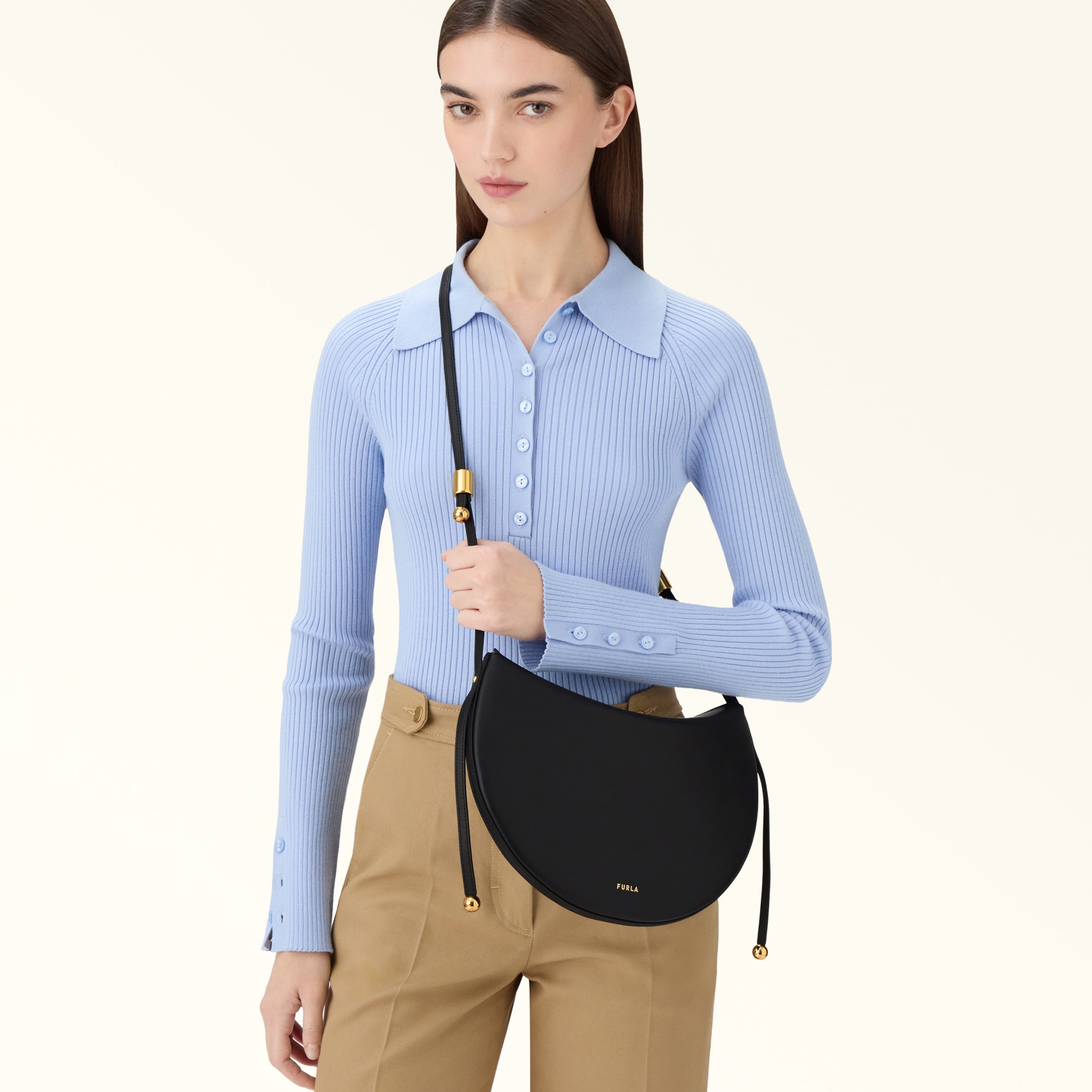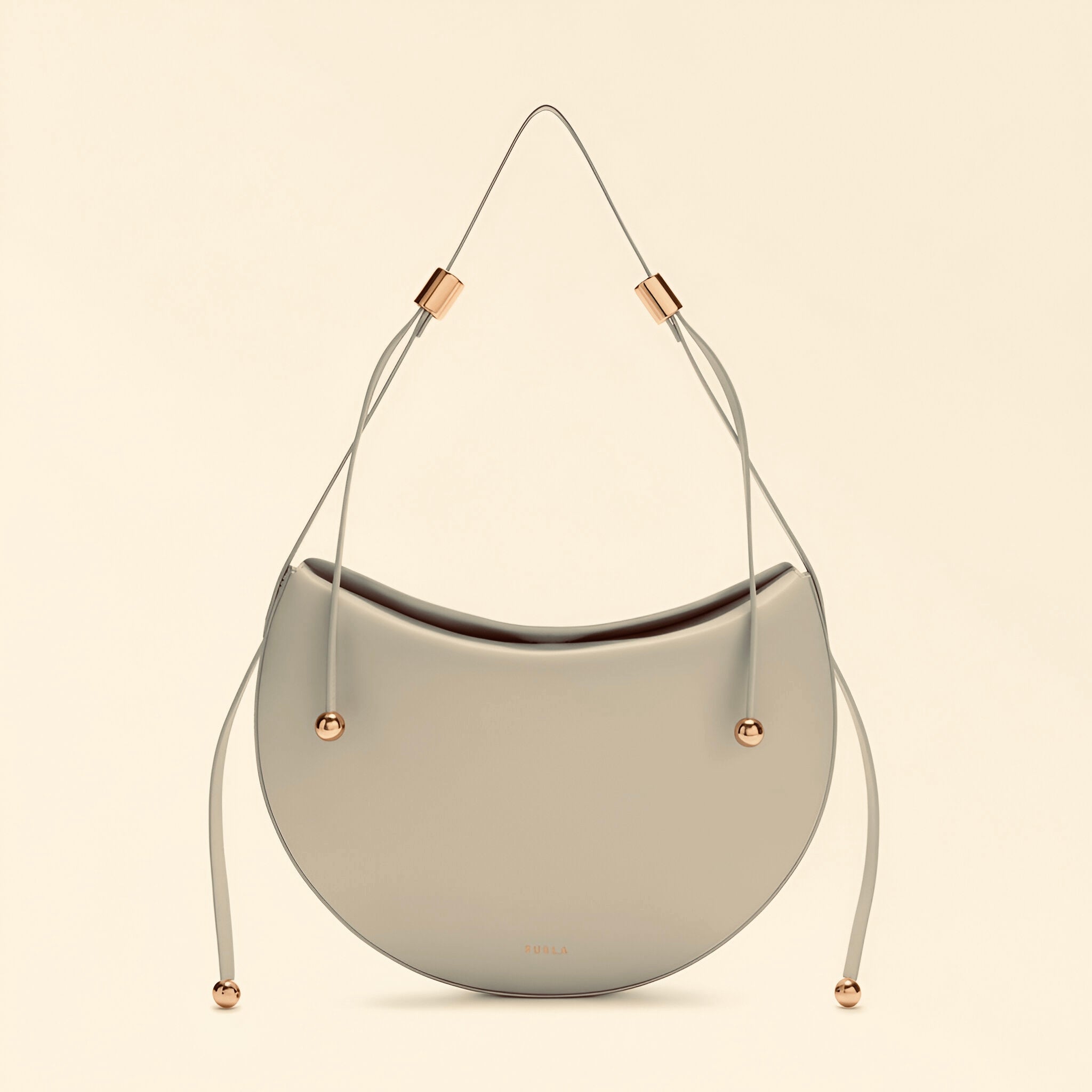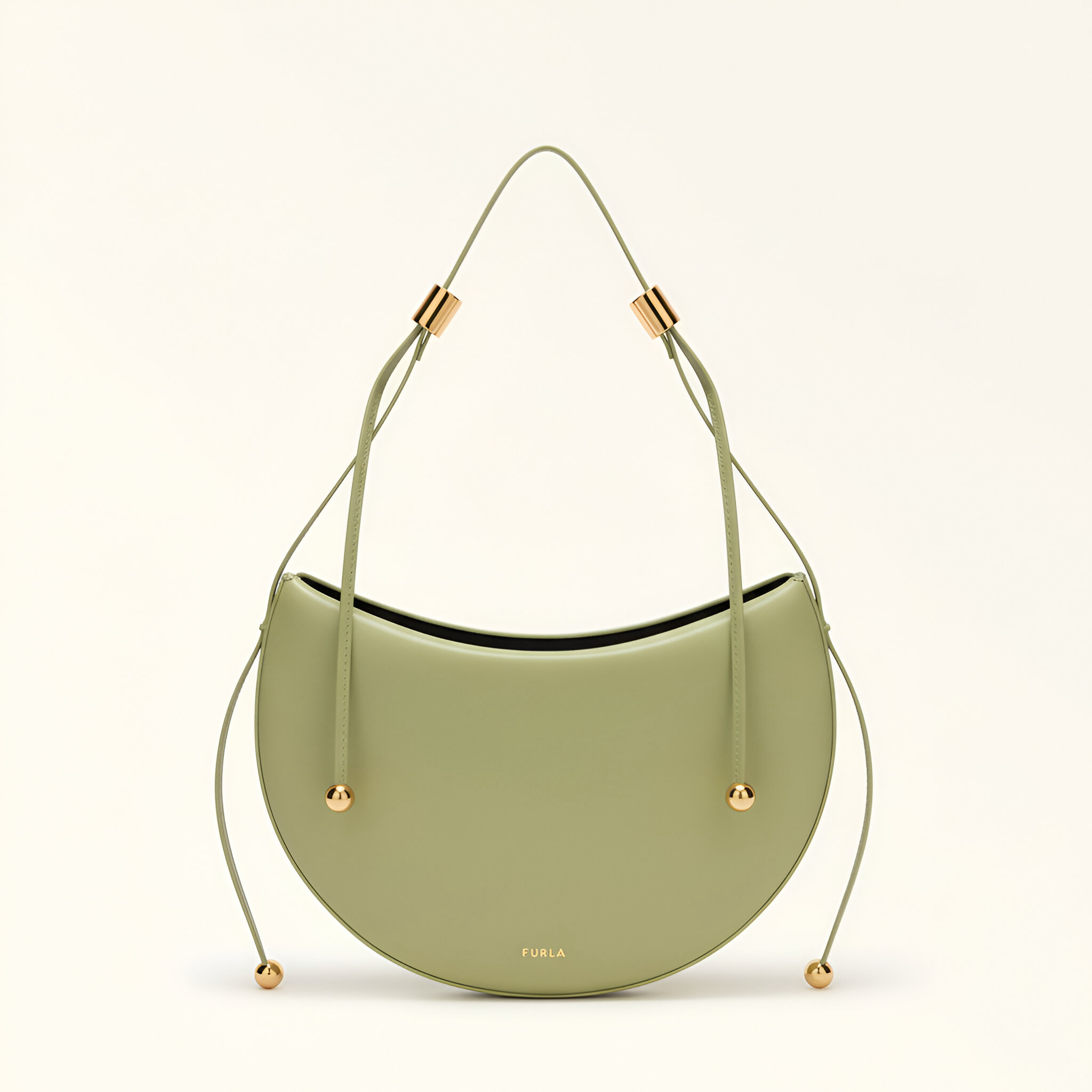 The Furla Moonstone shoulder bag has a contemporary saddle silhouette, its calfskin leather design elevated by clean and rounded lines. An adjustable fixed shoulder strap offers different styling options, while cylindrical hardware and two Sfera elements add a touch of elegant originality.