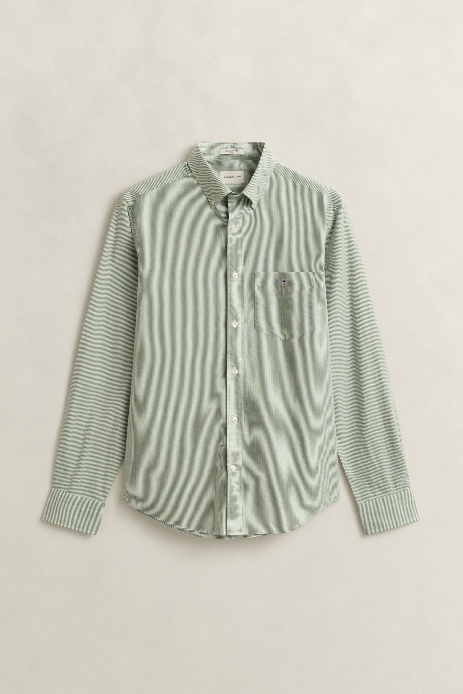 Crafted in a durable cotton poplin, this classic shirt is essential to any preppy wardrobe. Designed with a classic Banker Stripe throughout the garment, this shirt is cut for a regular fit and features a button-down collar, curved hem and a box pleat with our signature locker loop at the back. It is accented with an '80s-inspired Gant shield graphic embroidered at the chest pocket.