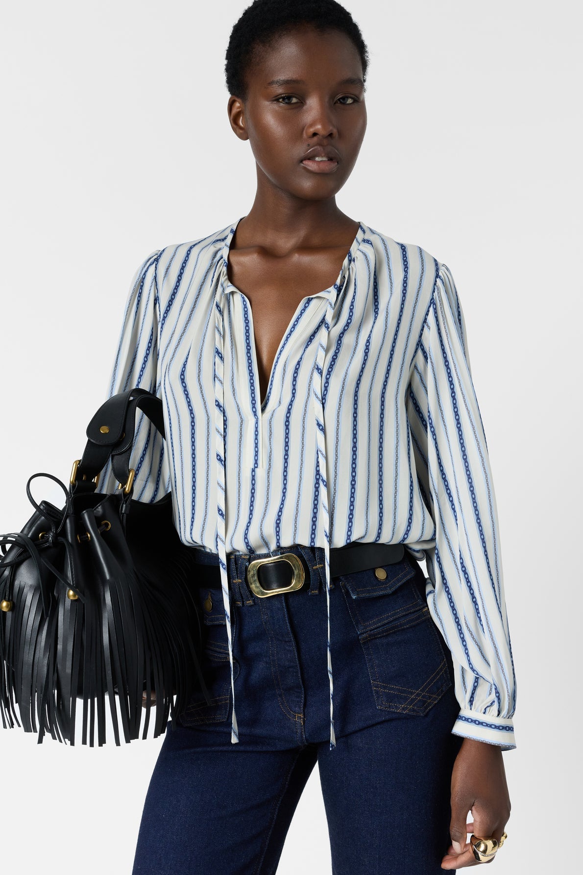 The Cammie blouse is adorned with a chain print forming vertical stripes. Its fluid cut and split neckline lend a relaxed yet polished look. An easy-to-pair piece, perfect for revitalizing an everyday look. Its fabric is fine and soft to the touch.