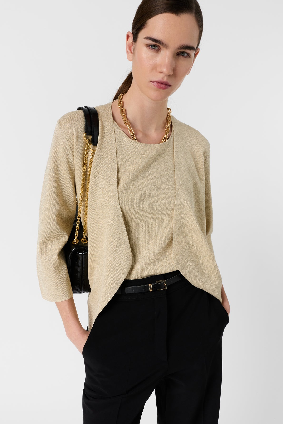 Sleeveless cardigan in golden knit, with a fluid and contemporary cut. Its subtle sheen gives it a relaxed elegance, perfect for brightening up an everyday look or enhancing an evening outfit. It will be worn with the matching top in a twin-set spirit.