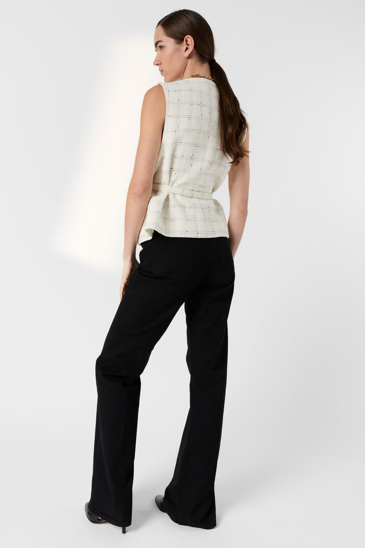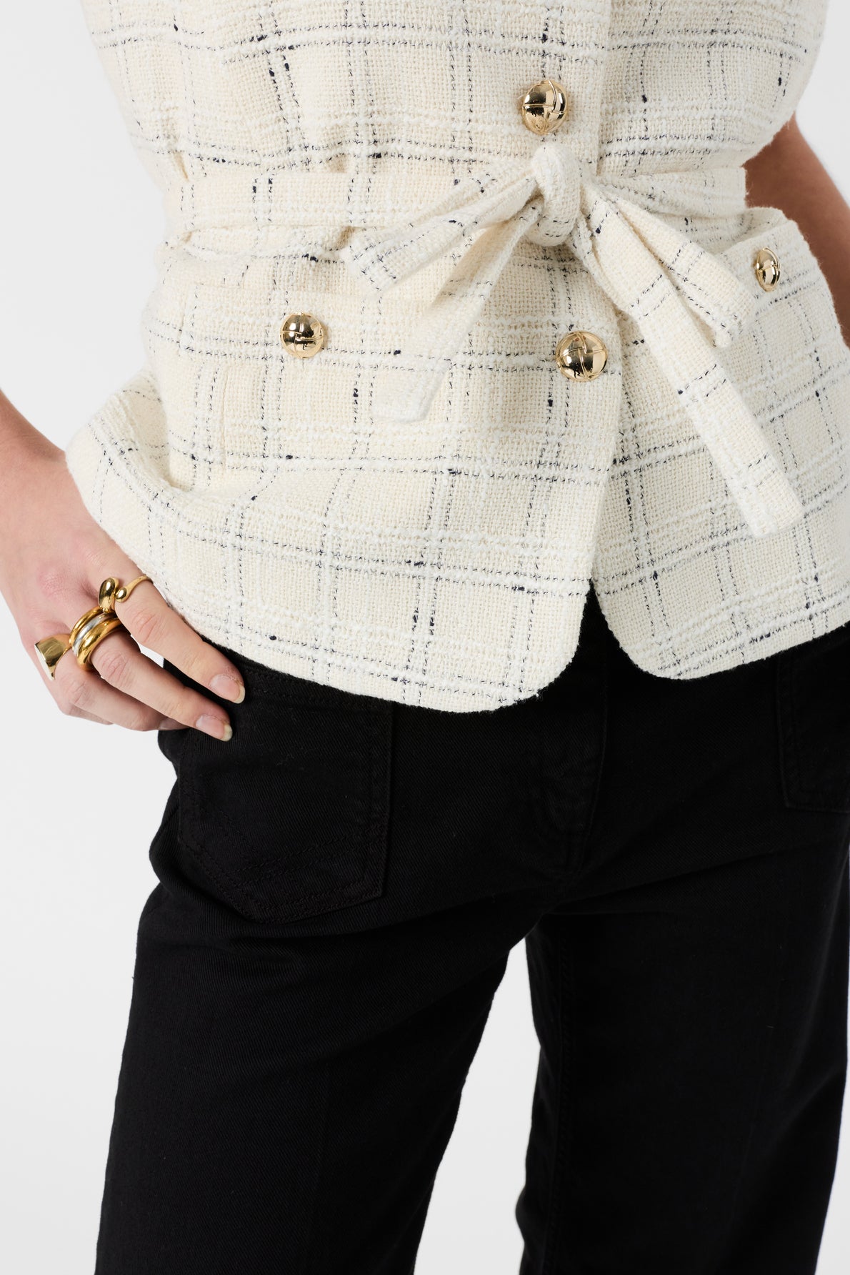 The Tillie model is conceived as a structured vest-jacket: the absence of sleeves lends it a modern appearance, while the straight, mid-length cut refines the silhouette. A fine checkered pattern contrasts with the ecru tweed and the golden buttons. It is adorned with pockets and a belt. It can be worn with the matching pants.