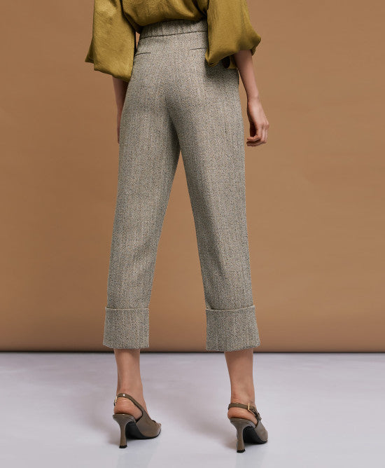 Pants with herringbone weave and wide turn-up hems. They feature an elastic waistband and side pockets. Pair them with the matching jacket from our collection for chic and polished looks.