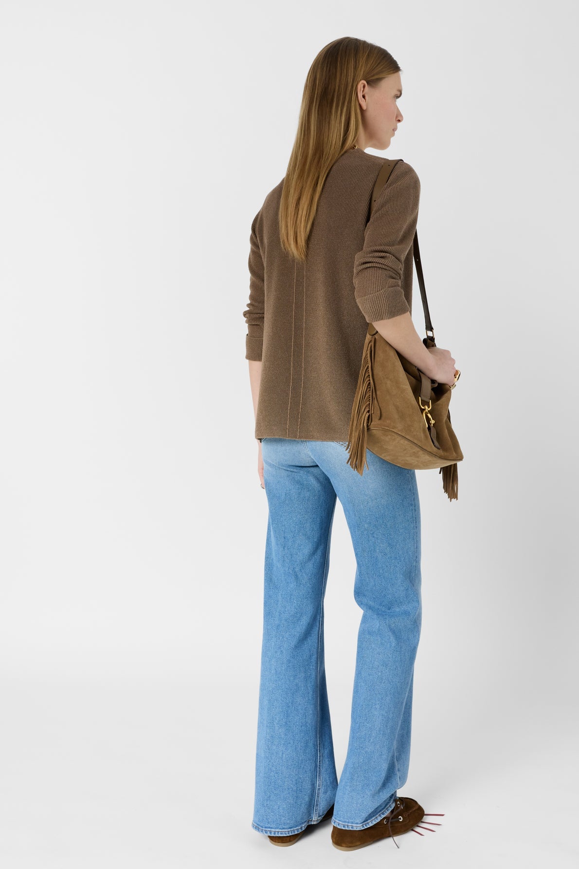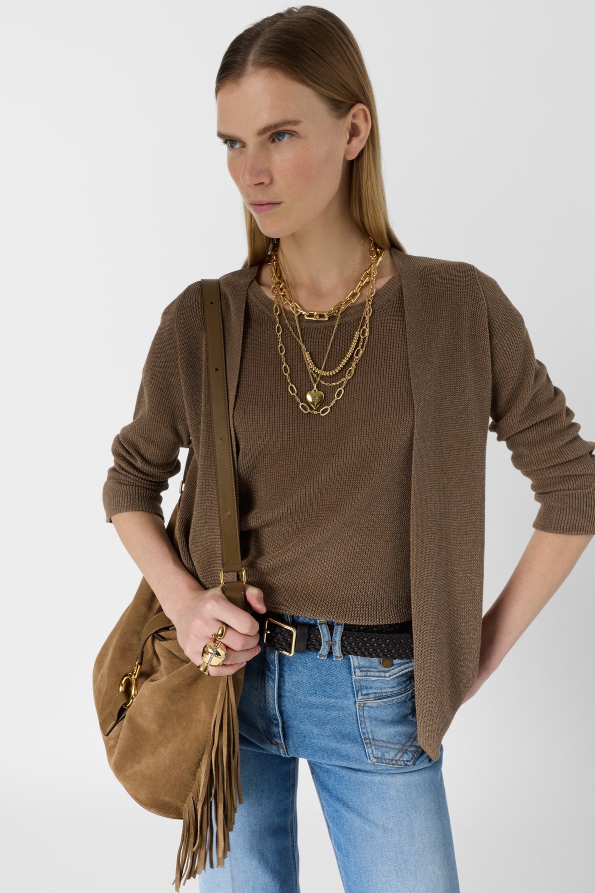 Crafted from subtly shimmering camel knit, the Lorina cardigan can be worn open or with a belt. It will charm with its fluid and feminine drape. Paired with the matching sweater, it will create a lovely mid-season twin set.