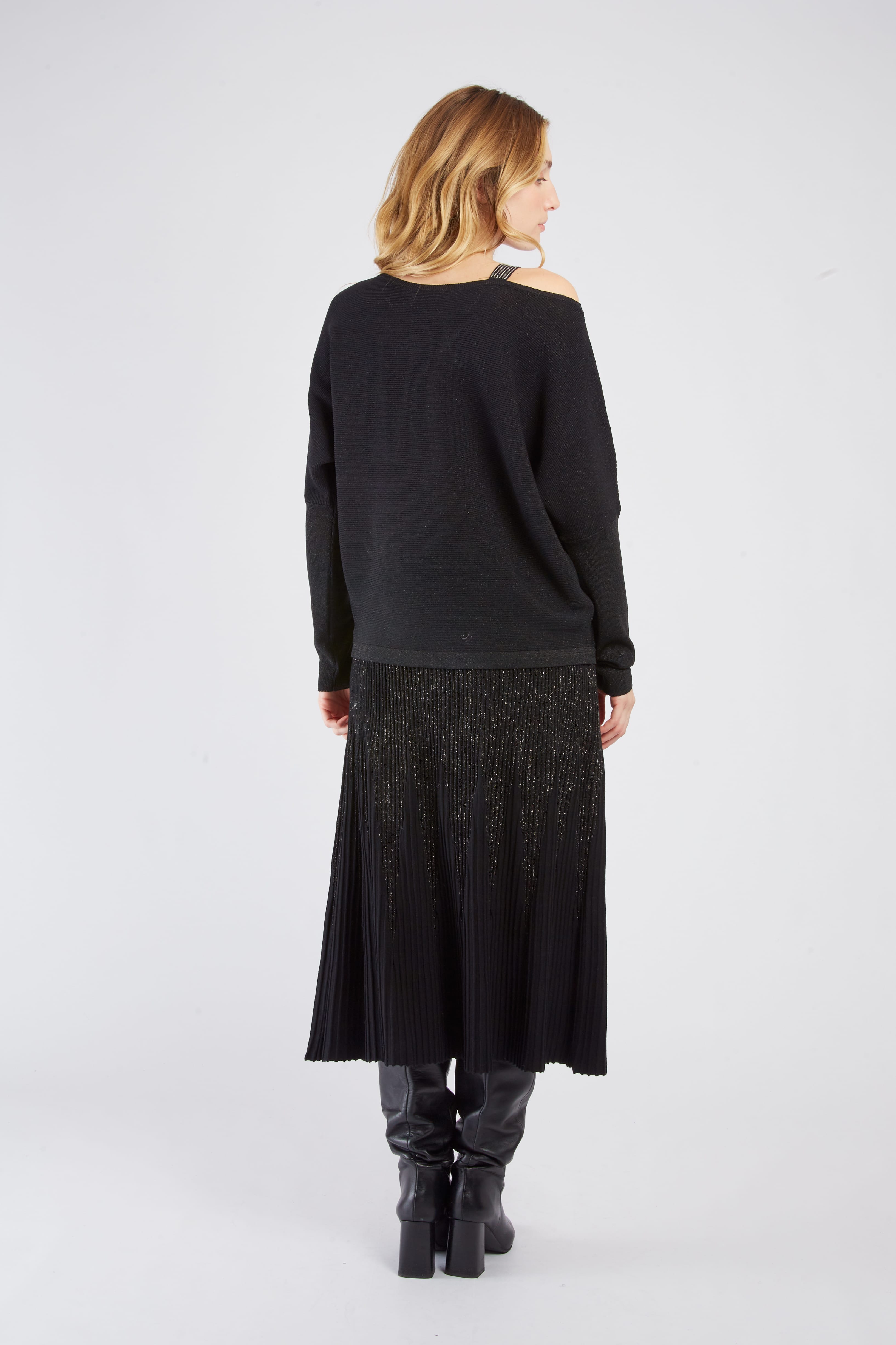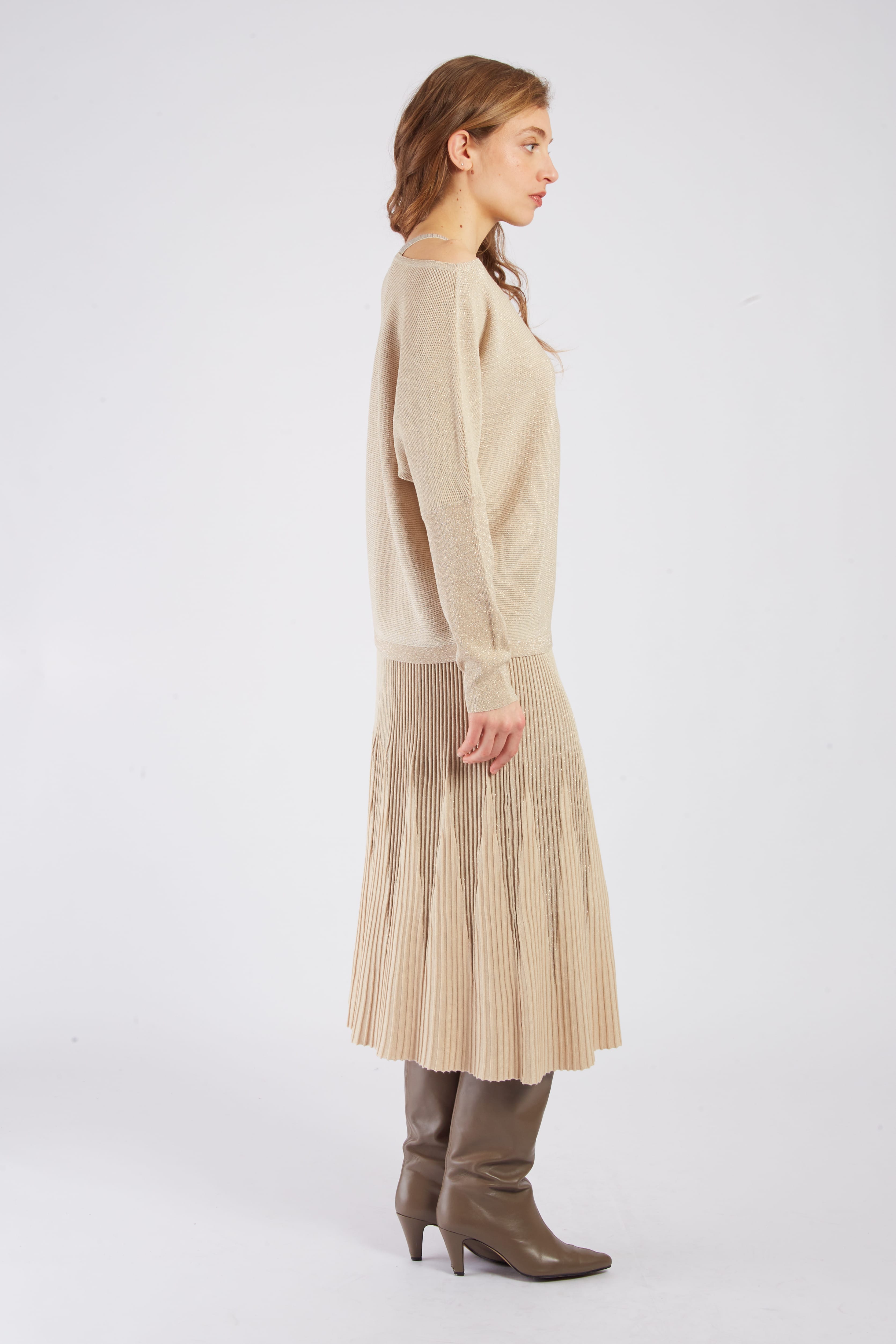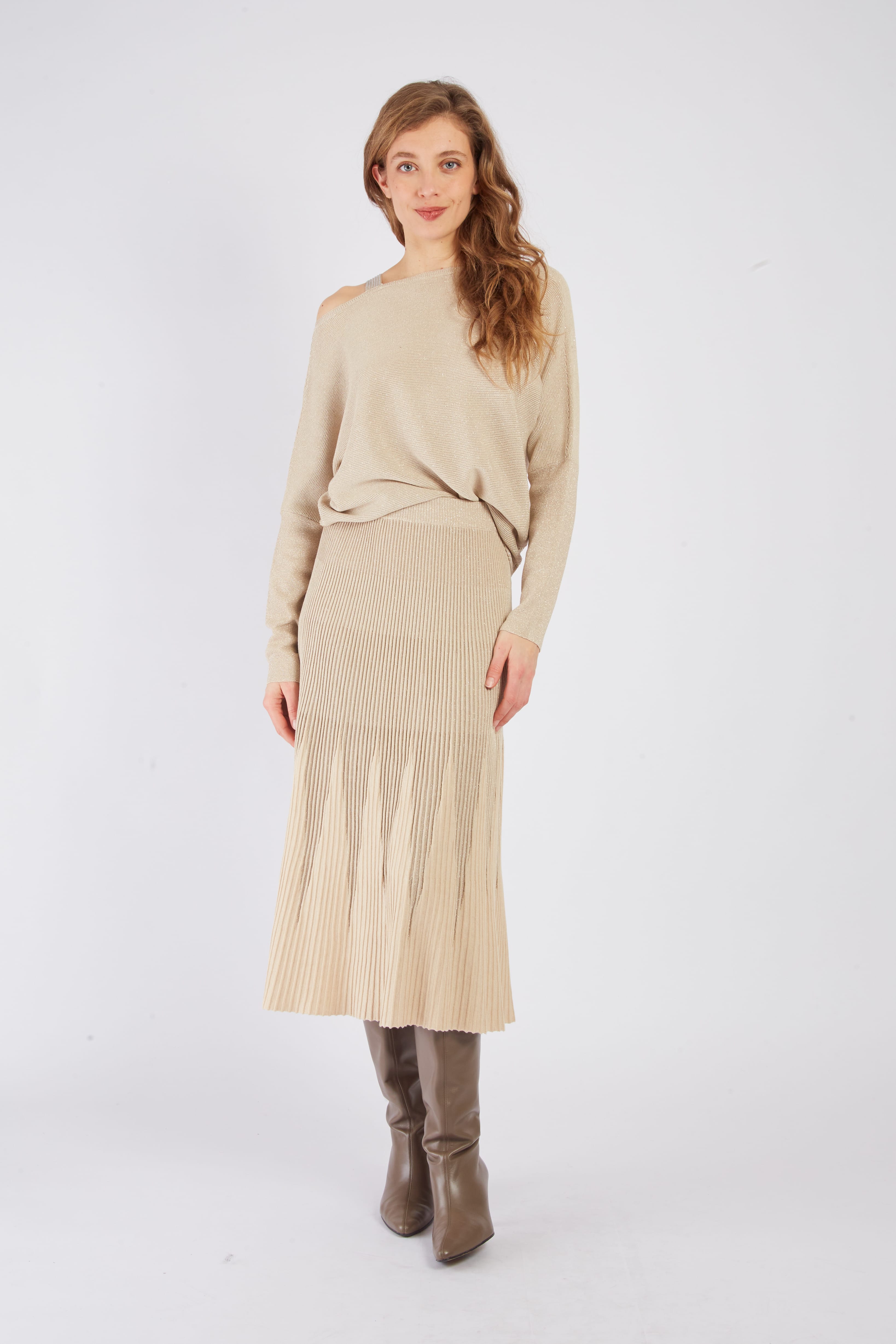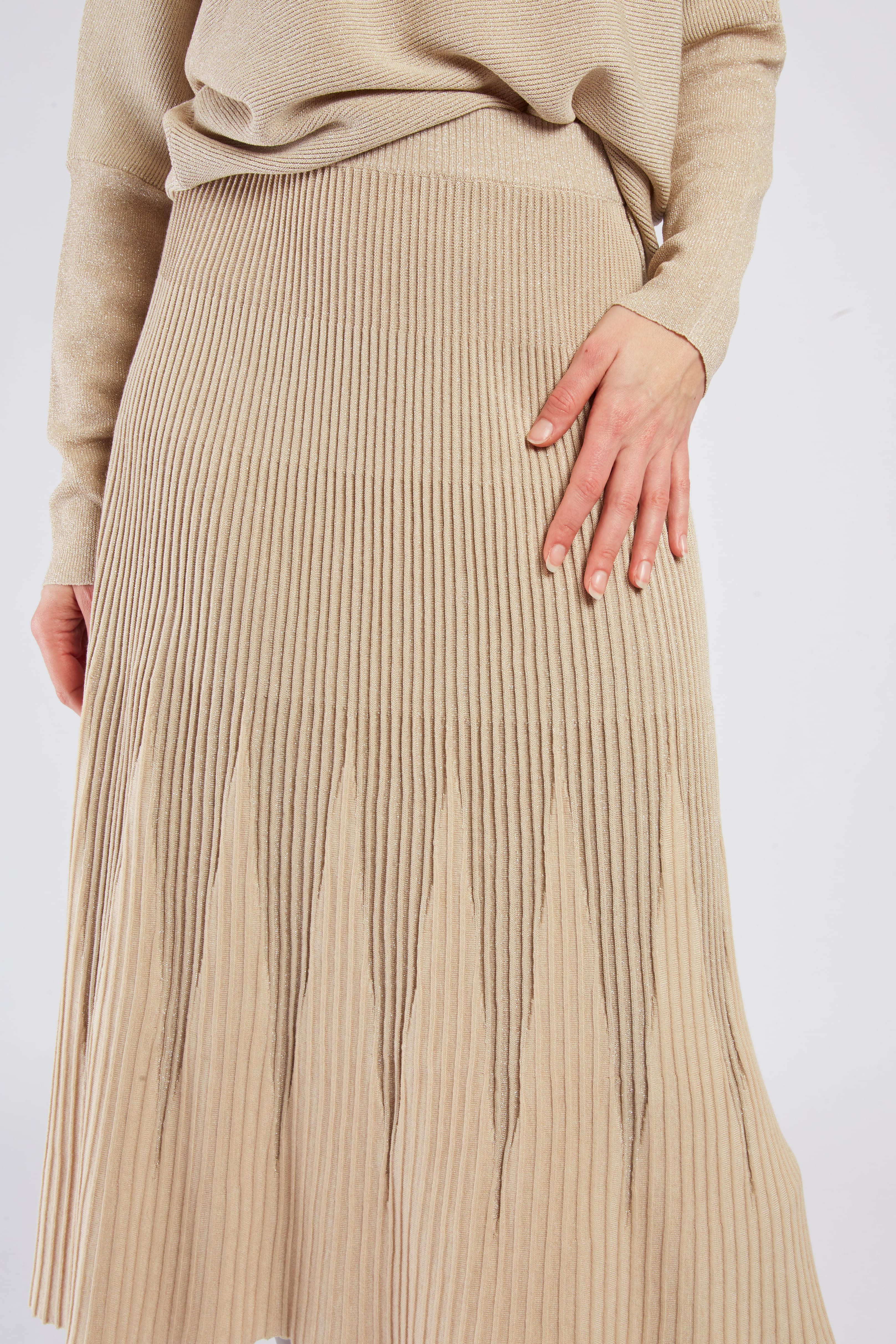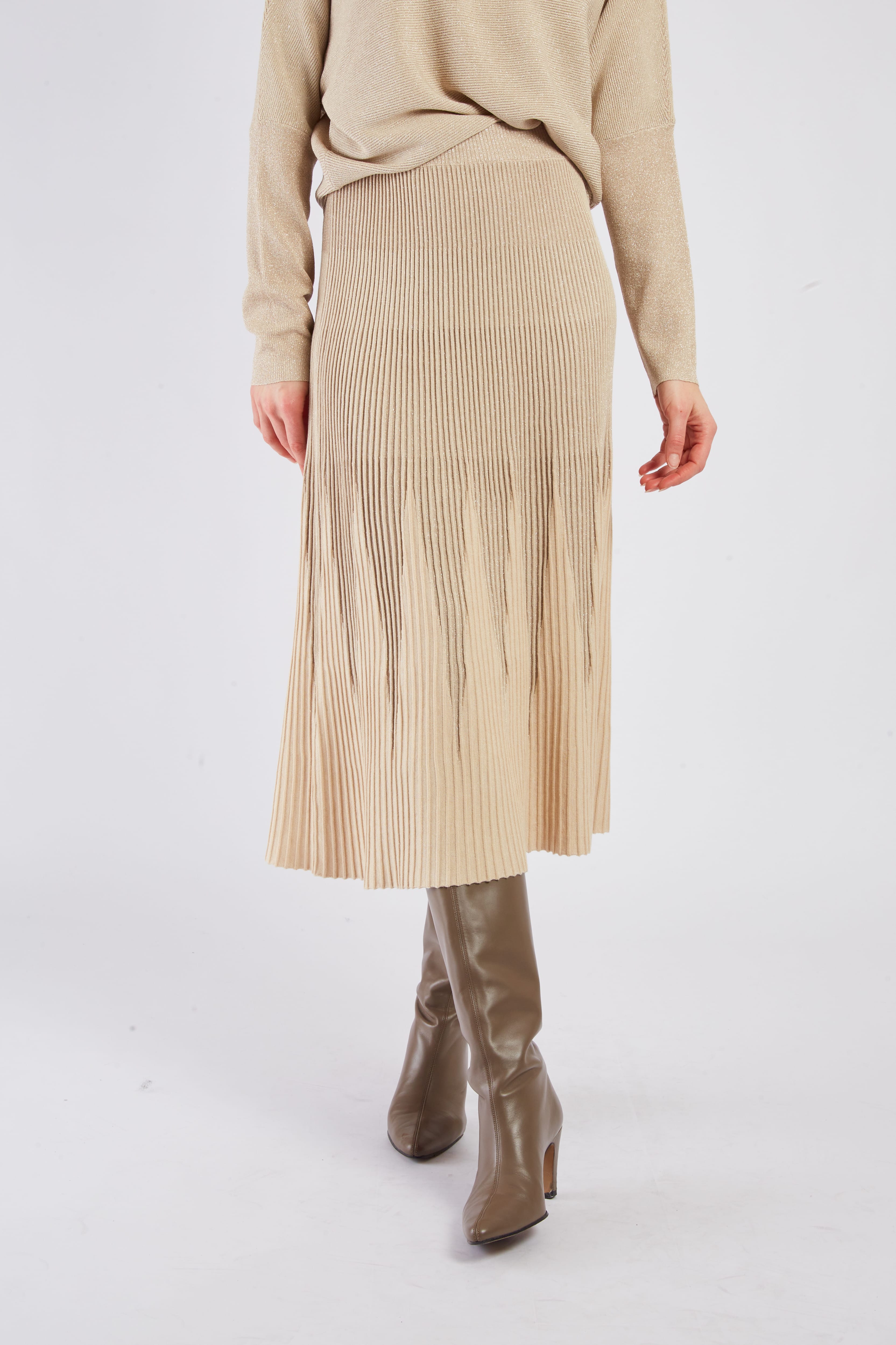 Pleated knit midi skirt with fine ribbing and a lurex insert for a subtle sheen. Elasticated knit waistband for added ease and comfort. Flowing and feminine, perfect for a chic, easy-to-wear mid-season look.
