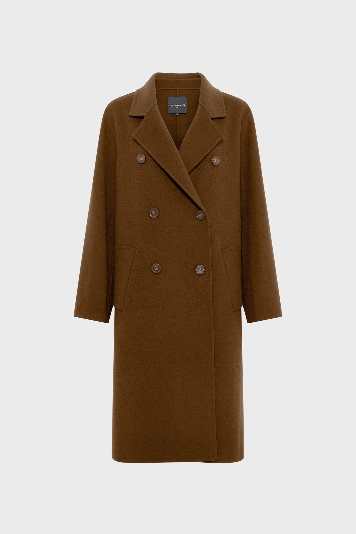 Overzised Milena long coat with double-breasted buttoning for contemporary chic. Made from 100% fine double-faced brown wool, ideal for the start of the season.