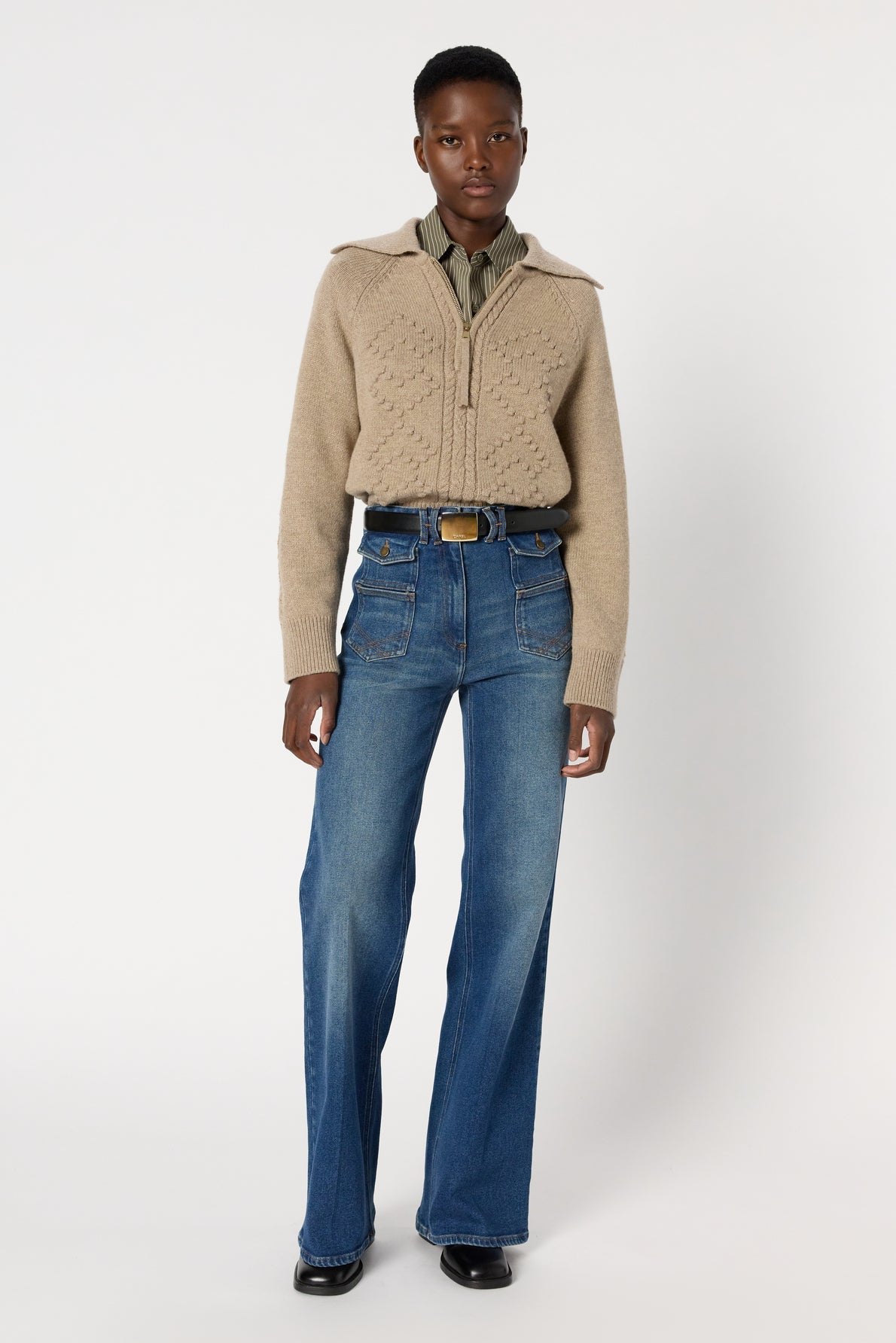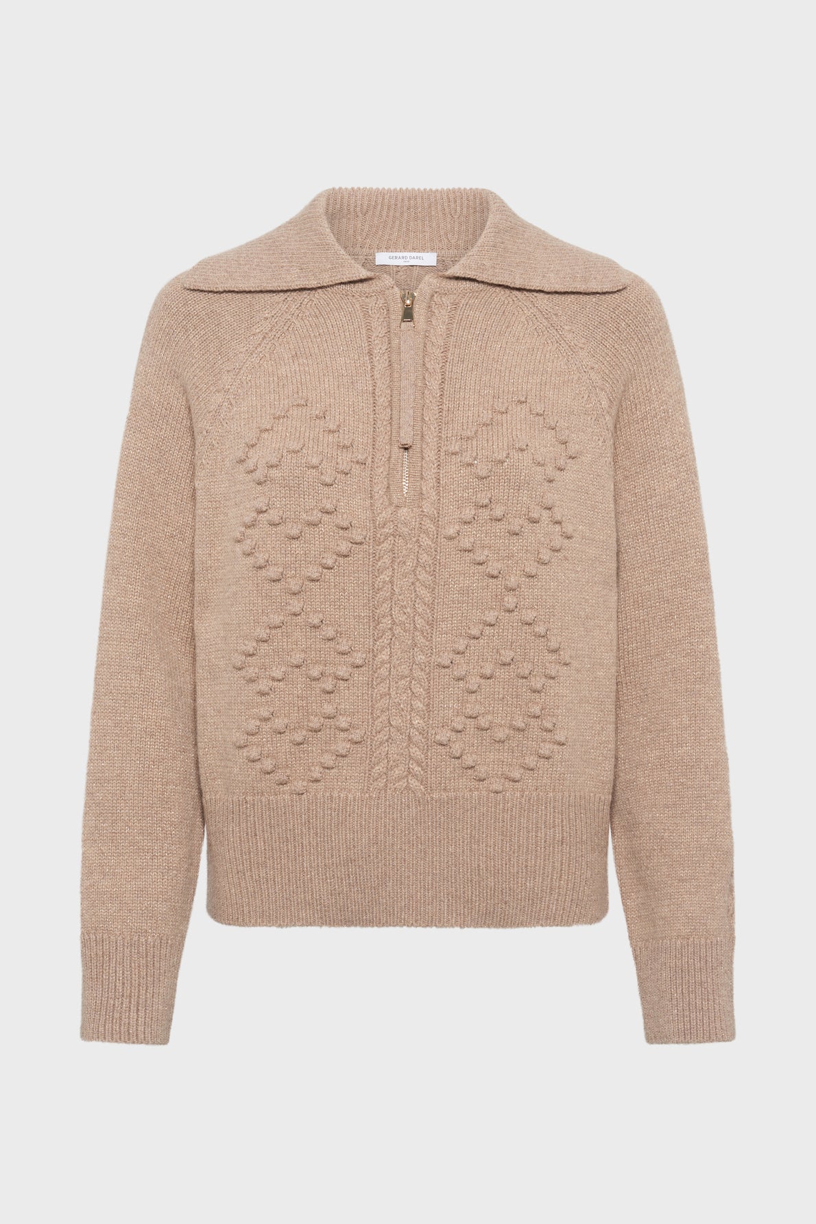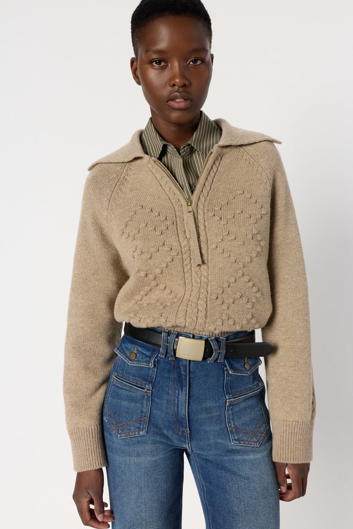 Edena sweater features a set of diamond and cable knits in beige with a touch of gold-tone lurex, and a zippered collar. Add a fancy touch to winter.
