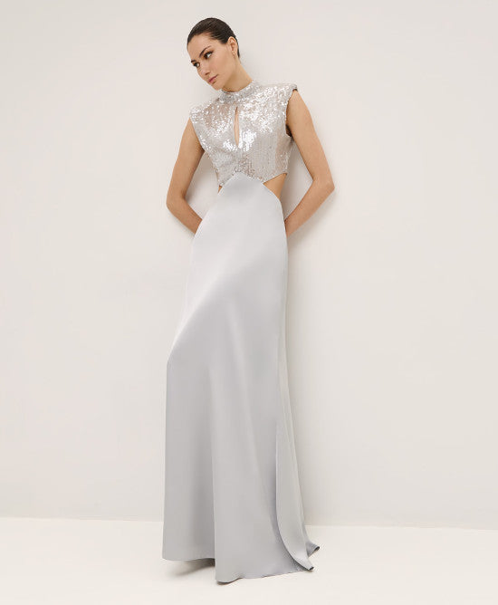 Maxi dress with a sequin top. It features striking cut-outs at the front and waist. Choose it for standout formal looks.