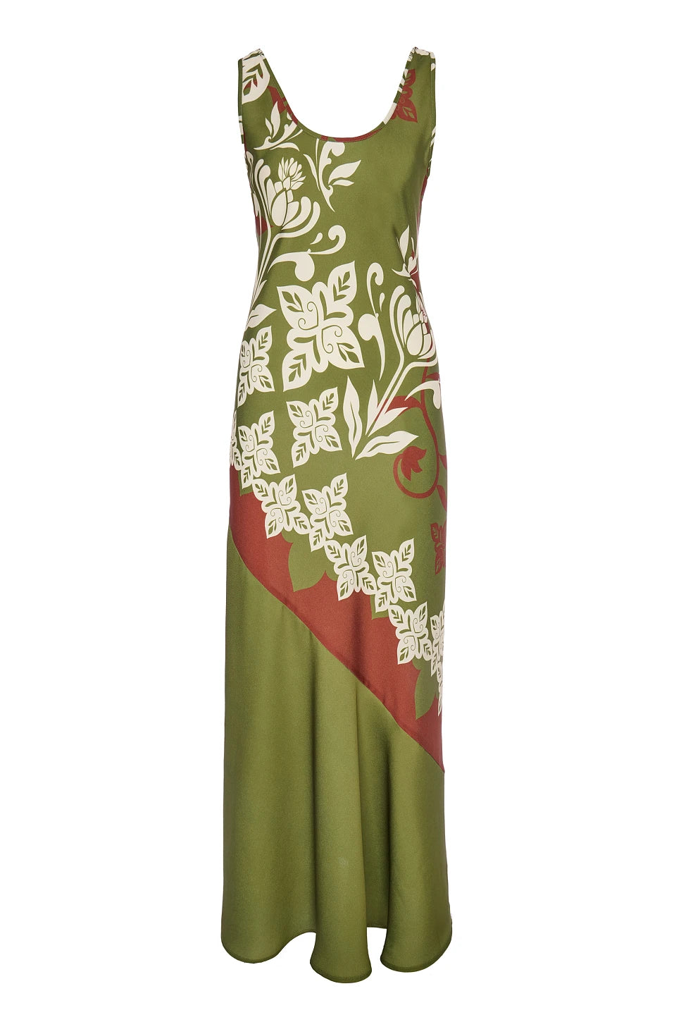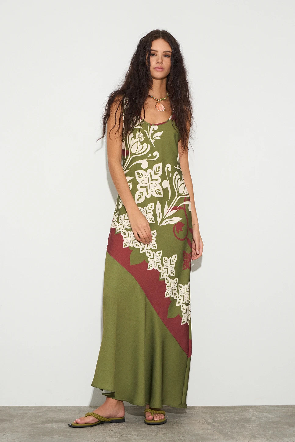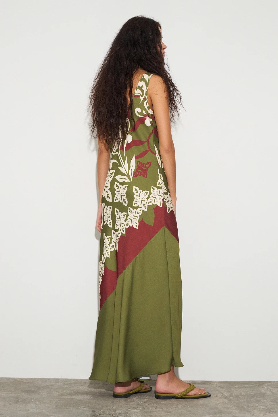 Maxi dress, sleeveless, with round neckline, printed, regular fit, satin texture