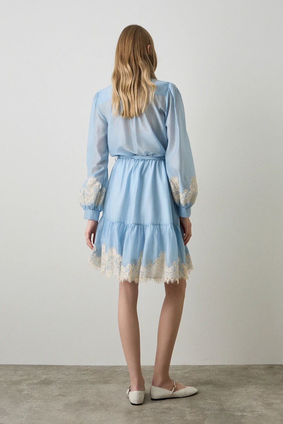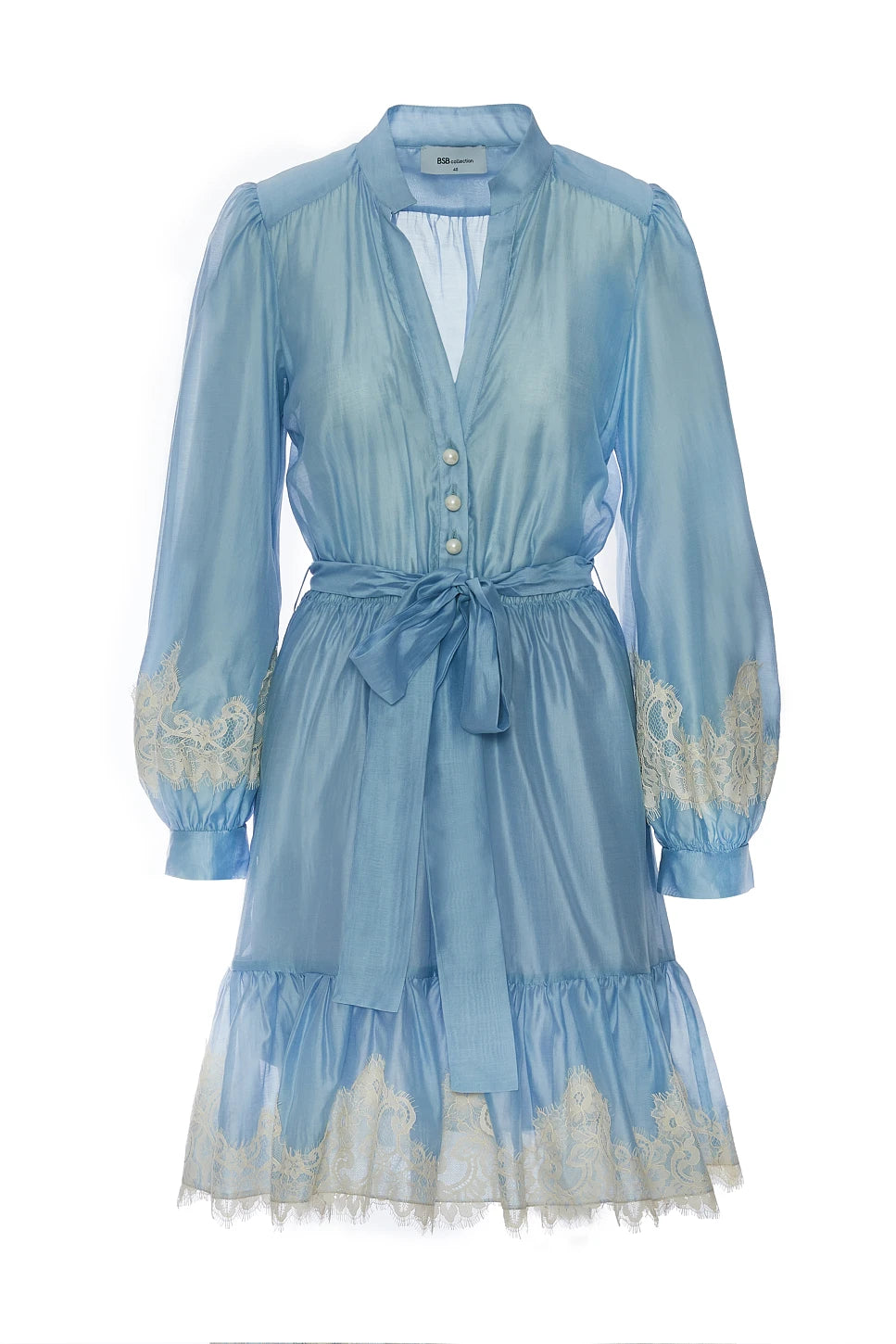 Mini dress, with long sleeves, V neckline, with buttons on the bustier, self-tie fastening on the waist, lace details, regular fit, soft touch