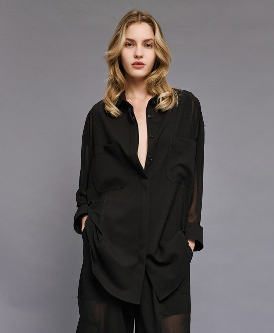 Oversized mouslin shirt with long sleeves. It features a collar and front patch pockets. Pair it with the matching pants from our collection for striking looks.