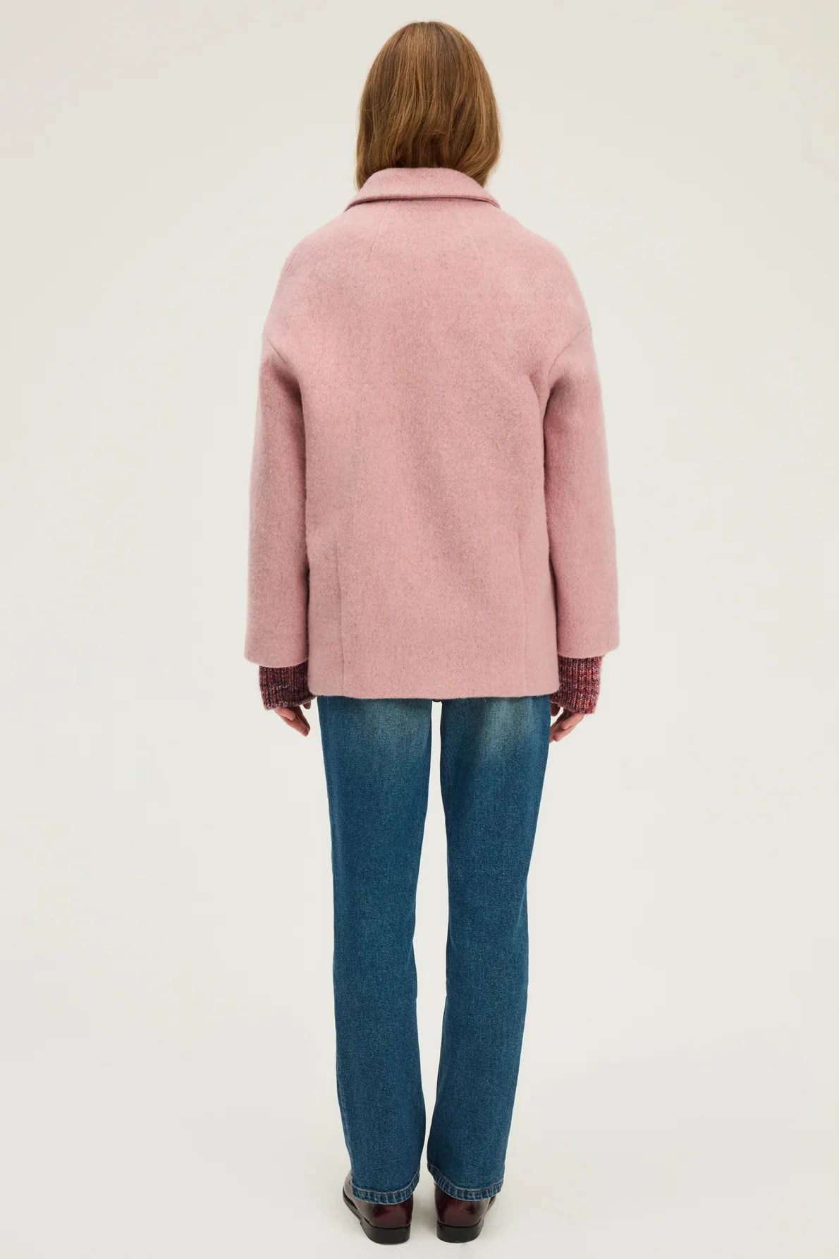 A contemporary feel defines this short, dropped-shoulder coat in virgin wool. Woven in twill with diagonal ribbing, it comes in a very soft pink.