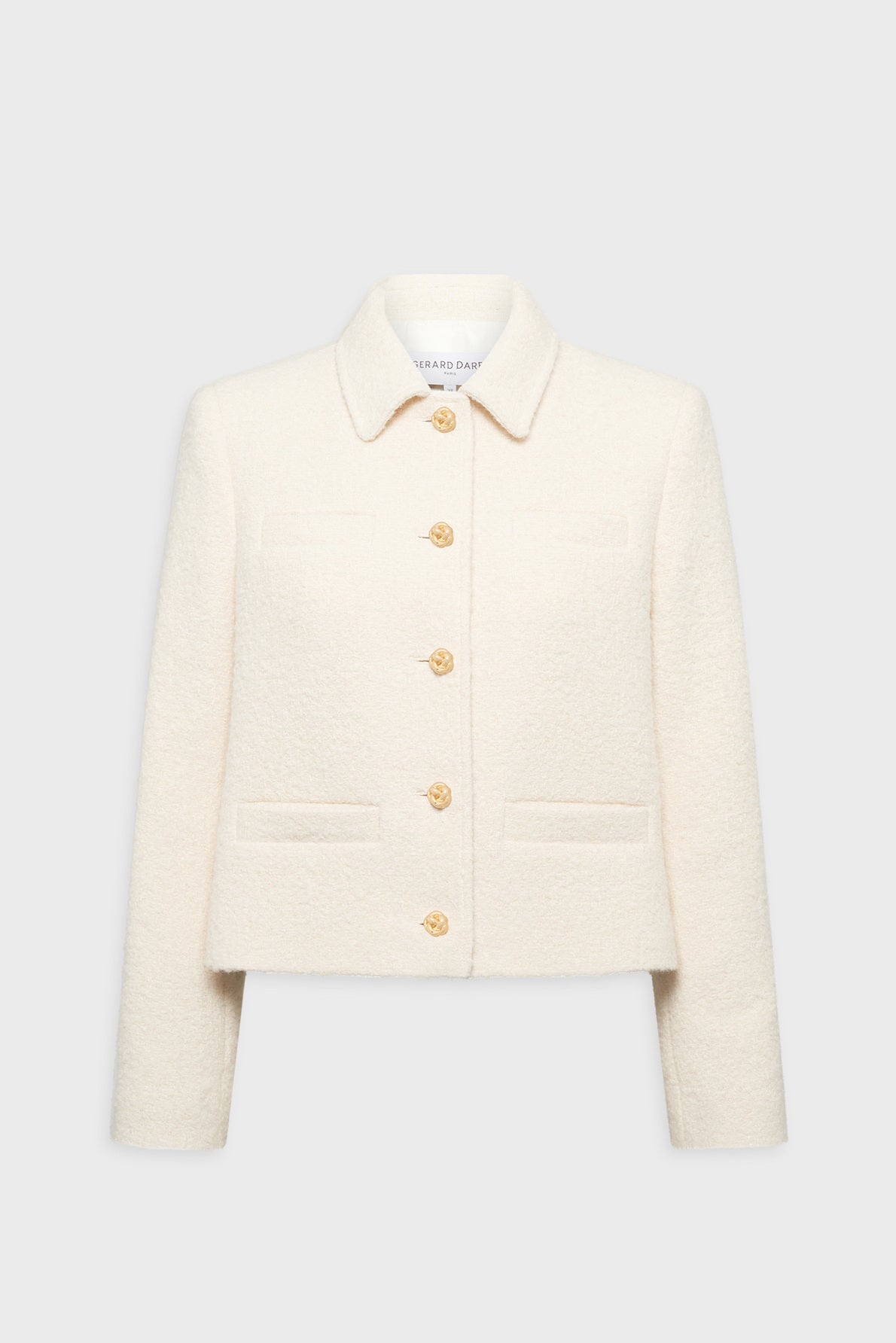 Plain tweed short jacket with gold buttons Wear with suit pants for a classic look or jeans for a contrasting casual-chic style. Cotton and wool blend.