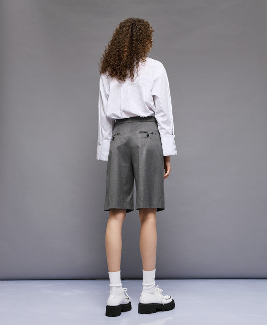 High-waist bermuda shorts with pleats and side pockets. Featuring a front zip closure and decorative welt pockets at the back. An ideal choice for modern and sophisticated office looks.