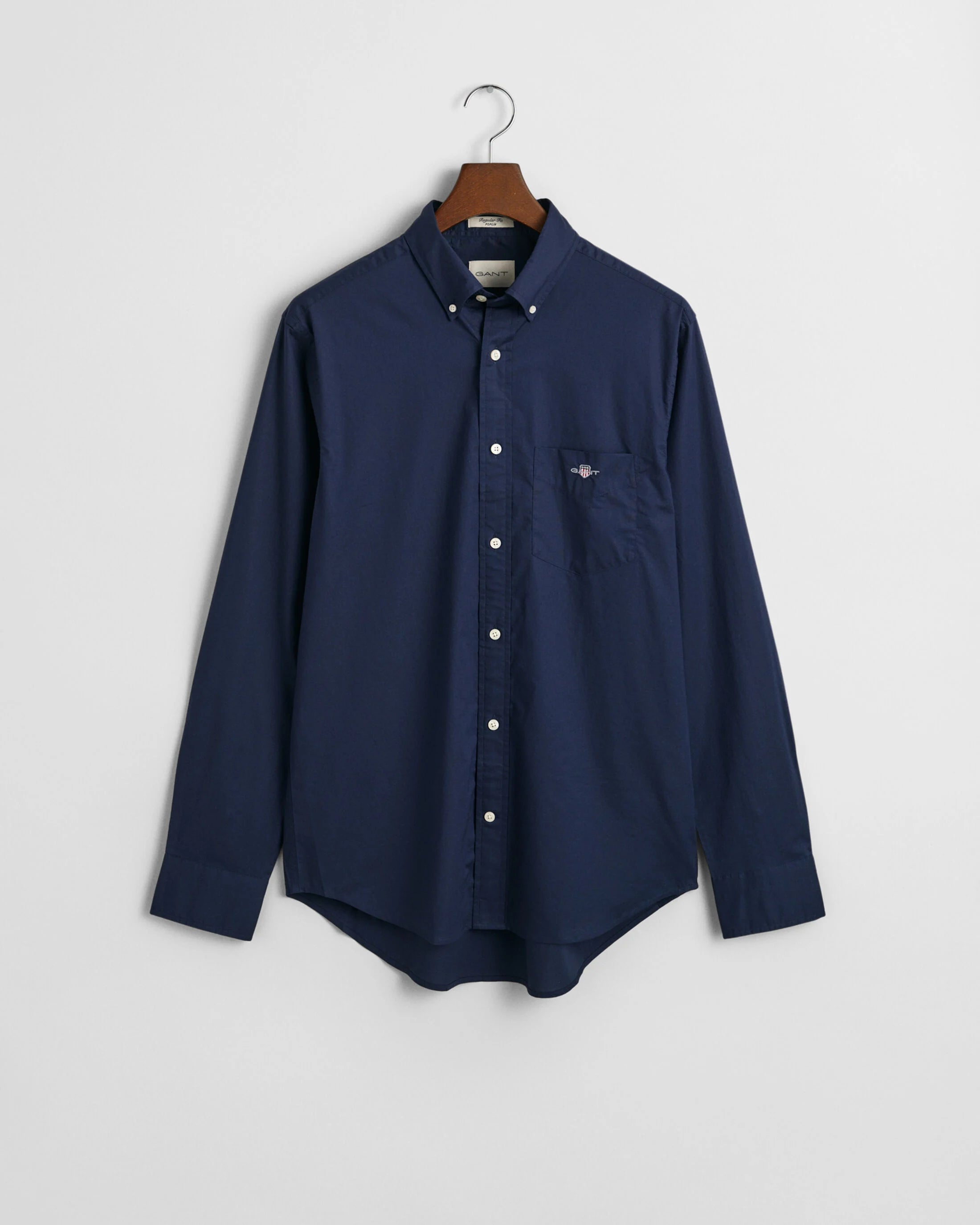 Crafted in a durable poplin weave, this classic shirt is essential to any preppy wardrobe. The design features an '80s-inspired GANT shield graphic embroidered at the chest pocket and a curved hem.