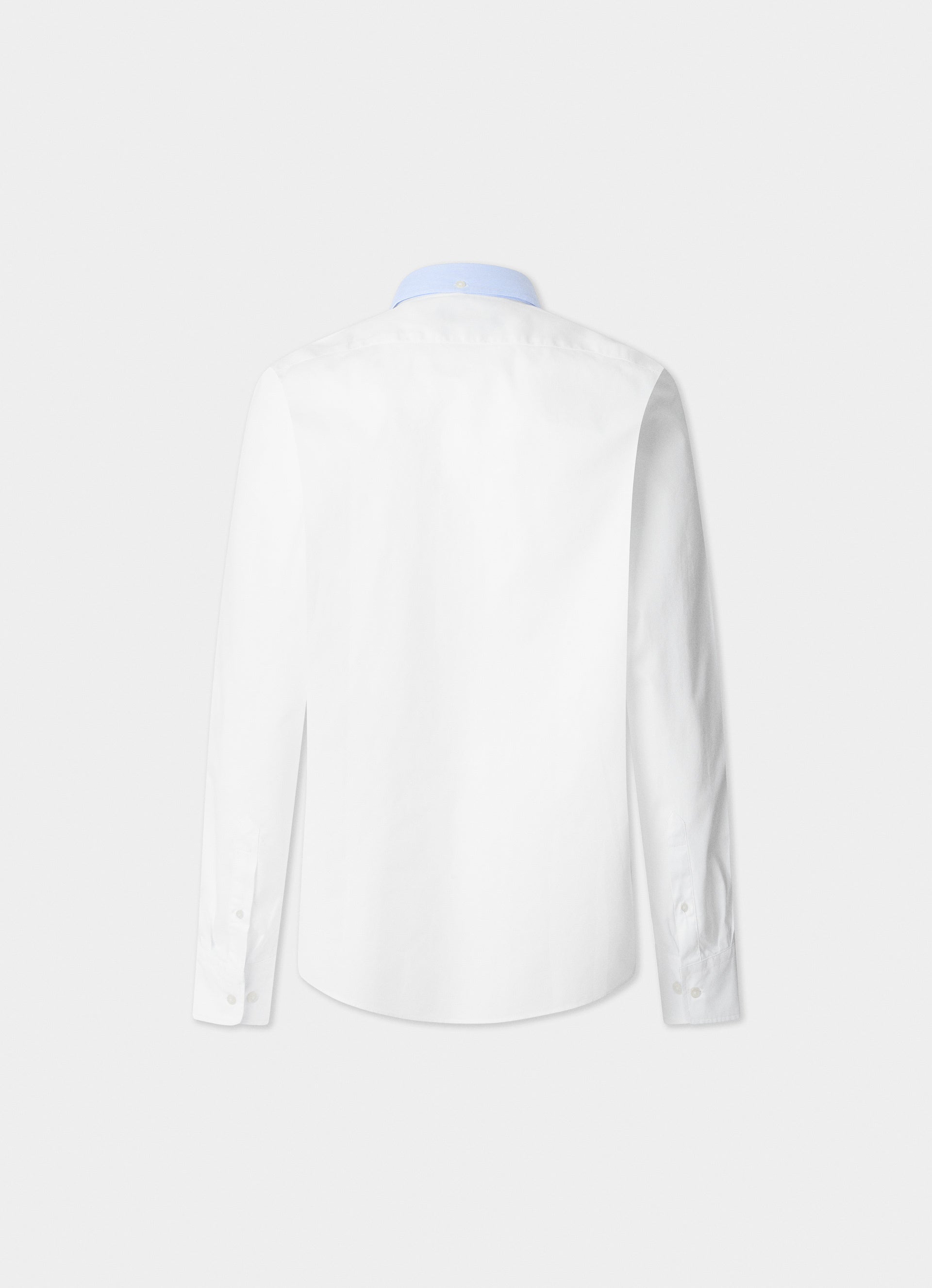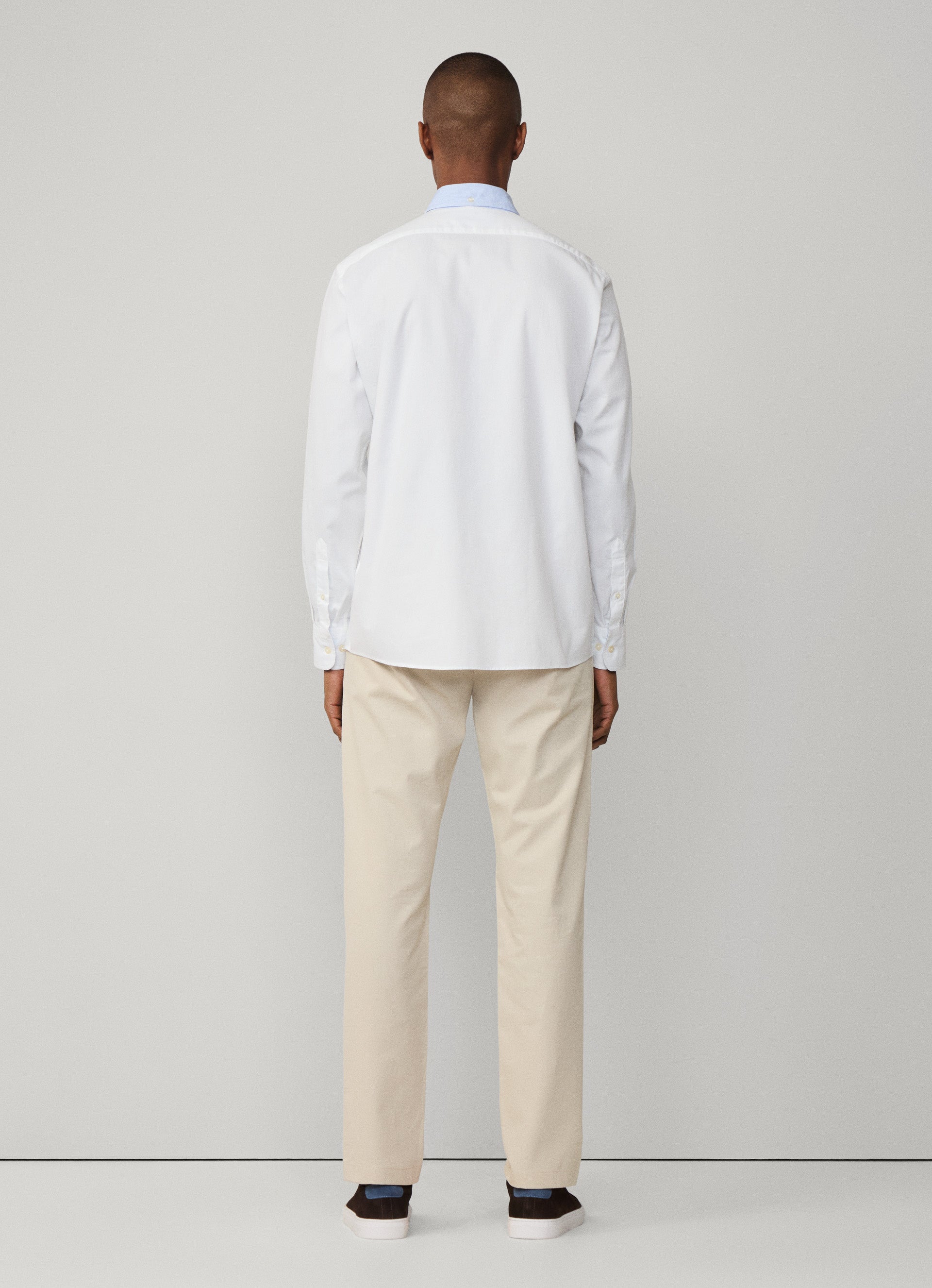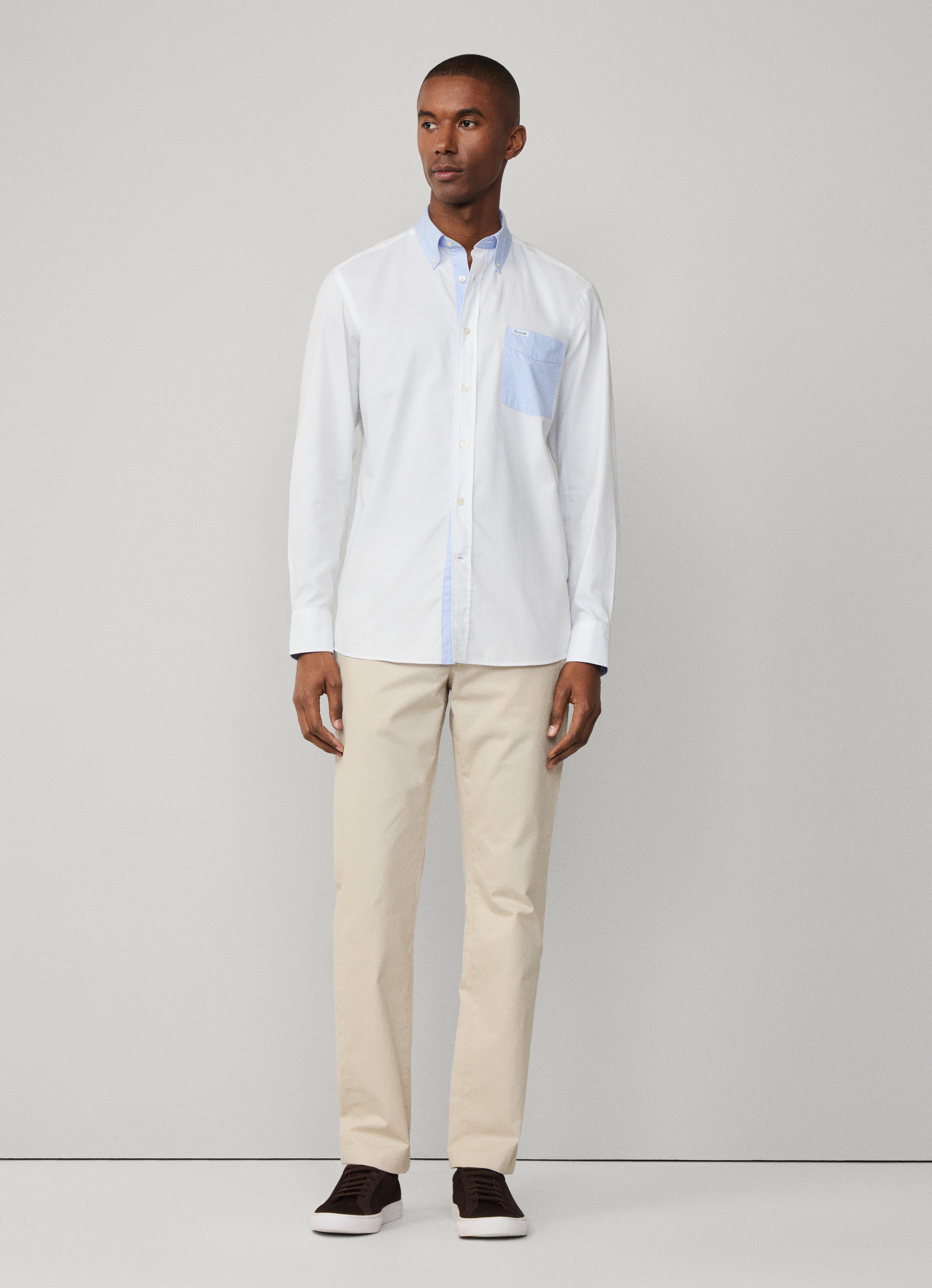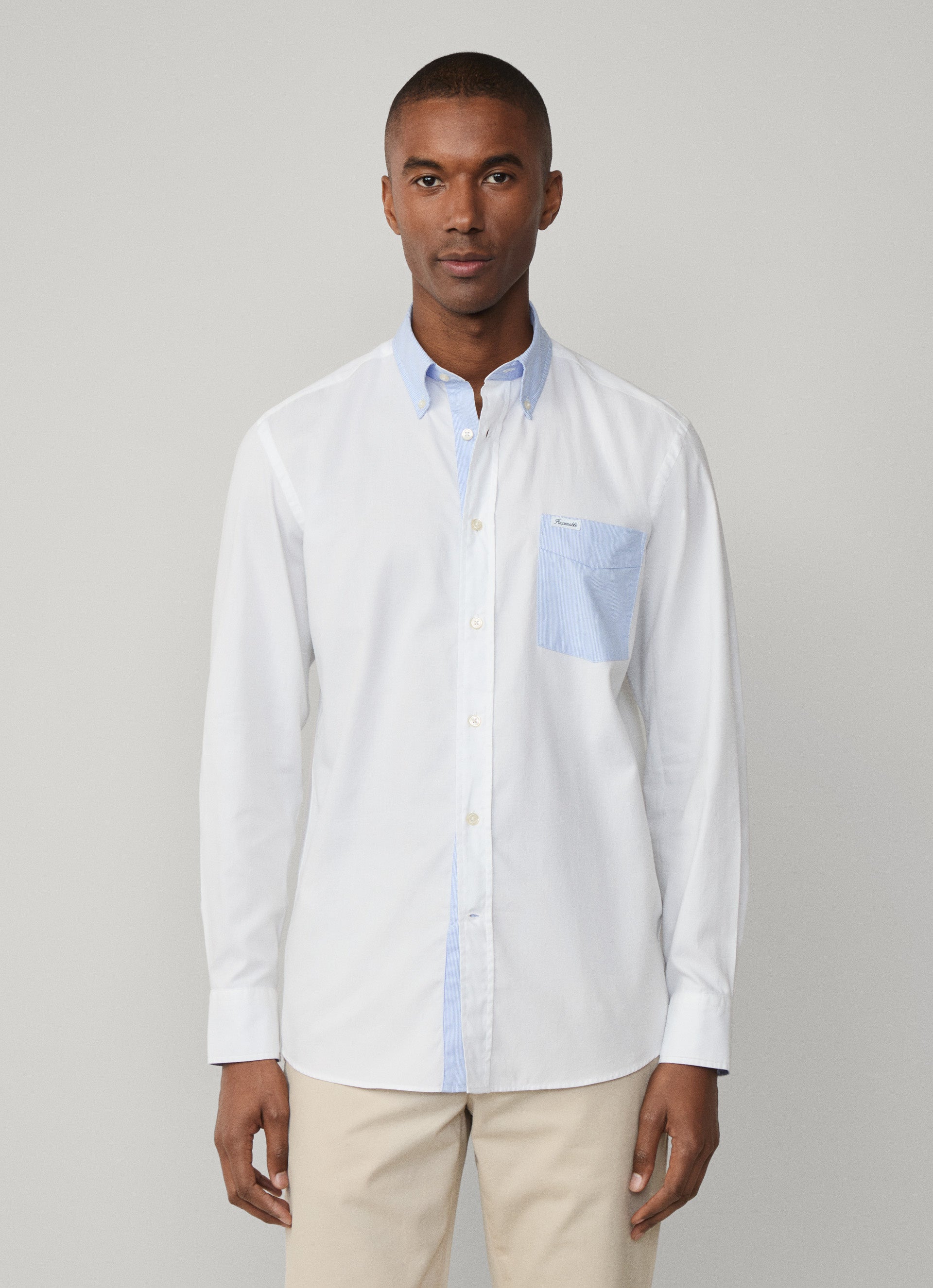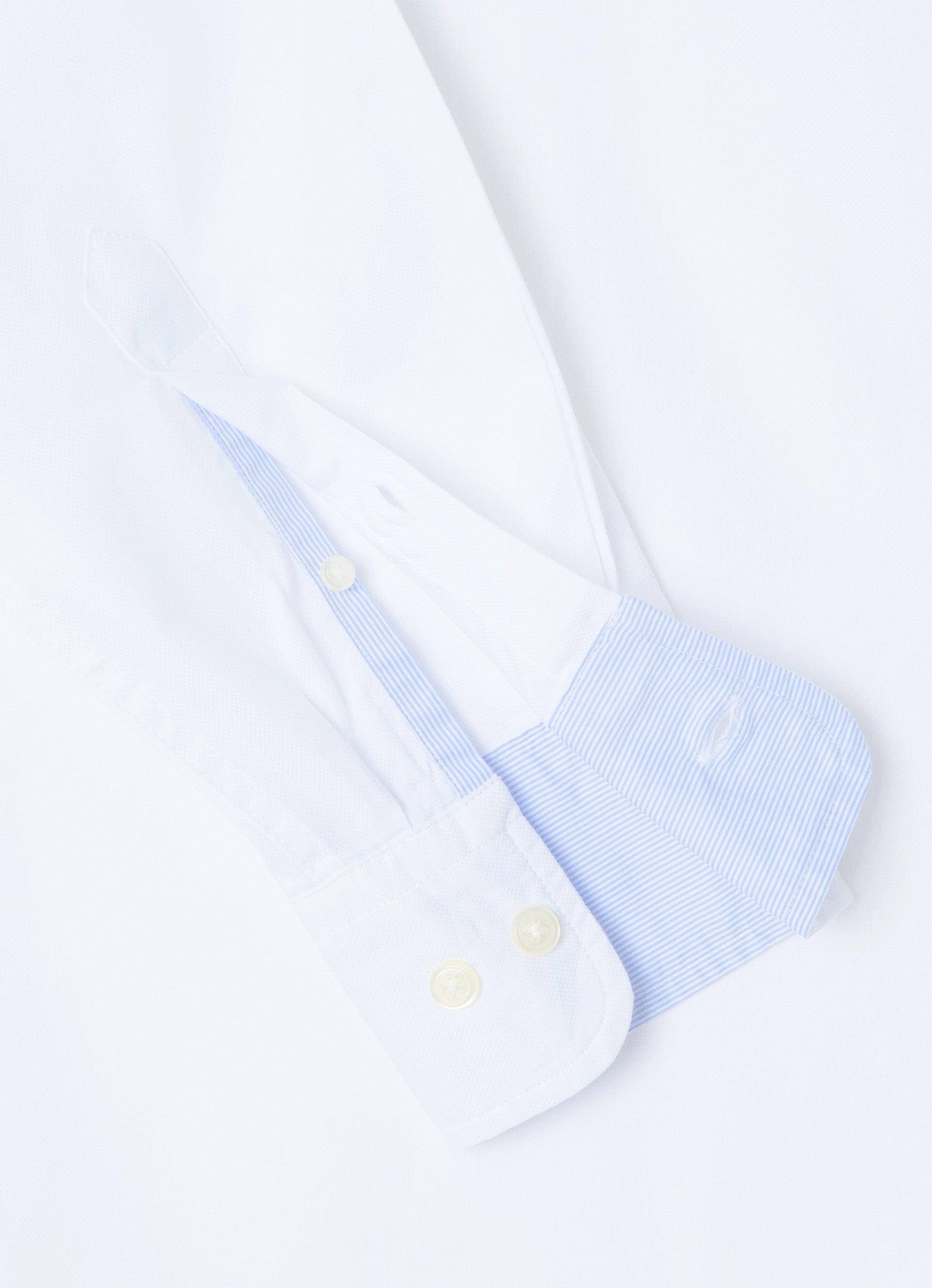 - Contrasting striped twill on the collar, pocket and inside placket.