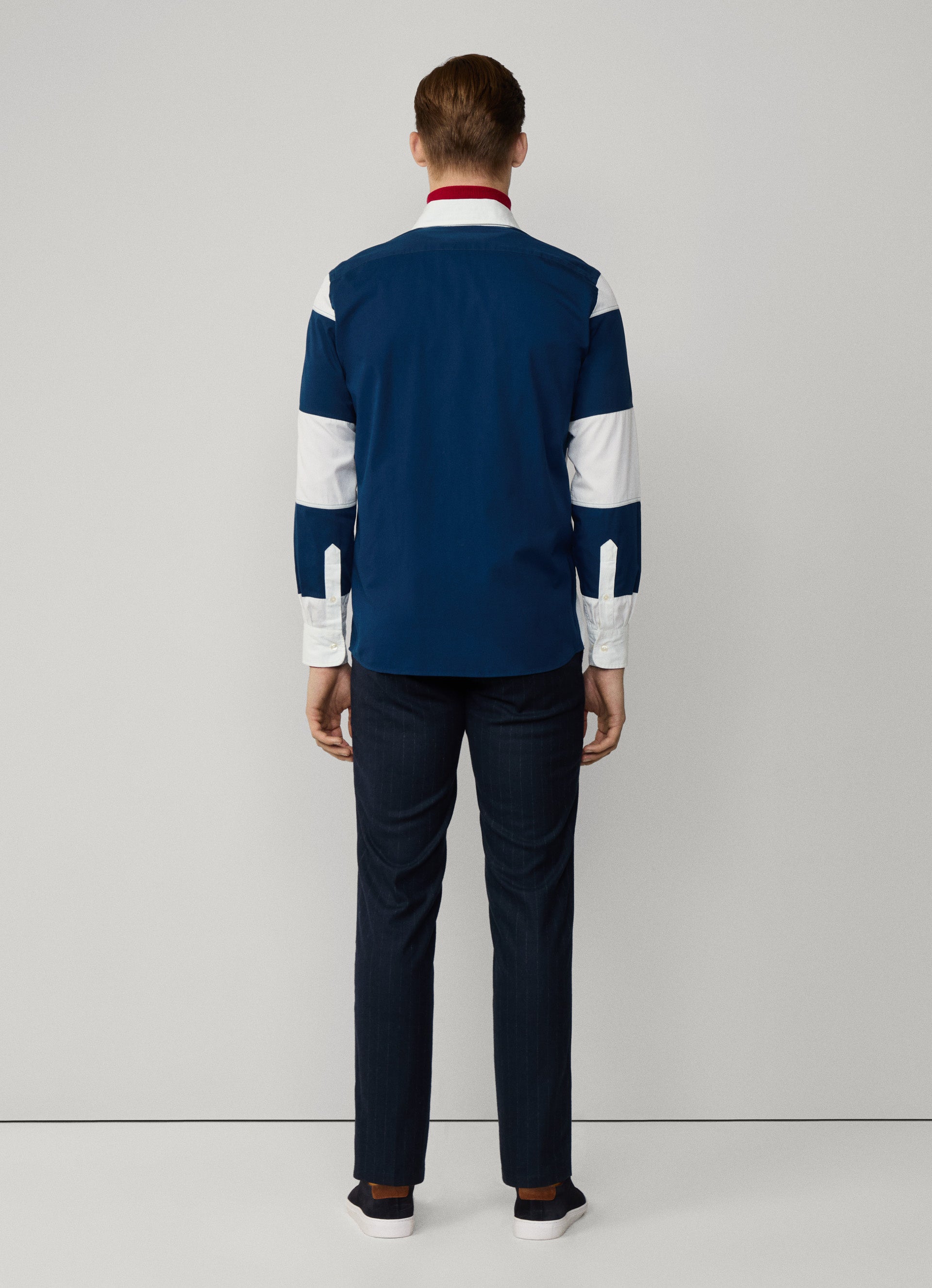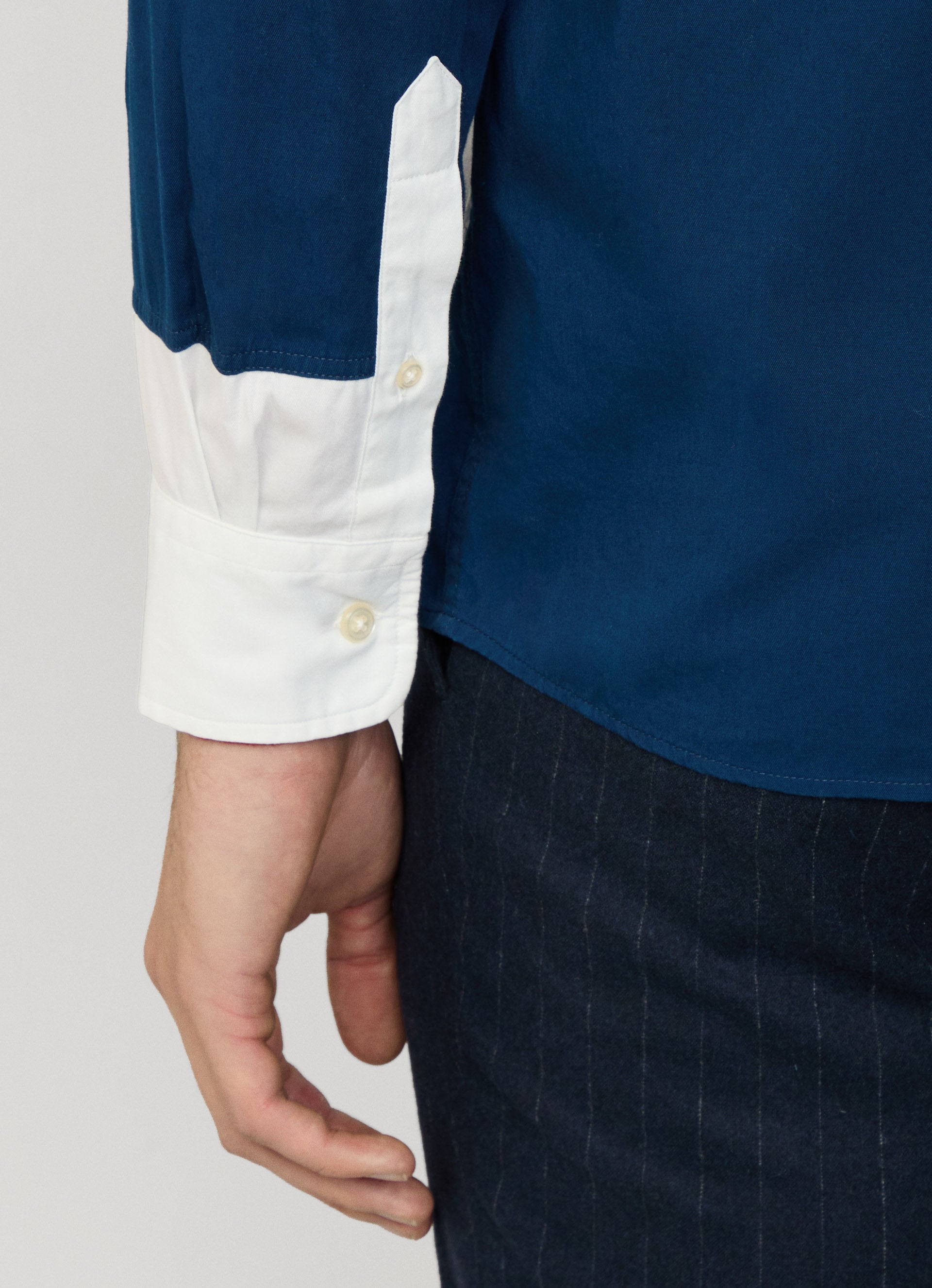 - Back yoke and inside button placket in cotton chambray fabric.