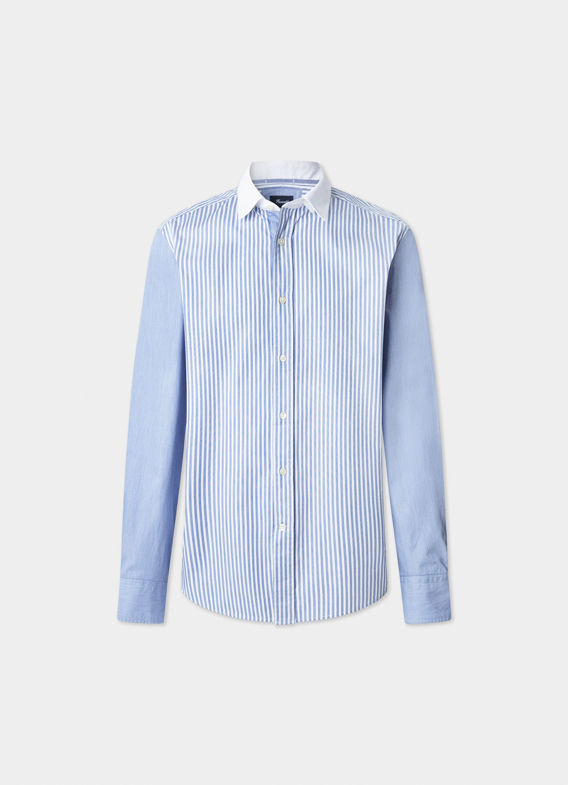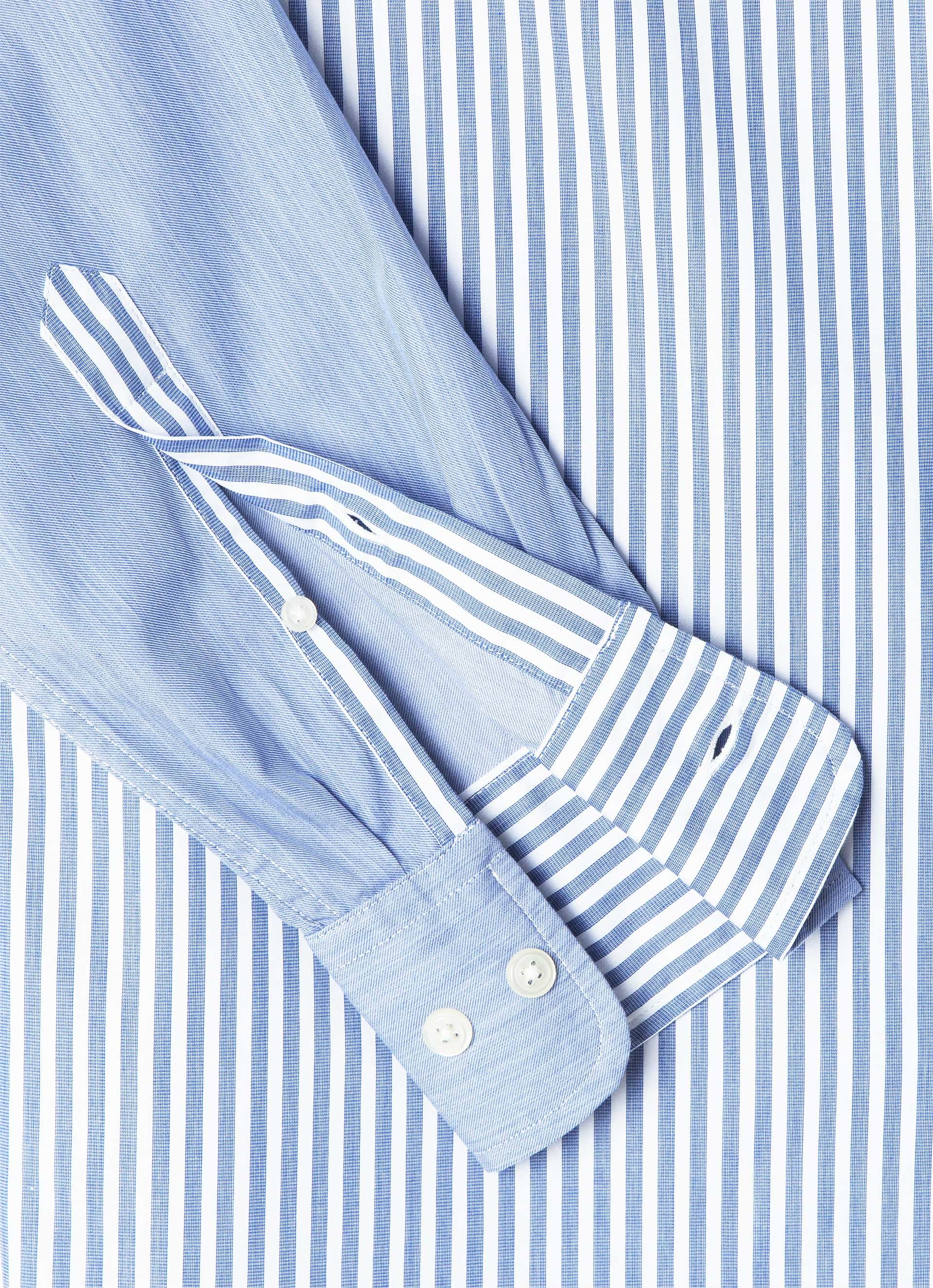 - Front, shoulders, inside cuffs and sleeve plackets in candy stripe twill.