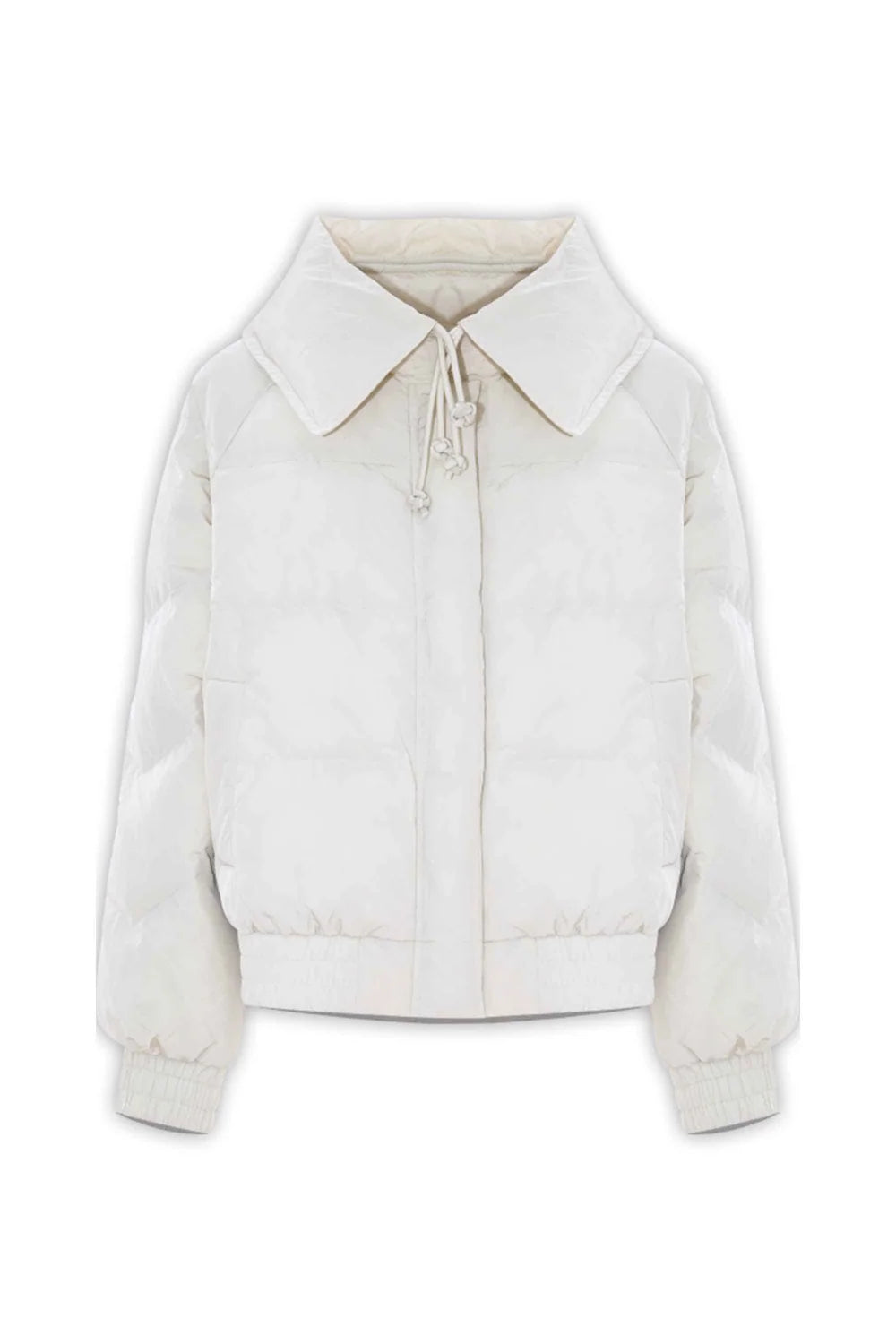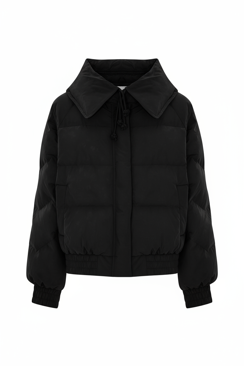 Casual chic, puffer-style quilted short coat, long sleeves, concealed zip closure, oversized collar with twin drawstrings, elasticated waist and cuffs