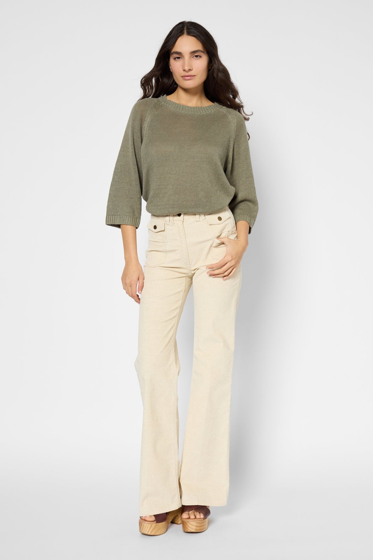 100% linen loose V-neck sweater for a casual look. Khaki color for a trendy style. Ideal for spring into summer.