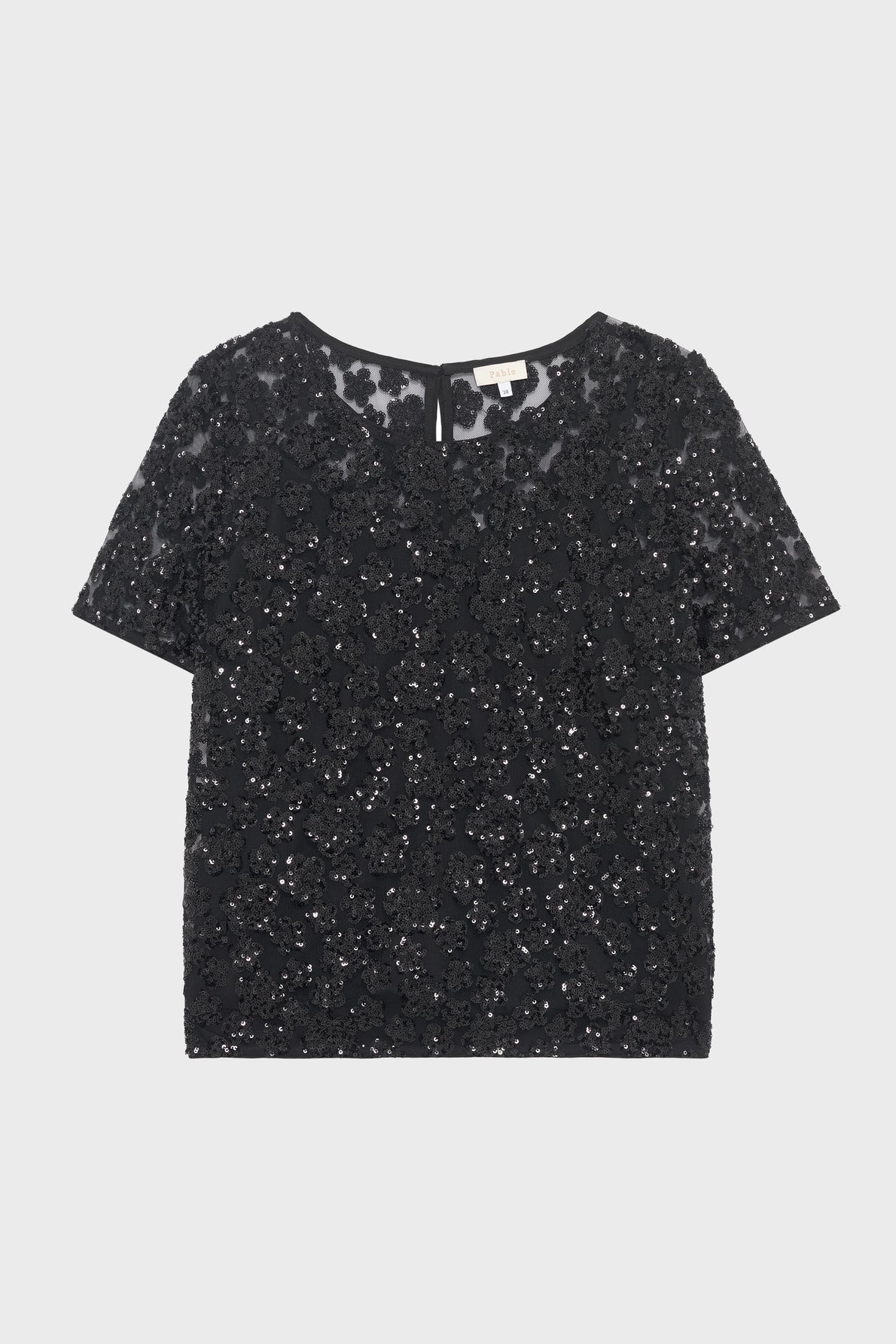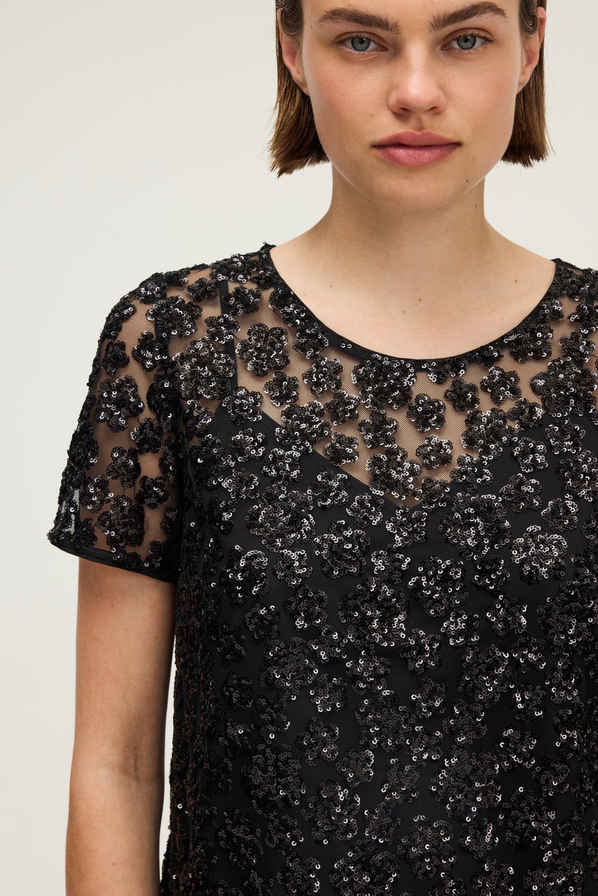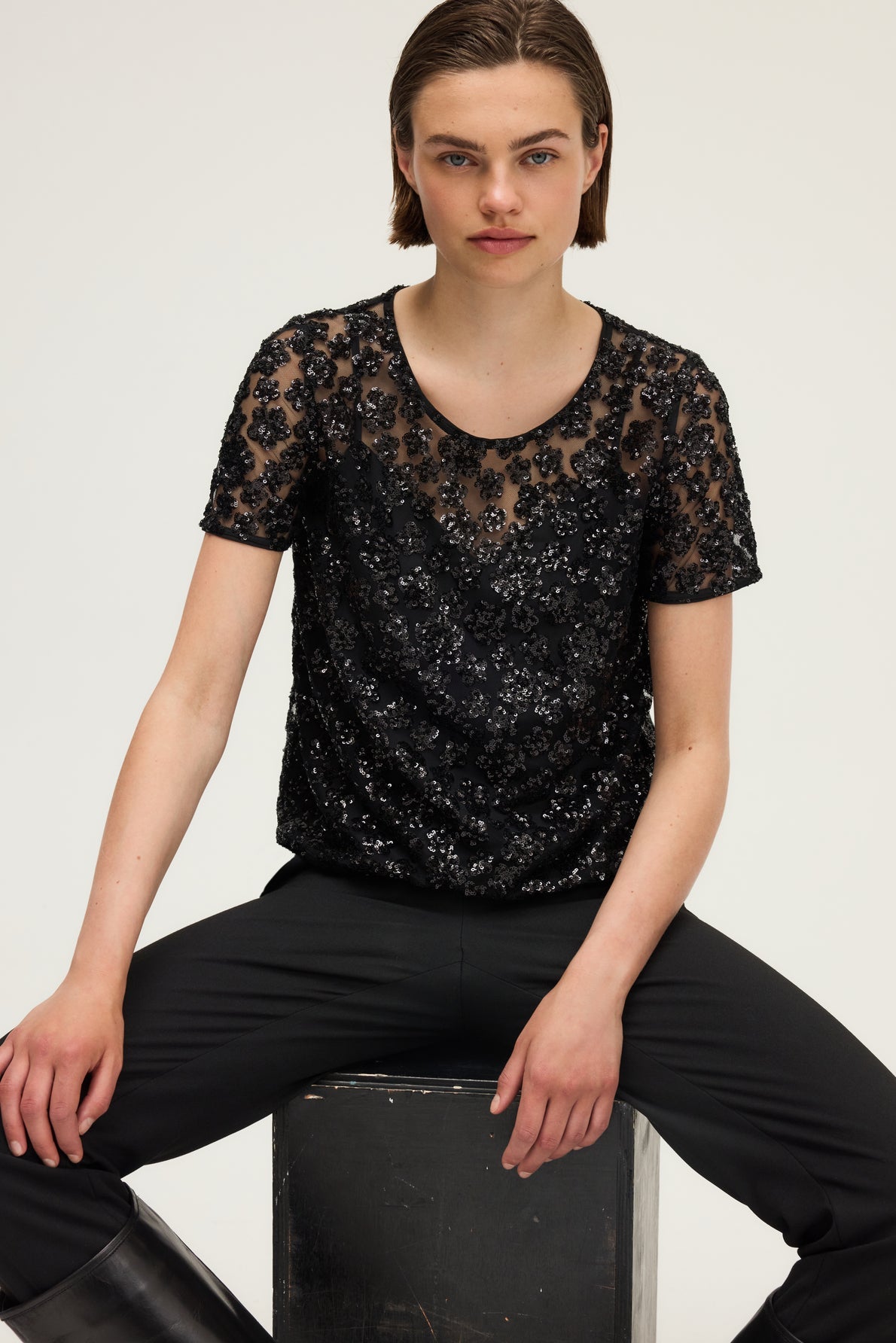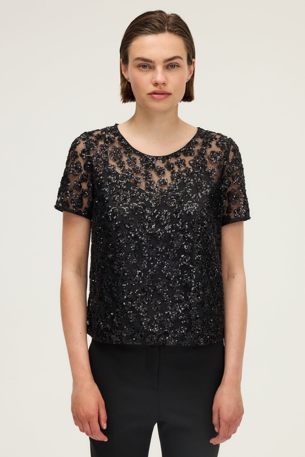 A chic and festive feel for this top adorned with black sequined flowers embroidered on tulle. Wear it without the tank top for a sheer look.