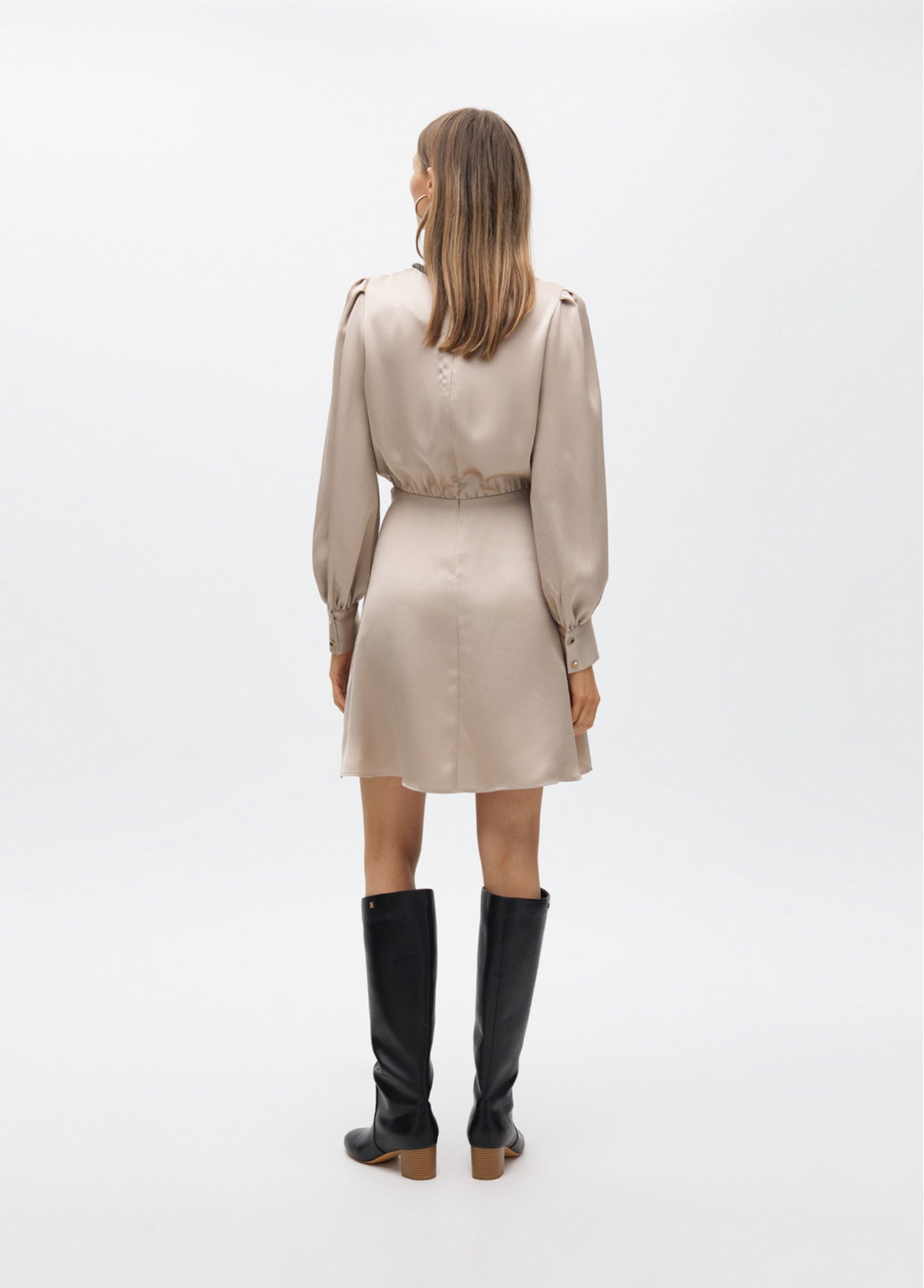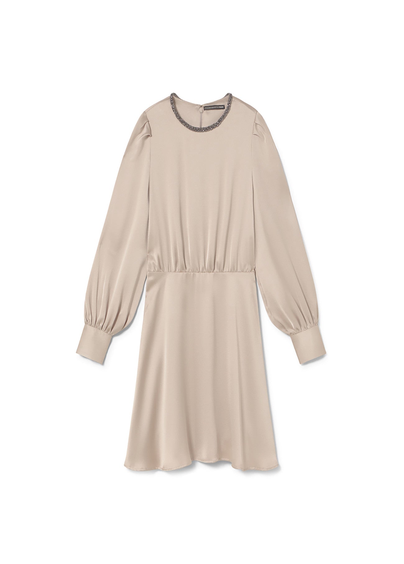 Elegant short satin dress with jewel detail on the neckline. Long puffed sleeves and button closure at the back. Fluid and feminine cut, perfect for special events. Soft inner lining for added comfort.