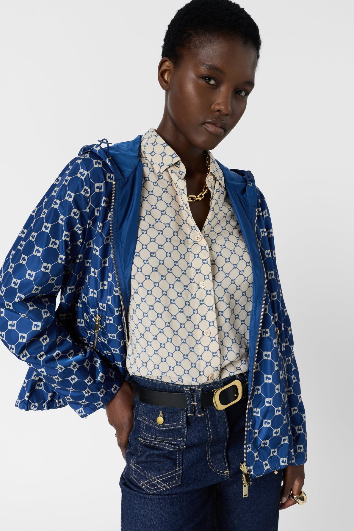 This parka reimagines the windbreaker jacket with its ecru monogram on a blue background and its golden zippers. An ideal outerwear garment for mid-season, combining utility with elegance.