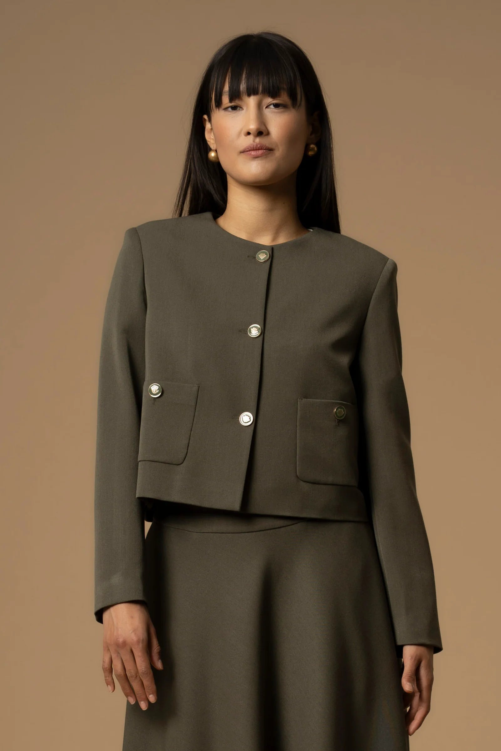 Sophisticated and elegant, clean lines, round neck, short jacket, triple ornate button closure, twin front pockets, tailored edging