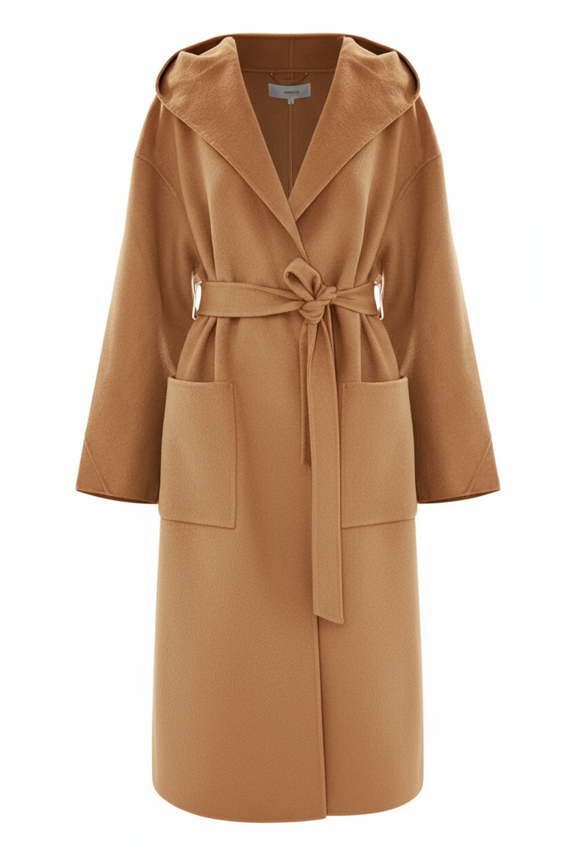 Chic sophisticated full length coat from Pure Verve Capsule collection, hooded with wide lapels, color coordinated wrap around belt