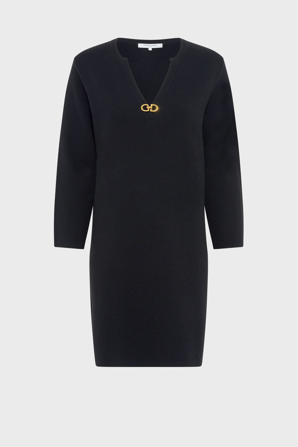 Black Milano knit dress with gold-tone GD at the neckline for sleek elegance and sophistication. Made from a wool blend.